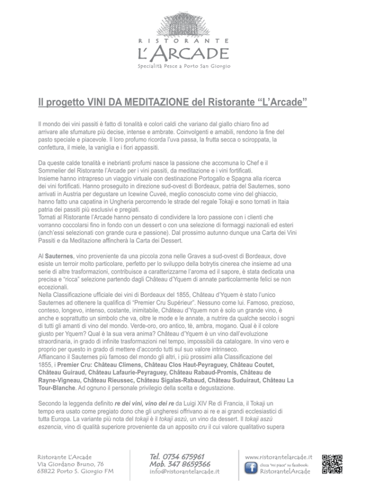 Specialità Pesce a Porto San Giorgio Il progetto VINI DA MEDITAZIONE del Ristorante “L’Arcade” Il mondo dei vini passiti è fatto di tonalità e colori caldi che variano dal giallo chiaro fino ad arrivare alle sfumature più decise, intense e ambrate. Coinvolgenti e amabili, rendono la fine del pasto speciale e piacevole. Il loro profumo ricorda l’uva passa, la frutta secca o sciroppata, la confettura, il miele, la vaniglia e i fiori appassiti. Da queste calde tonalità e inebrianti profumi nasce la passione che accomuna lo Chef e il Sommelier del Ristorante l’Arcade per i vini passiti, da meditazione e i vini fortificati. Insieme hanno intrapreso un viaggio virtuale con destinazione Portogallo e Spagna alla ricerca dei vini fortificati. Hanno proseguito in direzione sud-ovest di Bordeaux, patria del Sauternes, sono arrivati in Austria per degustare un Icewine Cuveé, meglio conosciuto come vino del ghiaccio, hanno fatto una capatina in Ungheria percorrendo le strade del regale Tokaji e sono tornati in Itaia patria dei passiti più esclusivi e pregiati. Tornati al Ristorante l’Arcade hanno pensato di condividere la loro passione con i clienti che vorranno coccolarsi fino in fondo con un dessert o con una selezione di formaggi nazionali ed esteri (anch’essi selezionati con grande cura e passione). Dal prossimo autunno dunque una Carta dei Vini Passiti e da Meditazione affincherà la Carta dei Dessert. Al Sauternes, vino proveniente da una piccola zona nelle Graves a sud-ovest di Bordeaux, dove esiste un terroir molto particolare, perfetto per lo sviluppo della botrytis cinerea che insieme ad una serie di altre trasformazioni, contribuisce a caratterizzarne l’aroma ed il sapore, è stata dedicata una precisa e “ricca” selezione partendo dagli Château d’Yquem di annate particolarmente felici se non eccezionali. Nella Classificazione ufficiale dei vini di Bordeaux del 1855, Château d’Yquem è stato l’unico Sauternes ad ottenere la qualifica di “Premier Cru Supérieur”. Nessuno come lui. Famoso, prezioso, conteso, longevo, intenso, costante, inimitabile, Château d’Yquem non è solo un grande vino, è anche e soprattutto un simbolo che va, oltre le mode e le annate, a nutrire da qualche secolo i sogni di tutti gli amanti di vino del mondo. Verde-oro, oro antico, tè, ambra, mogano. Qual è il colore giusto per Yquem? Qual è la sua vera anima? Château d’Yquem è un vino dall’evoluzione straordinaria, in grado di infinite trasformazioni nel tempo, impossibili da catalogare. In vino vero e proprio per questo in grado di mettere d’accordo tutti sul suo valore intrinseco. Affiancano il Sauternes più famoso del mondo gli altri, i più prossimi alla Classificazione del 1855, i Premier Cru: Château Climens, Château Clos Haut-Peyraguey, Château Coutet, Château Guiraud, Château Lafaurie-Peyraguey, Château Rabaud-Promis, Château de Rayne-Vigneau, Château Rieussec, Château Sigalas-Rabaud, Château Suduiraut, Château La Tour-Blanche. Ad ognuno il personale privilegio della scelta e degustazione. Secondo la leggenda definito re dei vini, vino dei re da Luigi XIV Re di Francia, il Tokaji un tempo era usato come pregiato dono che gli ungheresi offrivano ai re e ai grandi ecclesiastici di tutta Europa. La variante più nota del tokaji è il tokaji aszú, un vino da dessert. Il tokaji aszú eszencia, vino di qualità superiore proveniente da un apposito cru il cui valore qualitativo supera Ristorante L’Arcade Via Giordano Bruno, 76 63822 Porto S. Giorgio FM Tel. 0734 675961 Mob. 347 8659366 [email protected] www.ristorantelarcade.it clicca “mi piace” su facebook: RistorantelArcade Specialità Pesce a Porto San Giorgio l’espressione dei puttonyos, è molto raro. Preparato con acini appassiti, attaccati dalla muffa nobile è il prodotto del mosto denso che cola dal peso degli acini, messo poi a fermentare per diversi anni in appositi boccioni di vetro prima di essere imbottigliato e commercializzato. Noi lo abbiamo selezionati perchè i nostri clienti si sentano dei re degustando il re del vino! I vini liquorosi o vini fortificati sono prodotti utilizzando un vino base (di gradazione alcolica non inferiore a 12%) addizionato di mistella (mosto al quale è stata bloccata la fermentazione mediante aggiunta di alcol), alcol, acquavite di vino, al fine di aumentarne la gradazione alcolica. Lo scopo della fortificazione era quello di conservare i vini durante i lunghi viaggi in nave dal luogo di produzione alla destinazione finale (generalmente l’Inghilterra); infatti l’aggiunta di alcol nel vino consentiva di bloccare la fermentazione e favoriva la stabilizzazione del liquido. La selezione è stata fatta cercando ciò che meglio rappresenta i vini fortificati per soddisfare, o almeno pensando di soddisfare, ogni desiderio, gusto, curiosità dei nostri clienti: * Il Porto (Duero-Portogallo) si ottiene aggiungendo al mosto del brandy. Ci sono diverse categorie di Porto che variano in base agli anni di invecchiamento, alle uve più o meno pregiate scelte per il mosto ed infine il Vintage, prodotto di più alta qualità, ottenuto utilizzando uve selezionate e solo di una particolare annata. * Il Marsala, (Marsala-Italia) si ottiene aggiungendo alcol al vino (principalmente dai vitigni Grillo, Inzolia e Catarratto); può essere secco, semisecco o dolce. Le varie classificazioni, da Fine a Stravecchio o Riserva, si ottengono in base agli anni di invecchiamento e gradi alcolici. * Il Madeira (Madeira-Portogallo) viene prodotto nell’omonima isola, aggiungendo al vino alcol di canna da zucchero; il liquido viene sottoposto a forti oscillazioni termiche (tali da simulare i lunghi viaggi in nave che il vino faceva per essere trasportato in Inghilterra), e può essere in ordine crescente di qualità. Il Madeira esiste anche millesimato, e può conservarsi per decine di anni. * Il Malaga è ottenuto con le varietà “Pedro Ximén” e/o “Moscatel” in base a