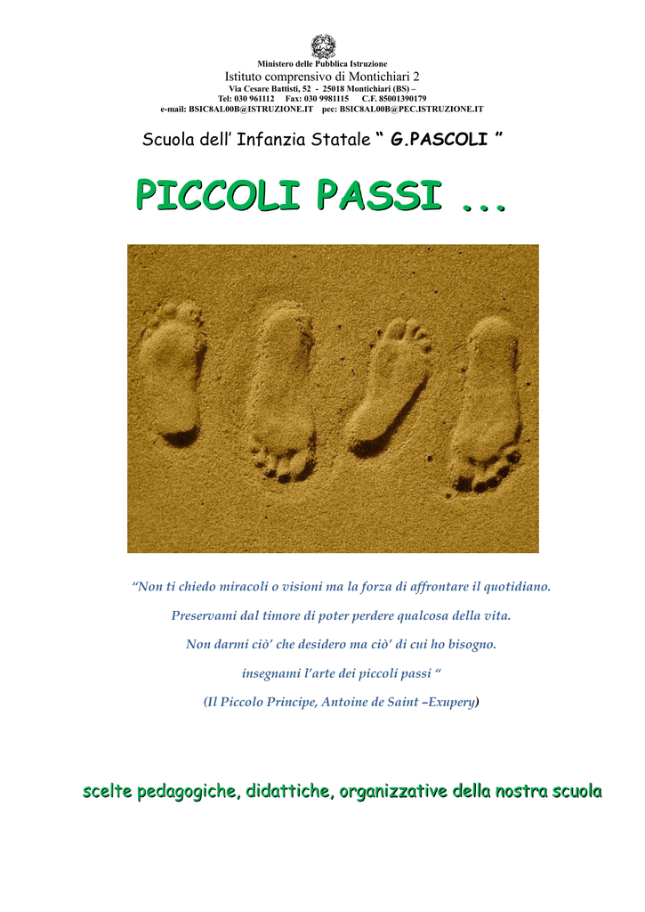 Ministero delle Pubblica Istruzione Istituto comprensivo di Montichiari 2 Via Cesare Battisti, 52 - 25018 Montichiari (BS) – Tel: 030 961112 Fax: 030 9981115 C.F. 85001390179 e-mail: [email protected] pec: [email protected] Scuola dell’ Infanzia Statale “ G.PASCOLI ” PICCOLI PASSI ... “Non ti chiedo miracoli o visioni ma la forza di affrontare il quotidiano. Preservami dal timore di poter perdere qualcosa della vita. Non darmi ciò’ che desidero ma ciò’ di cui ho bisogno. insegnami l’arte dei piccoli passi “ (Il Piccolo Principe, Antoine de Saint –Exupery) scelte pedagogiche, didattiche, organizzative della nostra scuola INDICE LA NOSTRA SCUOLA .......................................................................... 3 Lo stabile .................................................................................................................................................. 3 Organizzazione ........................................................................................................................................ 4 Gli SPAZI del gioco ................................................................................................................................ 5 Un AMBIENTE per apprendere ............................................................. 10 Quale BAMBINO? .. quale BAMBINA? .................................................... 11 Io sono, io so, io so fare! ..................................................................................................................... 13 Il PROGETTO EDUCATIVO ................................................................. 14 I LABORATORI .................................................................................................................................... 15 “BENVENUTI, BENTORNATI!” progetto inserimento/accoglienza ........................................ 18 Progetto Continuitá: dalla SCUOLA DELL’INFANZIA alla SCUOLA PRIMARIA................. 21 I.R.C.: INSEGNAMENTO della RELIGIONE CATTOLICA............................... 22 ATTIVITA’ ALTERNATIVA all’insegnamento della Religione Cattolica ................................. 22 Progetto: Integrazione della diversità “Un ponte verso l’altro” ............................................... 23 PROPOSTE DEL TERRITORIO: a Montichiari possiamo collaborare con ................... 25 VISITE DIDATTICHE sul territorio ....................................................... 26 FESTE: continuita’ educativa fra SCUOLA e FAMIGLIA................................. 27 Osservazione Valutazione Documentazione ................................................. 28 BUONA LETTURA! Pag. 2 LA NOSTRA SCUOLA Lo stabile La scuola dell’infanzia G. Pascoli situata in via Giovanni Pascoli n° 27, è stata costruita in due momenti diversi: una parte della struttura è sorta nel 1975 e accoglieva tre sezioni, l’altra è stata conclusa nel 2005 con l’aggiunta di due sezioni. Attualmente varcando il cancello della scuola, si accede ad un ampio giardino, fornito di sabbiere e giochi in legno, che circonda tutto l'edificio ed al quale si accede da tutte cinque le sezioni. Passando dall’ingresso principale, si entra nel primo salone sul quale si affacciano: tre sezioni, una stanza per il personale ausiliario , una per le insegnanti, un bagno per gli adulti e l’accesso al seminterrato utilizzato come magazzino. La zona cucina, attiva per la mensa interna fino al 2012, è ora utilizzata per lo smistamento dei pasti cucinati e trasportati da una ditta esterna. Continuando lungo il corridoio si accede al secondo salone sul quale si affacciano altre due sezioni , tre laboratori e un bagno per adulti disabili . Tutte le sezioni hanno l’accesso diretto ai propri bagni strutturati in modo tale da consentire lo sviluppo dell’autonomia di ogni singolo bambino. I saloni costituiscono anche un prolungamento delle sezioni, pertanto sono strutturati con aree di gioco alle quali i bambini si accostano sorvegliati dalle insegnanti. Le 5 sezioni sono distinte da simboli facilmente riconoscibili dai bambini. sezione A aquilotti sezione B pulcini sezione C pesciolini sezione D delfini sezione E coccinelle Pag. 3 Organizzazione Le sezioni sono eterogenee per: genere (maschi/femmine) fasce d'età (3/4/5 anni) etnia di provenienza ( in prevalenza europea, africana, asiatica) Ciascuna sezione può accogliere fino a un massimo di 28 iscritti, solo con la presenza di bambini/e diversamente abili certificati, il numero diminuisce a 25 iscritti. La scuola é operativa grazie al contributo lavorativo di diverse figure, che attraverso le loro mansioni specifiche, consentono il buon funzionamento del servizio: 2 insegnanti di sezione (ciascuna con 25h. settimanali) 1 insegnante di I.R.C. (Insegnamento Religione Cattolica), qualora l'insegnante di sezione non avesse l'abilitazione all'I.R.C. 1 insegnante di sostegno in presenza di un bambino/a diversamente abile. 1 operatore educativo, qualora la disabilità lo richieda. 1 assistente comunale per l'ingresso anticipato (7,30'-8,00') 2 collaboratori scolastici statali (A.T.A.) 1 appalto per le pulizie 1 appalto comunale per il servizio mensa Pag. 4 Gli SPAZI del gioco “Lo spazio dovrà essere accogliente, caldo, ben curato, orientato dal gusto estetico, espressione della pedagogia e delle scelte educative di ciascuna scuola. Lo spazio parla dei bambini, del loro valore, dei loro bisogni di gioco, di movimento, di espressione, di intimità e di socialità, attraverso l’ambientazione fisica, la scelta di arredamenti e oggetti volti a creare un luogo funzionale e invitante ”. (Indicazioni Nazionali per il curricolo 2012) L’organizzazione delle sezioni e degli altri spazi comuni è stata pensata e sperimentata, per poter meglio rispondere ai bisogni dei bambini e alle esigenze organizzative, che nel tempo si possono evolvere e modificare. La strutturazione intenzionale degli spazi, soprattutto nella scuola dell'infanzia, è qu