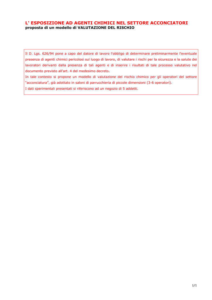 L' ESPOSIZIONE AD AGENTI CHIMICI NEL SETTORE ACCONCIATORI proposta di un modello di VALUTAZIONE DEL RISCHIO Il D. Lgs. 626/94 pone a capo del datore di lavoro l'obbligo di determinare preliminarmente l'eventuale presenza di agenti chimici pericolosi sul luogo di lavoro, di valutare i rischi per la sicurezza e la salute dei lavoratori derivanti dalla presenza di tali agenti e di inserire i risultati di tale processo valutativo nel documento previsto all'art. 4 del medesimo decreto. In tale contesto si propone un modello di valutazione del rischio chimico per gli operatori del settore “acconciatura”, già adottato in saloni di parrucchieria di piccole dimensioni (3-6 operatori). I dati sperimentali presentati si riferiscono ad un negozio di 5 addetti. 1/1 METODOLOGIA / CRITERI La metodologia seguita per la valutazione del rischio di esposizione ad agenti chimici si è sviluppata attraverso una fase preliminare di conoscenza della realtà lavorativa che ha previsto l'acquisizione di informazioni generali e la raccolta della documentazione ritenuta necessaria ai fini della sicurezza e dell' igiene del lavoro. Con la collaborazione di persone qualificate ed esperte, addette ai lavori, sono stati esaminati i seguenti aspetti: - ciclo di lavorazione e tecniche ad esso correlate; mansioni in essere e personale preposto allo svolgimento delle attività; sostanze e preparati chimici utilizzati e/o derivanti dalle attività lavorative. In una fase successiva di approfondimento sono stati focalizzati altri elementi significativi, quali: - grado di affluenza della clientela; tipologia delle prestazioni più richieste; consumi di prodotti cosmetici; tipo e durata dell' esposizione; gruppi di lavoratori ad esposizione equivalente; circostanze in cui viene svolto il lavoro in presenza degli agenti chimici. La mancata disponibilità delle schede di sicurezza dei prodotti cosmetici, la cui redazione è affidata alla discrezionalità del produttore poiché, come è noto, gli stessi esulano dal campo di applicazione della normativa in materia di classificazione, imballaggio ed etichettatura dei preparati pericolosi, ha indotto ad esaminare direttamente i vari formulati presenti nel salone, con l’obiettivo di rilevarne la composizione chimica e procedere, al momento della rielaborazione dei dati, allo studio dei singoli ingredienti. Considerando la vasta gamma di preparati disponibili l'indagine è stata necessariamente condotta su un campione di prodotti, rappresentativi delle varie categorie merceologiche riscontrate e di più largo impiego nel salone. Alla raccolta delle informazioni ha fatto seguito un'accurata ispezione del luogo di lavoro finalizzata a documentare ulteriormente la stessa realtà lavorativa. L'attenzione è stata rivolta, in particolare, alle caratteristiche del locale nel suo complesso e delle varie postazioni di lavoro, agli impianti e alle attrezzature presenti, alle modalità di svolgimento delle singole operazioni, alle misure preventive e di protezione in atto e agli effetti connessi alla loro adozione. In questa fase è stata data ampia importanza alla partecipazione e alla consultazione degli addetti per ottenere tutte le indicazioni necessarie ad identificare le normali attività operative e quelle eseguite solo occasionalmente: sono stati dunque definiti gli aspetti che possono costituire, nell'ambito del rischio chimico, cause potenziali di pericolo senza trascurare come il comportamento del lavoratore, abituato allo svolgimento di attività di routine, possa contribuire, in alcune circostanze, a modificare il livello di rischio. La rielaborazione degli elementi acquisiti si è basata innanzitutto sull’identificazione delle principali sostanze contenute nei formulati, nel tentativo di ricondurne la denominazione a più noti sistemi di nomenclatura laddove necessario, e, successivamente, sull’attribuzione delle relative caratteristiche intrinseche di pericolo. Quest’ultimo passaggio è stato realizzato con il supporto di riferimenti legislativi e attraverso la consultazione di una serie di fonti (banche dati, fascicoli tecnici, monografie,..) che hanno permesso non solo di risalire alle proprietà pericolose degli ingredienti più “critici” e a loro eventuali valori limite biologici e/o di esposizione professionale ma anche di reperire informazioni sicuramente interessanti per la valutazione finale. Per ogni tipologia di attività svolta è stato quindi studiato ed evidenziato l' effetto che può scaturire dall'impiego di determinati preparati cosmetici; la successiva correlazione del danno atteso con la politica di sicurezza aziendale intrapresa (misure di prevenzione, misure di protezione individuali e/o collettive, informazione, formazione, addestramento, procedure di lavoro, ..), tenuto conto anche di dati epidemiologici noti in letteratura, ha condotto alla stima dell’entità del rischio, espressa secondo gli indici di giudizio previsti dalla vigente normativa. 2/2 FASI DI LAVORAZIONE MODIFICA COLORE CAPELLO ACCOGLIENZA CLIENTE LAVAGGIO MODIFICA FORMA CAPELLO TAGLIO ASCIUGATURA CONGEDO CLIENTE ACCONCIATURA LAVORI TECNICI LAVORI STILISTICI 3/3 LAVAGGIO L' operazione, a seconda del contesto lavorativo in cui viene eseguita, può essere finalizzata semplicemente alla pulizia dei capelli e del cuoio capelluto oppure alla rimozione dei residui di prodotti specifici utilizzati nelle precedenti fasi di lavoro. Dopo l'applicazione dello shampoo i capelli possono venire sottoposti a un trattamento districante e nutriente con specifici prodotti cosmetici sotto forma di balsami, creme e impacchi, che si differenziano prevalentemente per i diversi valori di viscosità e densità. lavori tecnici: MODIFICA DEL COLORE DEI CAPELLI La modifica del colore dei capelli può essere realizzata attraverso tecniche che differiscono sia per il processo chimico coinvolto sia per la durata dell'effetto ottenuto, ovvero per la solidità del colore al lavaggio. Decolorazione: consis