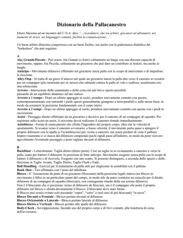 Dizionario della Pallacanestro Ettore Messina ad un incontro del C.N.A. dice:”…ricordatevi, che tra arbitri, giocatori ed allenatori, nei momenti di stress, un linguaggio comune, facilita la comunicazione…”. Un buon arbitro dimostra competenza con un buon fischio, ma anche con la padronanza dialettica del “baskettese” che può seguirne. A Ala, Grande/Piccola - Può essere Ala Grande (o forte) solitamente un lungo con una discreta capacità di movimento, oppure Ala Piccola, solitamente un giocatore che può dare un contributo ai tiratori, ma anche ai lunghi. Anticipo - Movimento difensivo effettuato sul giocatore senza palla con lo scopo di intercettare o di impedirne la ricezione. Alley-Oop - Si tratta di un gioco d’attacco nel quale un giocatore lancia la palla alta verso il canestro avversario per un compagno (più raramente per sé stesso) che saltando cattura la palla al volo e realizza, usualmente con una schiacciata. Arresto - Interruzione della camminata o della corsa nel più breve spazio possibile passando da un equilibrio dinamico ad uno statico. Arresto a 1 tempo - Dopo un ultimo appoggio al suolo, prendere nuovamente contatto con questo, contemporaneamente con entrambi i piedi; questi generalmente giungono a terra paralleli e sulla stessa linea, in modo da assumere la posizione fondamentale con il corpo intero. Arresto a 2 tempi - Dopo un ultimo appoggio al suolo, prendere nuovamente contatto con questo con i piedi in successione. Assist - Passaggio diretto effettuato da un giocatore e decisivo per il canestro di un compagno di squadra. Per registrare sullo scout un assist, il ricevente dovrà realizzare il canestro tirando immediatamente. Autoblocco - Forma di smarcamento che sfrutta l'ingombro del proprio corpo, oltre che la velocità di spostamento. Si avanza verso il canestro avversario, a bassa velocità; il movimento porta quasi a spingere il proprio difensore con la spalla (o l'avambraccio) più vicina a canestro, ma senza perdere di vista il pallone. Improvvisamente ci si stacca dal difensore compiendo pochi rapidi passi all'indietro, in modo da poter ricevere agevolmente l'eventuale passaggio o poter tagliare davanti al difensore. B BackDoor - Letteralmente: Taglia dietro (dietro porta). Cioè un taglio in avvicinamento a canestro e verso la palla, usato per battere il difensore in posizione di forte anticipo. Movimento eseguito senza palla con lo scopo di battere il difensore e di riceverla. Eseguito con uno scatto. Si possono distinguere, a seconda dello spazio e della direzione in Taglio Avanti, Taglio Dietro, Taglio Flash e Fade. Ball Handling - Esercizi per il trattamento di palla utili per migliorare la sensibilità con il pallone. Bank Shot - Tiro effettuato con l’aiuto del tabellone. Blocco - E’ l'assunzione da parte di un giocatore (bloccante) della posizione legale statica (un blocco in movimento è fallo) in un particolare punto del campo, in modo tale da poter costituire un ostacolo per il diretto difensore di un compagno di squadra (bloccato), con conseguente ritardo della sua azione difensiva. Non è il bloccante che si posiziona vicino al difensore da bloccare, ma è il compagno che porta il proprio difensore sul blocco e sfrutta dovutamente il blocco; il bloccante deve stare fermo. Il Blocco può essere evitato solo passando “sopra”, “sotto” o (nel caso di più bloccanti) “in terza”. Blocco Davanti o Frontale - Blocco portato davanti al difensore. Blocco Orizzontale o Laterale - Blocco portato laterale al difensore. Blocco Dietro o Verticale - Blocco portato alle spalle del difensore. Body-Check - Sovrapposizione, facendo uso del proprio corpo e di lievi contatti, alla traiettoria di corsa dell'avversario. C Cambio di Velocità - Incremento (o diminuzione) della velocità di spostamento, eseguito nel più breve tempo possibile. Cambio di Direzione - Deviazione della direzione del proprio spostamento, conservando nei movimenti la coordinazione necessaria per una risposta positiva agli sviluppi del gioco. Il cambio di direzione non disegna mai una curva ma crea invece un angolo formato da due rette. Controllo della Palla - Il controllo della palla da parte di una squadra inizia quando un giocatore di quella squadra ha il controllo di una palla viva, poiché trattiene o palleggia o ha a disposizione una palla viva. Il controllo della palla da parte di una squadra continua quando un giocatore di quella squadra ha il controllo di una palla viva oppure quando la palla viene passata tra giocatori della stessa squadra. Il controllo della palla da parte di una squadra termina quando un avversario guadagna il controllo della palla, oppure se la palla diventa morta, e per ultimo quando la palla non è più in contatto con la mano(i) del tiratore, in occasione di un tiro a canestro su azione o di un tiro libero. Contropiede - Attacco condotto ad elevata velocità (generalmente secondo schemi già predisposti prima della partita) allo scopo di arrivare alla conclusione ravvicinata e con scarso disturbo da parte dei difensori, avendo creato una situazione offensiva di soprannumero. Dovendo fissare dei criteri temporali, possiamo dire che il contropiede inizia quando avviene il cambio di controllo della palla e termina con la chiusura del palleggio. Contropiede Primario - Situazione in cui si conclude subito a canestro (situazioni di 1vs0, 2vs1 e 3vs2). Contropiede Secondario - Situazione in cui non si riesce a concludere subito a canestro. Il giocatore aspetta che arrivino anche altri giocatori in vantaggio sui diretti difensori. D Dai e Vai - Dare la palla ed andare verso canestro per ricevere un passaggio di ritorno smarcante. E' un ampliamento del "vai e ricevi" con un passaggio, uno smarcamento con finte, cambi di direzione e velocità... ed un taglio verso canestro di chi ha passato la palla: dai, vai e ricevi. Dai e Blocca - Dare il pallone e portare poi un blocco in favore di chi ha ricevuto il passaggio. Dai e Cambia - Dare la 