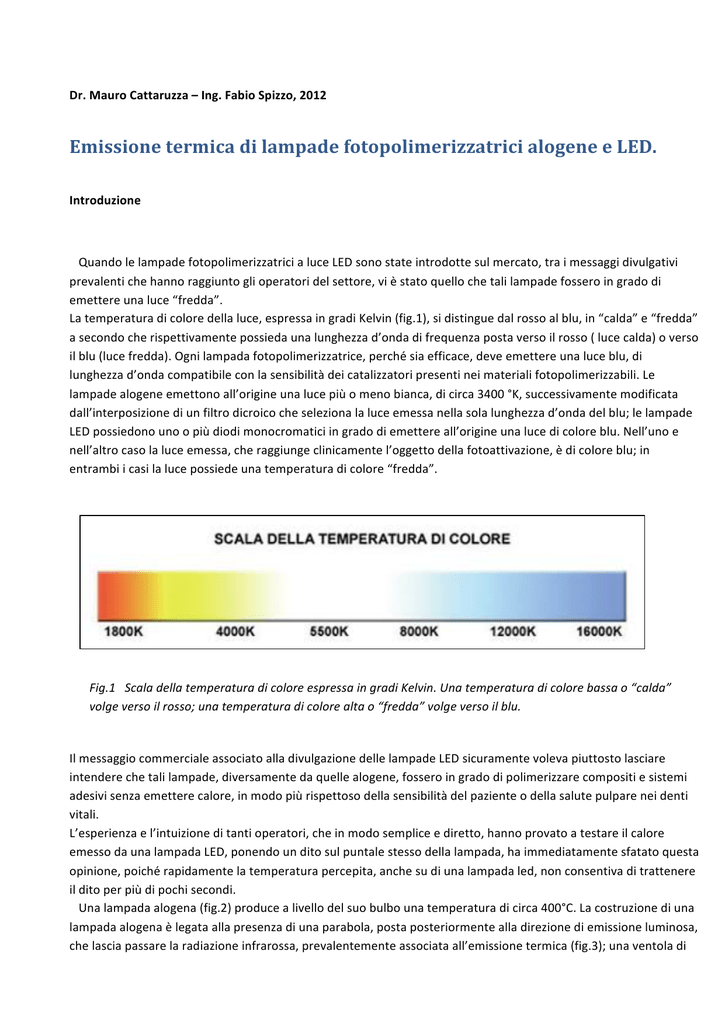 Dr. Mauro Cattaruzza – Ing. Fabio Spizzo, 2012 Emissione termica di lampade fotopolimerizzatrici alogene e LED. Introduzione Quando le lampade fotopolimerizzatrici a luce LED sono state introdotte sul mercato, tra i messaggi divulgativi prevalenti che hanno raggiunto gli operatori del settore, vi è stato quello che tali lampade fossero in grado di emettere una luce “fredda”. La temperatura di colore della luce, espressa in gradi Kelvin (fig.1), si distingue dal rosso al blu, in “calda” e “fredda” a secondo che rispettivamente possieda una lunghezza d’onda di frequenza posta verso il rosso ( luce calda) o verso il blu (luce fredda). Ogni lampada fotopolimerizzatrice, perché sia efficace, deve emettere una luce blu, di lunghezza d’onda compatibile con la sensibilità dei catalizzatori presenti nei materiali fotopolimerizzabili. Le lampade alogene emettono all’origine una luce più o meno bianca, di circa 3400 °K, successivamente modificata dall’interposizione di un filtro dicroico che seleziona la luce emessa nella sola lunghezza d’onda del blu; le lampade LED possiedono uno o più diodi monocromatici in grado di emettere all’origine una luce di colore blu. Nell’uno e nell’altro caso la luce emessa, che raggiunge clinicamente l’oggetto della fotoattivazione, è di colore blu; in entrambi i casi la luce possiede una temperatura di colore “fredda”. Fig.1 Scala della temperatura di colore espressa in gradi Kelvin. Una temperatura di colore bassa o “calda” volge verso il rosso; una temperatura di colore alta o “fredda” volge verso il blu. Il messaggio commerciale associato alla divulgazione delle lampade LED sicuramente voleva piuttosto lasciare intendere che tali lampade, diversamente da quelle alogene, fossero in grado di polimerizzare compositi e sistemi adesivi senza emettere calore, in modo più rispettoso della sensibilità del paziente o della salute pulpare nei denti vitali. L’esperienza e l’intuizione di tanti operatori, che in modo semplice e diretto, hanno provato a testare il calore emesso da una lampada LED, ponendo un dito sul puntale stesso della lampada, ha immediatamente sfatato questa opinione, poiché rapidamente la temperatura percepita, anche su di una lampada led, non consentiva di trattenere il dito per più di pochi secondi. Una lampada alogena (fig.2) produce a livello del suo bulbo una temperatura di circa 400°C. La costruzione di una lampada alogena è legata alla presenza di una parabola, posta posteriormente alla direzione di emissione luminosa, che lascia passare la radiazione infrarossa, prevalentemente associata all’emissione termica (fig.3); una ventola di raffreddamento, retrostante alla lampada alogena, dissipa buona parte del calore emesso, così che il calore associato alla luce bianca, rivolto nella direzione di fotoattivazione, risulta in realtà di gran lunga minore. Un LED di 5 W, spesso presente in tante lampade led del commercio, emette alla sua giunzione (TJ) una temperatura di 135°C; LEDs di potenza maggiore possono emettere temperature ancora maggiori, tanto che la costruzione di un led richiede sempre la presenza di un dissipatore di calore (fig.5), se non talvolta di una ventola di raffreddamento o di una struttura della lampada in metallo, capace di dissipare il calore prodotto. Fig.2 (a sinistra) Lampada alogena utilizzata in comuni lampade fotopolimerizzatrici; fig.3 (a destra) schema costruttivo di una lampada alogena. La parabola posteriore al bulbo è in grado di lasciar passare la luce Infrarossa verso il retro della lampada e di riflettere la luce visibile anteriormente. Fig. 4 (a sinistra) LED di comune impiego in lampade fotopolimerizzatrici ad uso dentale con potenza di 5 W Fig.5 (a destra) Schema costruttivo di un LED. TJ, temperatura alla giunzione; si noti la presenza di un dissipatore di calore alla base del LED. La realizzazione di lampade LED di elevata potenza, la presenza in alcune lampade di più LEDs e soprattutto la costruzione di lampade con LEDs posti direttamente sul puntale della lampada, a breve distanza dall’oggetto fotoattivato, pongono ragionevoli dubbi sulla reale emissione di calore da parte di queste lampade. In questo lavoro sono messe confronto le temperature di emissione di una lampada alogena e di due lampade LED, in modo da verificare con esattezza il diverso comportamento clinico e la veridicità o meno di certe affermazioni. Materiali e metodi La lampada alogena presa in considerazione è la Optilux 501 (Demetron-‐Kerr). Presenta una emisione luminosa dichiarata di circa 800 mW/cm2, con puntale standard di 10 x 10 mm. La possibilità di utilizzare puntali capaci di concentrare il fascio luminoso in un’area di irradiazione minore, consente di raggiungere valori di emissione luminosa maggiori. Con il puntale “turbo” di diametro 11 x 7 mm la potenza di emissione luminosa raggiunge circa i 1240 mW/cm”; con puntale “mini-‐turbo”, diametro 7 x 3 mm, l’emissione è di 660 mW/cm2. Tali valori di emissione luminosa sono stati misurati con il radiometro in dotazione della stessa lampada Optilux 501, opportunamente tarato sui valori di emissione luminosa del puntale standard indicati dalla ditta produttrice all’origine. Le due lampade LED qui testate sono la Bluphase C8 (Ivoclar) e la Valo (Ultradent). La Bluphase è una lampada multI-‐wave con quattro LEDs posti alla base di un puntale di quarzo del diametro di 10 x 10 mm; la Valo è una lampada sempre multI-‐wave, con quattro LEDs, ma posti in testa al puntale a breve distanza dall’oggetto fotoesposto. La Bluphase C8 presenta una potenza massima (high power) dichiarata di 800 mW/cm2; la Valo presenta una potenza dichiarata standard di 1000 mW/cm2, che aumenta a seconda del circuito di potenza scelto a 1400 mW/cm2 (high power) e 3200 mW/cm2 (xtra power). Poiché l’emissione termica è condizionata dalla potenza dell’emissione luminosa, l’intensità della luce emessa di tutte e tr