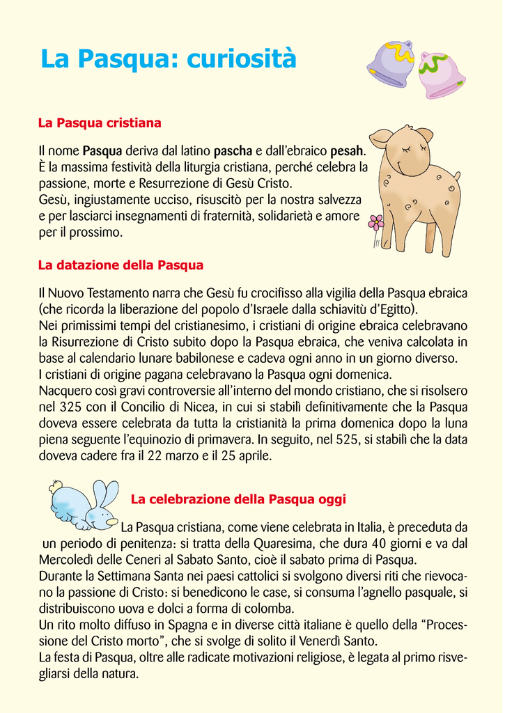 La Pasqua: curiosità La Pasqua cristiana Il nome Pasqua deriva dal latino pascha e dall’ebraico pesah. È la massima festività della liturgia cristiana, perché celebra la passione, morte e Resurrezione di Gesù Cristo. Gesù, ingiustamente ucciso, risuscitò per la nostra salvezza e per lasciarci insegnamenti di fraternità, solidarietà e amore per il prossimo. La datazione della Pasqua Il Nuovo Testamento narra che Gesù fu crocifisso alla vigilia della Pasqua ebraica (che ricorda la liberazione del popolo d’Israele dalla schiavitù d’Egitto). Nei primissimi tempi del cristianesimo, i cristiani di origine ebraica celebravano la Risurrezione di Cristo subito dopo la Pasqua ebraica, che veniva calcolata in base al calendario lunare babilonese e cadeva ogni anno in un giorno diverso. I cristiani di origine pagana celebravano la Pasqua ogni domenica. Nacquero così gravi controversie all’interno del mondo cristiano, che si risolsero nel 325 con il Concilio di Nicea, in cui si stabilì definitivamente che la Pasqua doveva essere celebrata da tutta la cristianità la prima domenica dopo la luna piena seguente l’equinozio di primavera. In seguito, nel 525, si stabilì che la data doveva cadere fra il 22 marzo e il 25 aprile. La celebrazione della Pasqua oggi La Pasqua cristiana, come viene celebrata in Italia, è preceduta da un periodo di penitenza: si tratta della Quaresima, che dura 40 giorni e va dal Mercoledì delle Ceneri al Sabato Santo, cioè il sabato prima di Pasqua. Durante la Settimana Santa nei paesi cattolici si svolgono diversi riti che rievocano la passione di Cristo: si benedicono le case, si consuma l’agnello pasquale, si distribuiscono uova e dolci a forma di colomba. Un rito molto diffuso in Spagna e in diverse città italiane è quello della “Processione del Cristo morto”, che si svolge di solito il Venerdì Santo. La festa di Pasqua, oltre alle radicate motivazioni religiose, è legata al primo risvegliarsi della natura. La Pasqua e i bambini Anche per i bambini la Pasqua è un momento di conciliazione religiosa e un momento di particolare riflessione sulla pace e sul rispetto per il prossimo, in particolare per chi si trova in difficoltà. Il periodo pasquale, inoltre, coincide con la primavera e con il risveglio della natura. Pulcini, uova di Pasqua, campane e colombe saranno i simboli che toccheranno con mano i nostri bambini i quali, attraverso le attività, scopriranno la quiete e la serenità che questa dolce festa infonde nei nostri cuori. La colomba simbolo di pace La colomba richiama l’episodio del Diluvio Universale descritto nella Genesi (Gn 8,10-11), allorché l’animale ritornò da Noè tenendo nel becco un ramoscello di ulivo. Concluso il castigo divino le acque del diluvio si ritirarono e iniziò un’epoca nuova per l’umanità intera. La colomba diventa quindi simbolo della pace e, nel periodo pasquale, questa simbologia allude alla pace portata da Gesù, il “Principe della Pace” che, con il suo Sacrificio, ha riconciliato l’uomo a Dio, suo Padre.