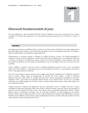 E L E M E N T I F O N D A M E N T A L I D I J A Z Z Capitolo 1 Elementi fondamentali di jazz Ora che finalmente ci siamo introdotti all’ascolto del jazz, dobbiamo essere più consapevoli di cosa stiamo ascoltando. Gli aspetti più importanti su cui dovremmo prestare attenzione sono la struttura, lo swing e la creatività. Struttura La maggior parte del jazz sin dall’era bebop è basata su una forma molto simile alla sonata allegro, appartenente alla teoria della musica classica: una introduzione opzionale, il tema (eventualmente ripetuto), lo sviluppo e infine la ricapitolazione eventualmente seguita dalla coda. L’introduzione, se presente, prepara e definisce la tonalità del pezzo; il tema è la melodia principale; lo sviluppo è la parte in cui il compositore estende le idee del tema; la ricapitolazione è una ripetizione del tema; e la coda è la chiusura. In termini jazz queste sezioni di un brano potrebbero essere chiamate intro, tema (eventualmente ripetuto), solo, tema finale, ed eventualmente una coda. In inglese: intro, head, solo, head out, coda or tag ending. L’intro stabilisce e prepara il mood; il tema la melodia principale; la parte di solo è dove il musicista improvvisa sulla melodia e/o sulla progressione di accordi del giro; l’head out è una ripetizione del tema; la coda o il tag rappresentano la chiusura. Non tutti i pezzi seguono questa struttura ma la maggior parte del jazz tradizionale lo fa. Durante la parte di solo la sezione ritmica segue la progressione di accordi del tema mentre i solisti si alternano all’improvvisazione. Ogni “giro” di accordi, ogni parte che segue la progressione principale di accordi è chiamato chorus e ogni solista può prendersi diversi chorus su cui improvvisare. In tutto ciò è possibile rintracciare una valida analogia con le forme di tema e variazione della musica classica. Ogni solista improvvisa una variazione del tema. L’improvvisazione è l’aspetto più importante del jazz, esattamente come lo sviluppo del tema è spesso considerato la parte più importante della sonata classica. Mentre ascoltate un pezzo cercate di canticchiare il tema sul solo del musicista. Potreste notare come alcuni solisti, in particolare Thelonious Monk e Wayne Shorter, spesso costruiscono il proprio solo sia sulla linea melodica, sia sulla progressione di accordi. Noterete anche come in alcuni casi anche il tema venga reinterpretato; musicisti come Miles Davis, Coleman Hawkins, Sonny Rollins e John Coltrane erano particolarmente portati a rendere molto personali le loro frasi anche quando si trattava di interpretare il tema. 1 E L E M E N T I F O N D A M E N T A L I D I J A Z Z Ci sono due strutture particolarmente comuni nel jazz. La prima è la struttura blues che è composta generalmente da 12 battute. Ci sono molte varianti sulla progressione di accordi del blues ma la maggior parte di queste è basata sul concetto di 3 frasi di 4 misure (three four-bar phrases). Nella sua accezione originale la seconda frase dovrebbe essere una ripetizione della prima e la terza dovrebbe essere una risposta a queste due, sebbene questa convenzione raramente trova applicazione nel jazz. Potete dare un’occhiata alla progressione tipica riportata di seguito per avere un’idea di come essa sia effettivamente fatta. Frase 1 |I / / / |I / / / |I / / / |I / / / | Statement: Ain’t it hard to stumble when you’ve got no place to fall? [solo] Frase 2 |IV / / / |IV / / / |I / / / |I / / / | Repetition: Ain’t it hard to stumble when you’ve got no place to fall? [solo] Frase 3 |V / / / |IV / / / |I / / / |I / / / || Response/Answer: In this whole wide world [turnaround] I’ve got no place at all. Una volta assimilato il concetto dovreste essere in grado di riconoscere facilmente una struttura blues ogni volta che ne ascoltate qualcuna, data la sua forte caratterizzazione. Anche le note aggiuntive e i titoli dei brani possono talvolta essere d’aiuto a identificare quali giri sono basati sul blues. Alcuni brani molto famosi basati su questa struttura sono "Now's The Time" e "Billie's Bounce" di Charlie Parker, "Straight, No Chaser" e "Blue Monk" di Thelonious Monk, "Freddie Freeloader" e "All Blues" di Miles Davis. L’altra struttura comunemente usata nel jazz è quella AABA, caratteristica della musica popoplare dagli inizi del 1900 fino all’alba del rock’n roll. Questa struttura consiste di due parti chiamate verse (parte A) e bridge (parte B o ponte). La forma dunque è verse 1, verse 2, bridge, verse 3. I verse sono simili o addirittura identici eccezion fatta per il testo e in qualche caso per le ultime due battute. A1 |/ / / / |/ / / / |/ / / / |/ / / / | |/ / / / |/ / / / |/ / / / |/ / / / | Tema principale A2 |/ / / / |/ / / / |/ / / / |/ / / / | |/ / / / |/ / / / |/ / / / |/ / / / | Ripetizione del tema principale B |/ / / / |/ / / / |/ / / / |/ / / / | |/ / / / |/ / / / |/ / / / |/ / / / | Variazione o Bridge (Contrasting) A3 |/ / / / |/ / / / |/ / / / |/ / / / | |/ / / / |/ / / / |/ / / / |/ / / / | Ritorno al tema principale 2 E L E M E N T I F O N D A M E N T A L I D I J A Z Z Il brano “I got rhythm” di Gorge Gershwin è un esempio di struttura AABA. Ci sono letteralmente centinaia di pezzi costruiti sulla progressione di accordi di questo brano inclusi “Anthropology” di Charlie Parker e “Oleo” di Sonny Rollins. Altri esempi di AABA sono "Darn That Dream" di Jimmy Van Heusen e "There Is No Greater Love" di Isham Jones. Molti brani come questi, popolari nella prima metà del 1900 sono stati reinterpretati da molti musicisti jazz e perciò chiamati comunemente standards. Queste regole costituiscono solo delle linee guida. Musicisti come Cecil Taylor ci hanno mostrato da molto tempo come è possibile esprimersi senza strutture ben definite e, anzi, questo tipo di espressione è spesso molto più personale di qualunque altra che faccia riferimento a regole predefinite. Abbiamo descritto queste strutture ricorrenti per aiu