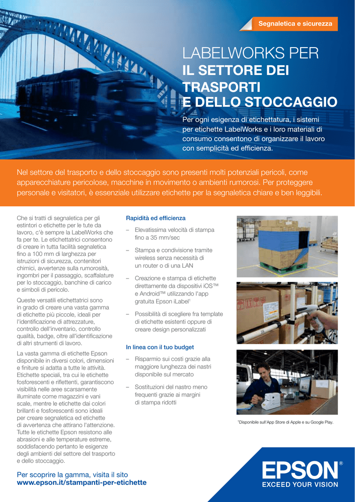 Segnaletica e sicurezza LabelWorks per il settore dei trasporti e dello stoccaggio Per ogni esigenza di etichettatura, i sistemi per etichette LabelWorks e i loro materiali di consumo consentono di organizzare il lavoro con semplicità ed efficienza. Nel settore dei del trasporti trasportoeedello dellostoccaggio stoccaggiosono sonopresenti presentimolti moltipotenziali potenzialipericoli, pericoli,come come apparecchiature pericolose, macchine in movimento o ambienti rumorosi. Per Per proteggere proteggere visitatori, èutilizzare essenziale utilizzare per la segnaletica personale epersonale visitatori, èe essenziale etichette peretichette la segnaletica chiare e ben leggibili. chiare e ben leggibili. Che si tratti di segnaletica per gli estintori o etichette per le tute da lavoro, c'è sempre la LabelWorks che fa per te. Le etichettatrici consentono di creare in tutta facilità segnaletica fino a 100 mm di larghezza per istruzioni di sicurezza, contenitori chimici, avvertenze sulla rumorosità, ingombri per il passaggio, scaffalature per lo stoccaggio, banchine di carico e simboli di pericolo. Queste versatili etichettatrici sono in grado di creare una vasta gamma di etichette più piccole, ideali per l'identificazione di attrezzature, controllo dell'inventario, controllo qualità, badge, oltre all'identificazione di altri strumenti di lavoro. La vasta gamma di etichette Epson disponibile in diversi colori, dimensioni e finiture si adatta a tutte le attività. Etichette speciali, tra cui le etichette fosforescenti e riflettenti, garantiscono visibilità nelle aree scarsamente illuminate come magazzini e vani scale, mentre le etichette dai colori brillanti e fosforescenti sono ideali per creare segnaletica ed etichette di avvertenza che attirano l'attenzione. Tutte le etichette Epson resistono alle abrasioni e alle temperature estreme, soddisfacendo pertanto le esigenze degli ambienti del settore del trasporto e dello stoccaggio. Rapidità ed efficienza – Elevatissima velocità di stampa fino a 35 mm/sec – Stampa e condivisione tramite wireless senza necessità di un router o di una LAN – Creazione e stampa di etichette direttamente da dispositivi iOS™ e Android™ utilizzando l'app gratuita Epson iLabel1 – Possibilità di scegliere fra template di etichette esistenti oppure di creare design personalizzati In linea con il tuo budget – Risparmio sui costi grazie alla maggiore lunghezza dei nastri disponibile sul mercato – Sostituzioni del nastro meno frequenti grazie ai margini di stampa ridotti Per scoprire la gamma, visita il sito www.epson.it/stampanti-per-etichette 1 Disponibile sull'App Store di Apple e su Google Play. LabelWorks LW-1000P per etichette nel settore dei trasporti e dello stoccaggio, fino a 36 mm di larghezza Velocità di stampa fino a 35 mm/ sec per una maggiore produttività Importazione di dati (xls(s), txt, csv) per la creazione di etichette personalizzate Possibilità di scegliere tra più opzioni di connettività, tra cui wireless, wireless device-todevice ed Ethernet Vasta gamma di template, tra cui codici a barre e simboli Creazione di etichette da un PC o da dispositivi mobile iOS™ e Android™ Possibilità di creare, salvare e recuperare i template creati Nastri consigliati Nero su rosso o giallo Nero su riflettente Superficie rossa o gialla stampata con testo in nero. Ideale per etichettare i dispositivi di sicurezza. Nastro argento con testo in nero. Ideale per migliorare la visibilità nelle aree scarsamente illuminate, come gli scaffali dei magazzini. Disponibile in larghezze da 6 mm a 36 mm Disponibile nella larghezza di 18 mm Nero su giallo o verde fluorescente Nero su fosforescente Nastro giallo o verde fluorescente con testo in nero che cattura l'attenzione. Ideale per etichettare sostanze pericolose. Visibile al buio fino a 8 ore. Ideale per etichettare l'apparecchiatura nei vani scale. Disponibile nelle larghezze di 12 mm e 18 mm Disponibile nella larghezza di 18 mm LabelWorks SIGNAGE AND SECURITY TRANSPORT STORAGE datasheet_1IT_12/14 LabelWorks Pro100 per etichette e segnaletica temporanee o permanenti nel settore dei trasporti e dello stoccaggio, fino a 100 mm Etichette in plastica per un utilizzo prolungato o etichette in carta per un utilizzo temporaneo Creazione di segnaletica di grande formato grazie alla stampa senza margini mediante l'affiancamento di più etichette Utilizzo su scrivania con un PC Creazione e modifica di etichette in tutta facilità con il software incluso Stampa di alta qualità a un prezzo conveniente Strumento di applicazione delle etichette con livella a bolla incorporata per un corretto posizionamento Materiali di consumo I nastri in plastica olefinica sono disponibili in sette colori e in rotoli da 50 mm e 100 mm di larghezza, mentre le cartucce nastro sono disponibili in cinque colori e consentono di creare 30 combinazioni di colore. È inoltre disponile un rotolo di etichette pretagliate. Etichette di lunga durata I nastri Epson LabelWorks sono progettati per durare e sottoposti ai più rigidi test di durata. Grazie alla lunghezza massima di 9 metri per nastro e ai margini ridotti è possibile ottenere più etichette a costi inferiori. Per maggiori informazioni, contattare il proprio rivenditore Epson di fiducia o visitare il sito www.epson.it Epson Italia s.p.a. Tel.: 02-660321 Numero Verde: 800-801101 Via M. Viganò De Vizzi, 93/95 20092 Cinisello Balsamo (MI) www.epson.it - www.facebook.com/epson.italia I marchi e i marchi registrati appartengono a Seiko Epson Corporation o ai rispettivi proprietari. Le informazioni sui prodotti sono soggette a modifica senza obbligo di preavviso. Per maggiori informazioni sulle soluzioni Epson per il settore dei trasporti e dello stoccaggio, visita il sito www.epson.it/settore-trasporti