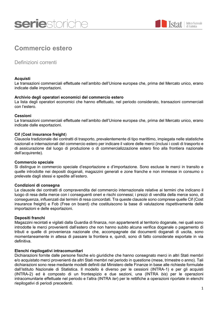 Commercio estero Definizioni correnti Acquisti Le transazioni commerciali effettuate nell’ambito dell’Unione europea che, prima del Mercato unico, erano indicate dalle importazioni. Archivio degli operatori economici del commercio estero La lista degli operatori economici che hanno effettuato, nel periodo considerato, transazioni commerciali con l’estero. Cessioni Le transazioni commerciali effettuate nell’ambito dell’Unione europea che, prima del Mercato unico, erano indicate dalle esportazioni. Cif (Cost insurance freight) Clausola tradizionale dei contratti di trasporto, prevalentemente di tipo marittimo, impiegata nelle statistiche nazionali e internazionali del commercio estero per indicare il valore delle merci (inclusi i costi di trasporto e di assicurazione dal luogo di produzione o di commercializzazione estero fino alla frontiera nazionale dell’acquirente). Commercio speciale Si distingue in commercio speciale d’esportazione e d’importazione. Sono escluse le merci in transito e quelle introdotte nei depositi doganali, magazzini generali e zone franche e non immesse in consumo o prelevate dagli stessi e spedite all’estero. Condizioni di consegna Le clausole dei contratti di compravendita del commercio internazionale relative ai termini che indicano il luogo di resa della merce con i conseguenti oneri e rischi connessi; i prezzi di vendita della merce sono, di conseguenza, influenzati dai termini di resa concordati. Tra queste clausole sono comprese quelle Cif (Cost insurance freight) e Fob (Free on board) che costituiscono la base di valutazione rispettivamente delle importazioni e delle esportazioni. Depositi franchi Magazzini recintati e vigilati dalla Guardia di finanza, non appartenenti al territorio doganale, nei quali sono introdotte le merci provenienti dall’estero che non hanno subito alcuna verifica doganale o pagamento di tributi e quelle di provenienza nazionale che, accompagnate dai documenti doganali di uscita, sono momentaneamente in attesa di passare la frontiera e, quindi, sono di fatto considerate esportate in via definitiva. Elenchi riepilogativi intracomunitari Dichiarazioni fornite dalle persone fisiche e/o giuridiche che hanno consegnato merci in altri Stati membri e/o acquistato merci provenienti da altri Stati membri nel periodo in questione (mese, trimestre o anno). Tali dichiarazioni sono rese mediante modelli definiti dal Ministero delle Finanze in base alle richieste formulate dall’Istituto Nazionale di Statistica. Il modello è diverso per le cessioni (INTRA-1) e per gli acquisti (INTRA-2) ed è composto di un frontespizio e due sezioni, una (INTRA bis) per le operazioni intracomunitarie effettuate nel periodo e l’altra (INTRA ter) per le rettifiche a operazioni riportate in elenchi riepilogativi di periodi precedenti. 1 Esportazioni I trasferimenti di beni da operatori residenti a operatori non residenti (resto del mondo). Le esportazioni di beni includono tutti i beni (nazionali o nazionalizzati, nuovi o usati) che, a titolo oneroso o gratuito, escono dal territorio economico del paese per essere destinati al resto del mondo. Esse sono valutate al valore Fob (free on board) che corrisponde al prezzo di mercato alla frontiera del paese esportatore. Questo prezzo comprende: il prezzo ex fabrica, i margini commerciali, le spese di trasporto internazionale e gli eventuali diritti all’esportazione. Esportazioni temporanee Le merci italiane spedite temporaneamente in uno Stato estero a scopo di perfezionamento (lavorazione, trasformazione o riparazione). Le esportazioni temporanee a fini di riparazione sono escluse dalle statistiche del commercio con l’estero. Fob (Free on board) Clausola tradizionale dei contratti di trasporto, prevalentemente marittimo, che indica nella quotazione dei prezzi delle merci che le spese di spedizione e i rischi sono a carico del venditore fino al caricamento della merce sul mezzo di trasporto. Tale clausola è utilizzata nelle statistiche del commercio estero nazionali e internazionali per indicare il valore delle merci inclusi i costi di trasporto e di assicurazione dal luogo di produzione o di commercializzazione fino alla frontiera nazionale del venditore. Immissione in libera pratica (di merci) Nell’ambito del mercato dell’Ue si considerano immesse in libera pratica le merci provenienti da paesi extracomunitari per le quali si sono adempiute in uno Stato comunitario le formalità di importazione e riscossi, senza ristorno, i dazi doganali. Importazioni Sono costituite dagli acquisti all’estero (resto del mondo) di beni introdotti nel territorio nazionale. Le importazioni di beni comprendono tutti i beni (nuovi o usati) che, a titolo oneroso o gratuito, entrano nel territorio economico del paese, in provenienza dal resto del mondo. Esse possono essere valutate al valore Fob (free on board) o al valore Cif (costo, assicurazione, nolo) che comprende: il valore Fob dei beni, le spese di trasporto e le attività assicurative tra la frontiera del paese esportatore e la frontiera del paese importatore. Importazioni temporanee Le merci provenienti da uno Stato estero introdotte, temporaneamente, nel territorio nazionale a scopo di perfezionamento (lavorazione, trasformazione o riparazione). Le importazioni temporanee a fini di riparazione sono escluse dalle statistiche del commercio con l’estero. Intrastat Il sistema di rilevazione relativo alle statistiche sugli scambi di beni tra gli Stati membri dell’Unione europea, nel quale sono stabilite soglie temporali per le dichiarazioni degli operatori che effettuano tali scambi. Mercato unico (mercato interno all’Ue) Nasce formalmente il 1° gennaio 1993, a seguito della progressiva eliminazione delle barriere fisiche alla libera circolazione di merci, persone, servizi e capitali all’interno dell’area comunitaria. Merci I beni mobili, ossia tutti i prodotti concreti e tangibili oggetto di transazione commerciale. L’energia elettrica, pur