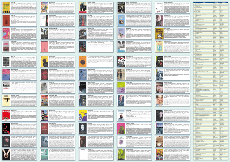 Levin Ira I *ragazzi venuti dal Brasile / Ira Levin ; traduzione di Adriana Dell’Orto. - Milano : A. Mondadori, 2006. - 265 p. ; 20 cm. ((Trad. di: The boys from Brazil (*Oscar. Varia ; 1906) Philbrick Rodman *Basta guardare il cielo / Rodman Philbrick ; traduzione di Beatrice Masini. - [Milano : Rizzoli], 2008. - 176 p. ; 22 cm. ((Trad. di: Freak the Mighty (*Rizzoli oltre) Schmitt Erica-Emmanuel Max è un ragazzo grande e grosso e, dicono tutti, un po’ scemo. Kevin ha una rara malattia che ha impedito al suo corpo di svilupparsi. Sono tutti e due soli, ma sono anche la cura che serve all’altro, perché se Max ha gambe forti, così forti da bastare per due, Kevin possiede immaginazione e intelligenza anche per Max. E insieme non sono più né Max né Kevin: insieme sono Freak The Mighty, una creatura capace di qualsiasi cosa. Nel breve intreccio di strade di un popolare quartiere parigino dove i nomi delle vie hanno il sapore delle favole (rue Bleue, rue de Paradis), l’adolescente Momo vive con un padre perso in una silenziosa e fosca depressione. Nello stesso quartiere vive anche monsieur Ibrahim, l’unico musulmano in una via “ebrea”, titolare della drogheria dove Momo si reca a fare la spesa quotidiana e non esita ogni tanto a sgraffignare qualche scatoletta di conserva... “E’ solo un arabo, dopo tutto!” pensa Momo, e, con suo grande stupore, il vecchio Ibrahim sembra leggergli nel pensiero: “Non sono arabo, vengo dalla Mezzaluna d’Oro”. Romanzo storico. Antonia, orfanaa abbandonata nei pressi del convento di S. Michele a Novara, cresce tra le suore, la rigida disciplina del convento e la dottrina cattolica. Come tutte le “esposte” (abbandonate) del convento, è destinata ad essere “adottata” da un visitatore qualsiasi; all’età di dieci anni, Antonia è infatti presa in custodia dai due coniugi Nidasio, provenienti dalla “bassa” novarese, e precisamente da Zardino. Antonia cresce molto bella ed intelligente, suscitando l’invidia di buona parte del paese. Nel frattempo la città di Novara è segnata da avvenimenti importanti… Missiroli Marco *Senza coda : romanzo / Marco Missiroli. - Roma : Fanucci, 2005. - 185 p. ; 22 cm (*Collezione narrativa) Pohl Peter Il *mio amico Jan : romanzo / Peter Pohl. - Firenze : Salani, copyr. 2005. - 231 p. ; 21 cm. ((Trad. di: Janne, min van *Quando ero un’opera d’arte / Eric-Emmanuel Schmitt ; traduzione dal francese di Alberto Bracci Testasecca. - Roma : E/O, copyr. 2006. - 183 p. ; 21 cm. ((Trad. di: Lorsque j’etais une oeuvre d’art (*Dal mondo) Vastano Lucia *Tutta un’altra musica in casa Buz : romanzo / Lucia Vastano. - Milano : Salani, copyr. 2005. - 199 p. ; 21 cm “Fra tre giorni ci vai da Carmine, a papà?” Questa frase, e per Pietro ricomincia a pulsare il segreto. Un segreto racchiuso nel favore da fare a suo padre senza che nessuno lo venga a sapere e senza nessun errore. Questa frase, e per Pietro niente è uguale a prima. Così il sole forte del giardino diventa il buio cattivo della cantina D4 e l’odore buono della piccola casa si trasforma nel fetore di cemento della grande città. Non ci saranno più le carezze di sua madre, soffocate da una verità crudele e silenziosa. Per Pietro, all’improvviso, ci sarà solo il mondo adulto di suo padre: un mondo crudele che il bambino scoprirà attraverso i suoi occhi innocenti e a cui si ribellerà fino in fondo. È la storia di un’amicizia nata per le strade di Stoccolma, tra due ragazzini attratti da una diversità estrema e invalicabile. Dell’uno tutto è palese: l’età, la famiglia, le amicizie, i legami affettivi; dell’altro nulla è noto. Il ragazzo esercita un fascino travolgente sull’amico così sistematico e diligente. Cresce l’amicizia, ma cresce anche il dubbio sulla provenienza di Jan; le sue assenze frequenti non hanno spiegazione, e neanche i segni di violenze sul viso. Ma il pegno dell’amicizia sta proprio lì, nel non fare domande, nell’accettare tutto dell’altro nella buona e cattiva sorte, anche il silenzio. Il giovane Tazio Firelli si sente brutto e insignificante. Decide di porre fine alla sua inutile esistenza: ma il celeberrimo artista Zeus-Peter Lama lo convince che non sarà certo il suicidio a dargli la tanto desiderata visibilità, anzi. Piuttosto, che ceda a lui la sua vita, che si metta nelle sue mani e lui lo farà finalmente diventare qualcuno. Sotto le abili dita dell’artista, complice un losco chirurgo da obitorio, il giovane viene radicalmente modificato: diventa “Adam bis”, la scultura vivente, l’opera di cui tutti parlano. L’anonimato è alle sue spalle, ora è famoso, ma c’è un problema: è famoso come oggetto, non come persona. Per Adam comincia il percorso inverso: un cammino irto di ostacoli tramite il quale l’individuo divenuto oggetto cerca di riconquistare il suo status di essere umano, con l’unico debole aiuto di un pittore cieco e di sua figlia. Rubina Buz ha sedici anni e vive con la famiglia in un campo profughi di Peshawar: ribelle, colta, appassionata di cinema, sogna di diventare regista a Bollywood. Parla e scrive correntemente in inglese, e ha un sito internet personale. Per uscire indisturbata e curiosare qua e là, indossa l’odiato burqa. Per aiutare la sorella minore malata di epilessia contatta un’organizzazione non governativa e dei medici italiani. Le piacciono i ragazzi, e riesce con astuzia a mandare a monte il matrimonio combinato da papà. Loe Erlend *Naif super / Erlend Loe ; traduzione di Giovanna Paterniti. - Milano : Feltrinelli, 2006. - 211 p. ; 20 cm. ((Trad. di: Naiv super (*Universale economica Feltrinelli ; 1910) Morpurgo Michael Pullman Philip Vinci Simona La *bambina filosofica / [Vanna Vinci]. - Bologna : Kappa, 2006. - 1 v. : fumetti ; 21 cm (*Jet lag) Il protagonista tiene una sorta di diario a partire dal giorno del suo venticinquesimo compleanno. Da tardo adolescente qual è, in crisi d’identità e di motivazione, si fa 
