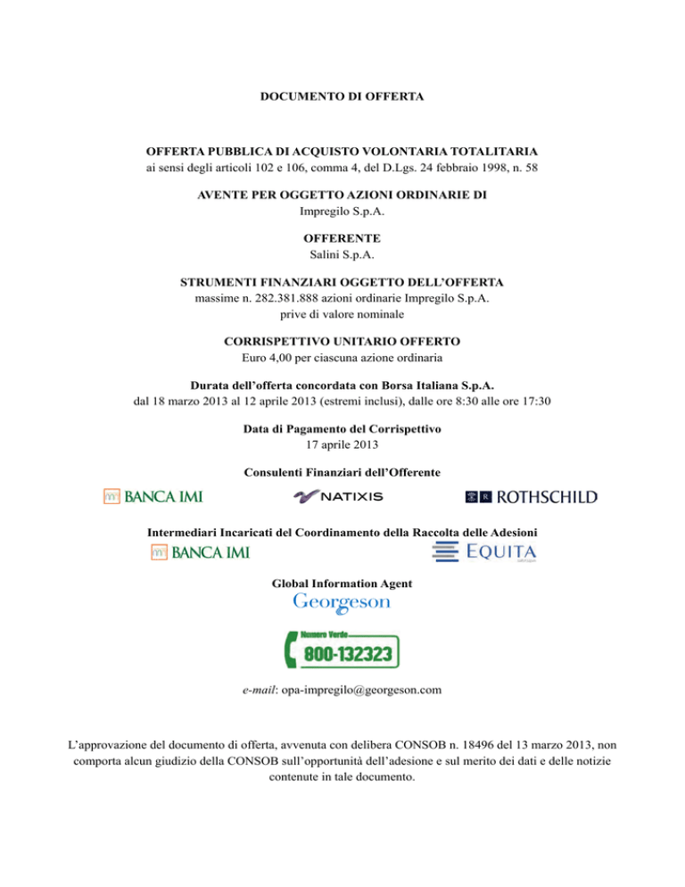 DOCUMENTO DI OFFERTA OFFERTA PUBBLICA DI ACQUISTO VOLONTARIA TOTALITARIA ai sensi degli articoli 102 e 106, comma 4, del D.Lgs. 24 febbraio 1998, n. 58 AVENTE PER OGGETTO AZIONI ORDINARIE DI Impregilo S.p.A. OFFERENTE Salini S.p.A. STRUMENTI FINANZIARI OGGETTO DELL’OFFERTA massime n. 282.381.888 azioni ordinarie Impregilo S.p.A. prive di valore nominale CORRISPETTIVO UNITARIO OFFERTO Euro 4,00 per ciascuna azione ordinaria Durata dell’offerta concordata con Borsa Italiana S.p.A. dal 18 marzo 2013 al 12 aprile 2013 (estremi inclusi), dalle ore 8:30 alle ore 17:30 Data di Pagamento del Corrispettivo 17 aprile 2013 Consulenti Finanziari dell’Offerente Intermediari Incaricati del Coordinamento della Raccolta delle Adesioni Global Information Agent e-mail: [email protected] L’approvazione del documento di offerta, avvenuta con delibera CONSOB n. 18496 del 13 marzo 2013, non comporta alcun giudizio della CONSOB sull’opportunità dell’adesione e sul merito dei dati e delle notizie contenute in tale documento. Documento di Offerta Impregilo S.p.A. INDICE DEFINIZIONI .................................................................................................................................................. 5 PREMESSA .................................................................................................................................................... 10 A. AVVERTENZE ....................................................................................................................................... 13 A.1 Condizioni di efficacia dell’Offerta ................................................................................................ 13 A.2 Approvazione e pubblicazione del bilancio d’esercizio al 31 dicembre 2012 dell’Emittente ........ 14 A.3 Distribuzione del dividendo da parte dell’Emittente ed effetti sull’ammontare del Corrispettivo per Azione ................................................................................................................. 15 A.4 Informazioni relative al finanziamento dell’Offerta ....................................................................... 16 A.5 Natura di operazione di leveraged buy-out dell’eventuale Fusione............................................... 19 A.6 Sintesi dei programmi futuri dell’Offerente .................................................................................... 21 A.7 Parti correlate ................................................................................................................................ 23 A.8 Autorizzazioni ................................................................................................................................. 24 A.9 Dichiarazione dell’Offerente in merito all’eventuale ripristino del flottante e all’adempimento dell’Obbligo di Acquisto ai sensi dell’articolo 108, comma 2, del Testo Unico .............................................................................................................................................. 24 A.10 Dichiarazione dell’Offerente in merito all’adempimento dell’Obbligo di Acquisto ai sensi dell’articolo 108, comma 1, del Testo Unico e all’esercizio del Diritto di Acquisto ...................... 25 A.11 Eventuale scarsità del flottante e conseguente Delisting ............................................................... 26 A.12 Alternative per gli azionisti destinatari dell’Offerta ...................................................................... 27 A.12.1 Scenari in caso di perfezionamento dell’Offerta ............................................................... 27 A.12.2 Scenario in caso di mancato perfezionamento dell’Offerta a causa del mancato avveramento anche di una sola delle condizioni cui la stessa è subordinata senza rinuncia alle stesse da parte dell’Offerente ........................................................................ 30 A.13 Diritti delle Azioni di Risparmio .................................................................................................... 30 A.14 Potenziali conflitti di interessi ........................................................................................................ 30 A.15 Comunicato dell’Emittente ............................................................................................................. 31 B. SOGGETTI PARTECIPANTI ALL’OPERAZIONE .......................................................................... 32 B.1 L’Offerente ...................................................................................................................................... 32 B.1.1 Denominazione sociale, forma giuridica e sede sociale .................................................... 32 B.1.2 Costituzione e durata ......................................................................................................... 32 B.1.3 Legislazione di riferimento e foro competente .................................................................. 32 B.1.4 Capitale sociale .................................................................................................................. 32 B.1.5 Principali azionisti ............................................................................................................. 32 1 Documento di Offerta Impregilo S.p.A. B.1.6 Consiglio di Amministrazione, Collegio Sindacale, Società di revisione ......................... 33 B.1.7 Breve descrizione dell’Offerente e del gruppo cui appartiene l’Offerente ........................ 35 B.1.8 Principi contabili adottati nella redazione del bilancio d’esercizio ................................... 38 B.1.9 Schemi contabili dell’Offerente ......................................................................................... 40 B.1.10 Andamento recente (IAS/IFRS) ........................................................................................ 54 B.1.11 Persone che agiscono di concert