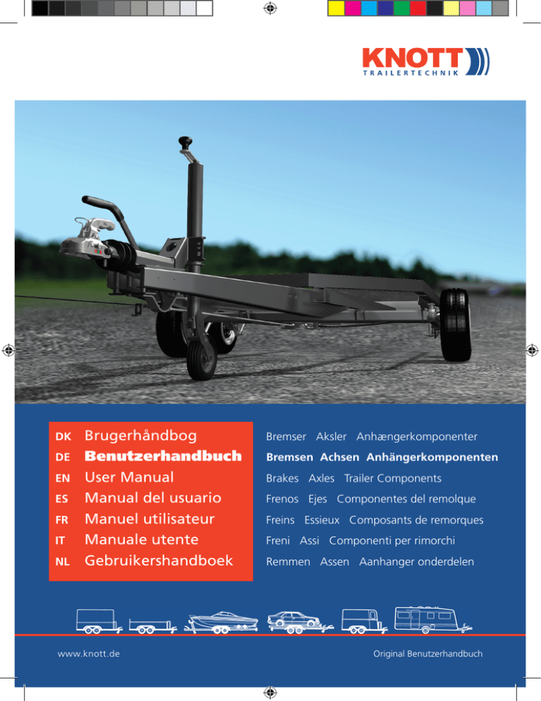 DK DE EN ES FR IT NL Brugerhåndbog Benutzerhandbuch User Manual Manual del usuario Manuel utilisateur Manuale utente Gebruikershandboek www.knott.de Bremser Aksler Anhængerkomponenter Bremsen Achsen Anhängerkomponenten Brakes Axles Trailer Components Frenos Ejes Componentes del remolque Freins Essieux Composants de remorques Freni Assi Componenti per rimorchi Remmen Assen Aanhanger onderdelen Original Benutzerhandbuch 2 Indholdfortegnelse Dansk 1.Målgruppe.................................................................................................................... 4 2.Signalord ...................................................................................................................... 4 3.Anvendelse i overensstemmelse med det tilsigtede formål...................................... 4 4. Komponenter............................................................................................................... 5 4.1Typeskilte............................................................................................................... 5 Deutsch 4.2 Trækindretninger.................................................................................................... 6 4.3Påløbsindretninger................................................................................................. 7 4.4Støttehjul............................................................................................................... 9 4.5Trækstang/Trækvange............................................................................................ 10 4.6Transmissionsindretninger...................................................................................... 11 4.7Aksler.................................................................................................................... 11 English 4.8Hjulbremser............................................................................................................ 12 5. Sikkerhed...................................................................................................................... 13 5.1 Generelle anvisninger............................................................................................. 13 5.2 Generelle sikkerhedanvisninger.............................................................................. 13 6. Ibrugtagning................................................................................................................. 14 Español 6.1Kuglekobling.......................................................................................................... 14 6.2Påløbsindretninger ................................................................................................ 14 6.3 Højdejusterbar trækstang....................................................................................... 15 6.4 Ibrugtagning af anhængeren.................................................................................. 16 7. Drift.............................................................................................................................. 17 7.1 Kontroller før hver kørsel........................................................................................ 17 Français 7.2Tilkobling............................................................................................................... 17 7.3Frakobling.............................................................................................................. 18 7.4Bremser.................................................................................................................. 19 7.5Tyverisikring........................................................................................................... 20 7.6Kørsel.................................................................................................................... 20 7.7 Hastighedsgrænsen 100 km/t (gælder kun for Tyskland)......................................... 20 Italiano 8.Sætten ud af drift......................................................................................................... 20 9. Inspektion..................................................................................................................... 21 9.1 Første inspektion.................................................................................................... 21 9.2 Regelmæssig inspektion hver 5000 km .................................................................. 22 9.4Servicedokumentation ........................................................................................... 26 10. Fejlfinding..................................................................................................................... 27 11. Serviceadresser ............................................................................................................ 185 www.knott.de 3 Nederlands 9.3 Regelmæssigt hovedeftersyn af anhængeren.......................................................... 25 Bremser Aksler Brugerhåndbog 1.Målgruppe Denne brugerhåndbog henvender sig til slutkunder af færdigmonterede anhængere med monterede KNOTT-anhængerkomponenter. 2.Signalord AA Risiko Gør dig opmærksom på en farlig situation, som kan medføre alvorlige kvæstelser eller døden, hvis den ikke undgås. advarsel Gør dig opmærksom på en farlig situation, som kan medføre alvorlige kvæstelser eller døden, hvis den ikke undgås. Forsigtig Gør dig opmærksom på en farlig situation, som kan medføre lette til moderate kvæstelser, hvis den ikke undgås. FF Bemærk Gør dig opmærksom på tingskader og andre vigtige oplysninger i forbindelse med produktet. 3.Anvendelse i overensstemmelse med det tilsigtede formål En bilingeniør monterer KNOTT anhængerkomponenter med overbygninger, som ikke er omfattet af leveringen, til en komplet anhænger. KNOTT anhængerkomponenter kan anvendes til en- og flerakslede klasse O1/ O2 anhængere. Den komplette anhænger kræver en generel drift