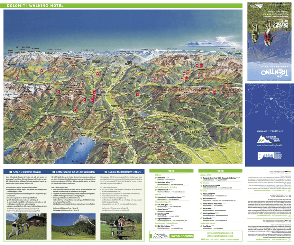 D O LO M I T I WA L K I N G H OT E L www.dolomitiwalkinghotel.it Montagne, natura e camminate Bergwanderungen in der Natur Mountain Walks in Nature DOLOMITI WALKING HOTEL 16 1 2 12 11 3 5 13 19 10 6 8 15 14 4 18 7 9 www.dolomitiwalkinghotel.it Hotel Val di Sole Siamo 18 famiglie di albergatori del Trentino unite dalla forte passione per la montagna. Vi consigliamo gli itinerari alla scoperta del Trentino nel cuore delle Dolomiti, dichiarate dall’Unesco Patrimonio naturale dell’umanità, per vivere emozioni uniche e momenti indimenticabili. Wir sind 18 Hotelbesitzer aus den Trentiner Tälern, und gemeinsam ist uns die Liebe zu den Bergen. Wir schlagen Ihnen Entdeckungstouren durch das Trentino vor, im Herzen der Dolomiten, die von der UNESCO zum Weltnaturerbe erklärt wurden, um Ihnen einen unvergesslichen Urlaub zu gewährleisten. We are a group of 18 family hoteliers operating in Trentino who share a great love of the mountains. We can recommend personalised itineraries to explore Trentino in the heart of the Dolomites, a UNESCO Natural World Heritage Site, to ensure you have a memorable holiday with unique experiences. Incluso nella nostra proposta vacanza per 7 notti, troverete: luoghi ideali per famiglie, coppie o amici, immersi nelle meraviglie delle Dolomiti dei parchi naturali competenza e professionalità degli albergatori che vi consiglieranno i percorsi più adatti 3 escursioni organizzate con differenti gradi di difficoltà prestito di attrezzatura (zaino, bastoncini da trekking…) in ogni struttura la disponibilità di un fornito corner informativo con cartine dettagliate, riviste di settore, galleria fotografica ogni giorno specialità culinarie della migliore tradizione italiana e trentina Unser 7-Nächte Angebot bietet Ideale Orte für den Urlaub mit der Familie oder mit Freunden, eingebettet in die herrlichen Naturlandschaften der Dolomiten und der Naturparks. Kompetente und professionelle Hoteliers, die Ihnen die besten Routen empfehlen. 3 geführte Wanderungen verschiedener Schwierigkeitsgrade. Ausrüstungsverleih (Rucksack, Trekkingstöcke usw.). In jedem Hotel einen gut ausgestatteten Informationspunkt mit detaillierten Landkarten, Fachzeitschriften und Fotos. Jeden Tag kulinarische Spezialitäten der besten italianischen und Trentiner Tradition. Our 7-night holiday offer includes: ideal places for families, couples and friends, surrounded by the spectacular scenery of the Dolomites and nature parks; expert and professional hoteliers who will recommend the best walks for you; 3 organised excursions with various levels of difficulty; equipment loan (backpacks, walking poles, etc.); an information area at each hotel, where you will find large-scale maps, magazines about the area and photographs; culinary specialities every day in the finest Italian and Trentino tradition. 8 8 8 8 8 8 8 8 8 8 8 8 8 8 8 8 Hotel ★★★ da 350 Euro per persona in mezza pensione per 7 notti Hotel ★★★★ da 450 Euro per persona in mezza pensione per 7 notti Hotel ★★★ from 350 Euro per person for 7 nights HB Hotel ★★★★ from 450 Euro per person for 7 nights HB Altopiano di Pinè Hotel Ortles ★★★S 10 [email protected] - www.hotelortles.it 2 Hotel Chalet al Foss ★★★ [email protected] - www.hotelchaletalfoss.it Madonna di Campiglio - Val Rendena 3 Hotel Miramonti ★★★★ [email protected] - www.miramontihotel.com 4 Pineta Hotels Nature Wellness Resort ★★★ [email protected] - www.pinetahotels.it Altopiano della Paganella 5 Park Hotel Sport ★★★★ Val di Fiemme 11 Val di Fassa 13 14 9 Flair Hotel Opinione ★★★ [email protected] - www.hotelopinione.com INFO & BOOKING Hotel Astoria ★★★★ [email protected] - www.astoriacanazei.eu [email protected] - www.dolomitiparkhotel.com Terme di Comano - Dolomiti di Brenta Hotel Lupo Bianco ★★★★ [email protected] - www.hotellupobianco.it 18 Lago Park Hotel ★★★ Piccolo Hotel ★★★S [email protected] - www.piccolohotel.net [email protected] - www.hotel-florida.it 8 Family Wellness Hotel Renato ★★★★ [email protected] - www.hotelrenato.it 16 Hotel Florida ★★★ Hotel El Laresh ★★★S [email protected] - www.laresh.com - www.laresh-dolomites.com [email protected] - www.alpotel.it 7 Hotel Laurino ★★★ [email protected] - www.hotellaurino.com 15 Alpotel Venezia ★★★ BergHotel Miramonti ★★★ [email protected] - www.berghotelmiramonti.it [email protected] - www.parkhotelsport.it 6 Romantik Hotel Posta 1899 - Ristorante Ca’ Dei Boci ★★★★ [email protected] - www.postahotel1899.it 12 Val di Non 8 8 Hotel ★★★ ab 350 Euro pro Person 7 Nächte HP Hotel ★★★★ ab 450 Euro pro Person 7 Nächte HP 1 Hotel San Martino di Castrozza 19 Hotel Alpino ★★★ [email protected] - www.hotelalpino.it www.dolomitiwalkinghotel.it [email protected] AD Travel - Tel. +39 0342 1940060 - [email protected] I DOLOMITI WALKING HOTEL - www.dolomitiwalkinghotel.it La vostra “chiave delle Dolomiti”, accomunati dall’amore per la natura. Vi offrono la magnifica opportunità di lasciarti rapire dallo “Spirito della Montagna”, in inverno ed in estate! La neve in Trentino è anche natura, il silenzio e l’incanto di una passeggiata con le ciaspole, il calore e l’allegria di una cena in rifugio, in compagnia degli amici… D’estate con i Dolomiti Walking Hotels, scoprite la montagna a ritmi lenti, partecipando ad indimenticabili escursioni tra i più bei gruppi delle Dolomiti: Sella-Ronda, Latemar, Catinaccio, Sasso Lungo e Marmolada, Ortles e Cevedale, Dolomiti di Brenta ed Adamello, Pale di San Martino. Fatevi consigliare per lei percorsi dall’albergatore, appassionato ed esperto di montagna e provate il meglio della cucina italiana con un attenzione particolare alla tradizione culinaria trentina. Explore the Dolomites with us Hotel ★★★ da 350 Euro per persona in mezza pensione per 7 notti Hotel ★★★★ da 450 Euro per persona in mezza pens
