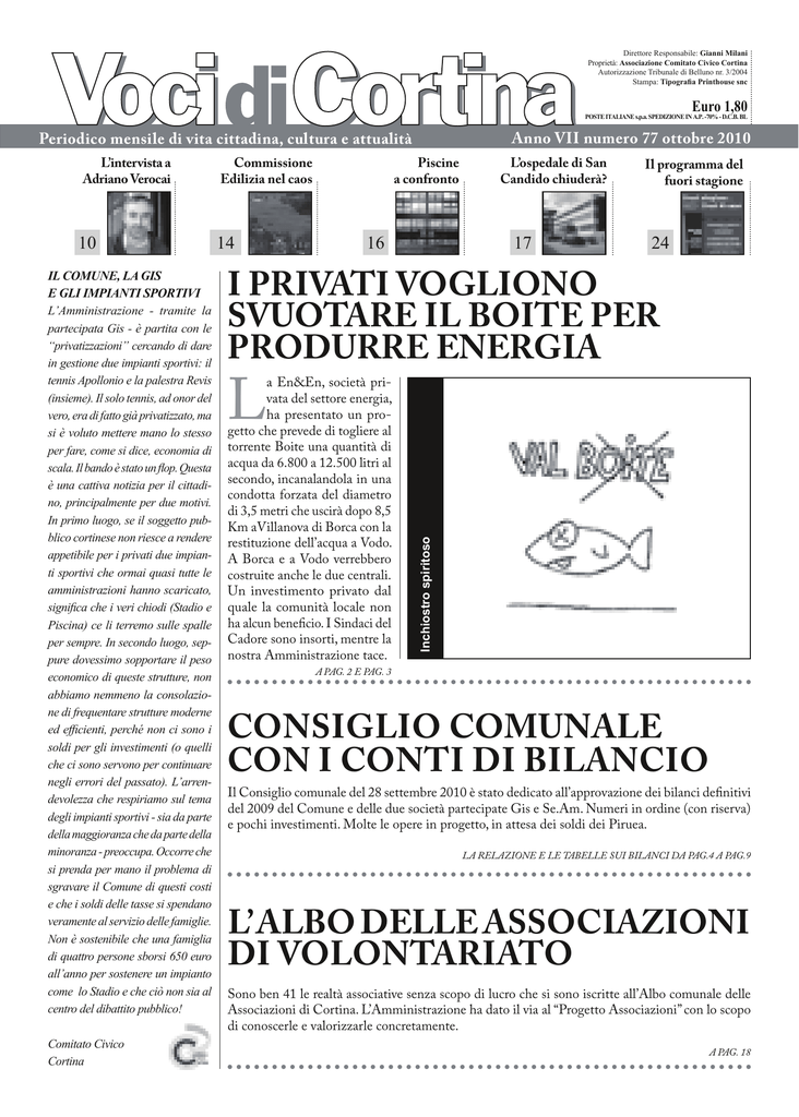 Direttore Responsabile: Gianni Milani Proprietà: Associazione Comitato Civico Cortina Autorizzazione Tribunale di Belluno nr. 3/2004 Stampa: Tipografia Printhouse snc Euro 1,80 POSTE ITALIANE s.p.a. SPEDIZIONE IN A.P. -70% - D.C.B. BL Periodico mensile di vita cittadina, cultura e attualità 10 IL COMUNE, LA GIS E GLI IMPIANTI SPORTIVI L’Amministrazione - tramite la partecipata Gis - è partita con le “privatizzazioni” cercando di dare in gestione due impianti sportivi: il tennis Apollonio e la palestra Revis (insieme). Il solo tennis, ad onor del vero, era di fatto già privatizzato, ma si è voluto mettere mano lo stesso per fare, come si dice, economia di scala. Il bando è stato un flop. Questa è una cattiva notizia per il cittadino, principalmente per due motivi. In primo luogo, se il soggetto pubblico cortinese non riesce a rendere appetibile per i privati due impianti sportivi che ormai quasi tutte le amministrazioni hanno scaricato, significa che i veri chiodi (Stadio e Piscina) ce li terremo sulle spalle per sempre. In secondo luogo, seppure dovessimo sopportare il peso economico di queste strutture, non abbiamo nemmeno la consolazione di frequentare strutture moderne ed efficienti, perché non ci sono i soldi per gli investimenti (o quelli che ci sono servono per continuare negli errori del passato). L’arrendevolezza che respiriamo sul tema degli impianti sportivi - sia da parte della maggioranza che da parte della minoranza - preoccupa. Occorre che si prenda per mano il problema di sgravare il Comune di questi costi e che i soldi delle tasse si spendano veramente al servizio delle famiglie. Non è sostenibile che una famiglia di quattro persone sborsi 650 euro all’anno per sostenere un impianto come lo Stadio e che ciò non sia al centro del dibattito pubblico! Comitato Civico Cortina Commissione Edilizia nel caos 14 Piscine a confronto 16 L’ospedale di San Candido chiuderà? 17 Il programma del fuori stagione 24 I PRIVATI VOGLIONO SVUOTARE IL BOITE PER PRODURRE ENERGIA L a En&En, società privata del settore energia, ha presentato un progetto che prevede di togliere al torrente Boite una quantità di acqua da 6.800 a 12.500 litri al secondo, incanalandola in una condotta forzata del diametro di 3,5 metri che uscirà dopo 8,5 Km aVillanova di Borca con la restituzione dell’acqua a Vodo. A Borca e a Vodo verrebbero costruite anche le due centrali. Un investimento privato dal quale la comunità locale non ha alcun beneficio. I Sindaci del Cadore sono insorti, mentre la nostra Amministrazione tace. Inchiostro spiritoso L’intervista a Adriano Verocai Anno VII numero 77 ottobre 2010 A PAG. 2 E PAG. 3 CONSIGLIO COMUNALE CON I CONTI DI BILANCIO Il Consiglio comunale del 28 settembre 2010 è stato dedicato all’approvazione dei bilanci definitivi del 2009 del Comune e delle due società partecipate Gis e Se.Am. Numeri in ordine (con riserva) e pochi investimenti. Molte le opere in progetto, in attesa dei soldi dei Piruea. LA RELAZIONE E LE TABELLE SUI BILANCI DA PAG.4 A PAG.9 L’ Albo delle Associazioni DI VOLONTARIATO Sono ben 41 le realtà associative senza scopo di lucro che si sono iscritte all’Albo comunale delle Associazioni di Cortina. L’Amministrazione ha dato il via al “Progetto Associazioni” con lo scopo di conoscerle e valorizzarle concretamente. A PAG. 18 2 Voci di Cortina Numero 77 ottobre 2010 I PRIVATI VOGLIONO SVUOTARE IL BOITE PER PRODURRE ENERGIA Un danno ambientale enorme per Cortina e per il Cadore. La nostra Amministrazione tace, mentre gli altri Sindaci insorgono. Una battaglia per non far depredare il nostro territorio a cura del Comitato Civico Cortina SFRUTTARE L’ACQUA I vantaggi economici garantiti dallo Stato per i produttori di energia elettrica da fonti rinnovabili ha stimolato in questi ultimi anni una nuova “corsa all’oro”, soprattutto nel settore dell’energia idroelettrica. Gli anni ’50 e ’60 del secolo scorso furono caratterizzati da uno sfruttamento massiccio della montagna per realizzare dighe e condotte, con raccolta di acqua che, esaurito il suo potere di spinta per generare elettricità, veniva poi dirottata verso la pianura per irrigare i campi e per sostenere l’industria. La montagna veneta fu sfruttata appieno, e ne sono testimoni le molte centrali presenti sul nostro territorio, i laghi artificiali e le condotte forzate che attraversano le montagne. Dopo la sciagura del Vajont la corsa all’idroelettrico si era un po’ fermata, in parte perché gli impianti più redditizi erano già stati realizzati, in parte perché l’opinione pubblica era divenuta più sensibile ai temi della sicurezza e dell’ambiente, soprattutto dove gli eccessi di sfruttamento potevano portare alla perdita di molte vite umane. Le attuali necessità di energia da fonti diverse dai combustibili fossili ha riportato l’interesse verso l’idroelettrico, aprendo un mercato fino a prima limitato ai soggetti pubblici: i vantaggi economici garantiti dall’applicazione del Protocollo di Kyoto ha quindi reso interessante un nuovo sfruttamento del territorio montano per produrre energia, andando a raccogliere l’acqua da torrenti e fino a prima poco interessanti per questi scopi. l’economia. L’aspetto secondario di questa scelta è però un maggiore sfruttamento del territorio, un danno ambientale laddove vengono realizzati gli impianti e un’operazione di “rapina” da parte dei privati a danno delle comunità locali in cui scorrono le acque, comunità che vengono preferibilmente tenute a margine dell’operazione e che – se ciò non è possibile – vengono remunerate con qualche spicciolo. Esistono esempi di comunità che hanno saputo mercanteggiare fette anche consistenti dei redditi prodotti dai nuovi impianti, sistemando un po’ le casse dei Comuni, ma la logica dell’investitore privato punta sostanzialmente al profitto, che malvolentieri divide con gli altri. Il Boite a Socus Negli ultimi cinque anni solo in Pr