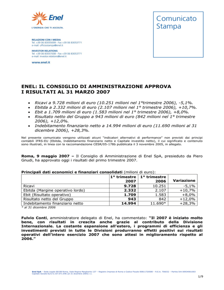 ENEL: IL CONSIGLIO DI AMMINISTRAZIONE APPROVA I RISULTATI AL 31 MARZO 2007 • • • • • Ricavi a 9.728 milioni di euro (10.251 milioni nel 1°trimestre 2006), -5,1%. Ebitda a 2.332 milioni di euro (2.107 milioni nel 1° trimestre 2006), +10,7%. Ebit a 1.709 milioni di euro (1.583 milioni nel 1° trimestre 2006), +8,0%. Risultato netto del Gruppo a 943 milioni di euro (842 milioni nel 1° trimestre 2006), +12,0%. Indebitamento finanziario netto a 14.994 milioni di euro (11.690 milioni al 31 dicembre 2006), +28,3%. Nel presente comunicato vengono utilizzati alcuni “indicatori alternativi di performance” non previsti dai principi contabili IFRS-EU (Ebitda, Indebitamento finanziario netto e Capitale investito netto), il cui significato e contenuto sono illustrati, in linea con la raccomandazione CESR/05-178b pubblicata il 3 novembre 2005, in allegato. Roma, 9 maggio 2007 – Il Consiglio di Amministrazione di Enel SpA, presieduto da Piero Gnudi, ha approvato oggi i risultati del primo trimestre 2007. Principali dati economici e finanziari consolidati (milioni di euro): 1° trimestre 1° trimestre 2007 2006 Ricavi 9.728 10.251 Ebitda (Margine operativo lordo) 2.332 2.107 Ebit (Risultato operativo) 1.709 1.583 Risultato netto del Gruppo 943 842 Indebitamento finanziario netto 14.994 11.690* Variazione -5,1% +10,7% +8,0% +12,0% +28,3% * al 31 dicembre 2006 Fulvio Conti, amministratore delegato di Enel, ha commentato: “Il 2007 è iniziato molto bene, con risultati in crescita anche grazie al contributo della Divisione Internazionale. La costante espansione all’estero, i programmi di efficienza e gli investimenti previsti in tutte le Divisioni produrranno effetti positivi sui risultati operativi dell’intero esercizio 2007 che sono attesi in miglioramento rispetto al 2006.” Enel SpA – Sede Legale 00198 Roma, Viale Regina Margherita 137 – Registro Imprese di Roma e Codice Fiscale 00811720580 – R.E.A. 756032 – Partita IVA 00934061003 Capitale Sociale Euro 6.157.071.646 (al 31 dicembre 2005) i.v. 1/9 DATI OPERATIVI Vendite di energia elettrica e gas Le vendite di energia del Gruppo Enel ai clienti finali nel primo trimestre 2007 si attestano a 43,1 TWh di cui 35,4 TWh in Italia e 7,7 TWh all’estero. In Italia, le vendite complessive di elettricità ai clienti finali sono diminuite del 5,6%. In particolare le vendite sul mercato vincolato scendono da 32,6 TWh dei primi tre mesi del 2006 a 27,1 TWh del primo trimestre 2007(-16,9%) a causa della maggiore liberalizzazione del mercato. Per converso crescono le vendite sul mercato libero che passano da 4,9 TWh a 8,3 TWh (+69,4%). All’estero le vendite di elettricità passano da 2,5 TWh a 7,7 TWh con un incremento del 208% da attribuire prevalentemente all’acquisizione della società RusEnergosbyt. Nel mercato del gas, Enel prosegue la sua strategia di focalizzazione sui clienti della piccola e media impresa (consumi inferiori a 200.000 metri cubi annui). Tale strategia ha comportato un aumento del 6,4% del numero dei clienti (2.346.990 nel primo trimestre 2007), pur in presenza di una contrazione dei volumi venduti passati da 2,1 miliardi di metri cubi nei primi tre mesi del 2006 a 1,8 miliardi di metri cubi nel primo trimestre 2007, pari al 14,3% a fronte di una riduzione della domanda di gas del segmento residenziale e commerciale di oltre il 20%. Produzione di energia elettrica La produzione netta del Gruppo Enel nei primi tre mesi del 2007 è pari a 31,6 TWh di cui 22,3 TWh in Italia e 9,3 TWh all’estero. In Italia le centrali Enel hanno prodotto 22,3 TWh nel primo trimestre 2007 rispetto ai 28,6 TWh dello stesso periodo del 2006 (-22,0%). Tale riduzione è dovuta principalmente alla minore richiesta di energia elettrica (-1,6%) e alla crescita delle importazioni nette (+76,7%). In particolare si è registrata una minor produzione termoelettrica (-5,5 TWh) e idroelettrica (0,8 TWh). La produzione netta di Enel all’estero passa dai 3,4 TWh del primo trimestre 2006 ai 9,3 TWh dei primi tre mesi del 2007. Tale incremento deriva principalmente dal consolidamento di Slovenske Elektrarne e di Enel Panama. La produzione netta delle centrali di Enel in Italia e all’estero è generata per il 13,0% da fonte nucleare, per il 28,4% da fonti rinnovabili (idroelettrico, eolico, geotermico e biomasse) e per il 58,6% da fonte termoelettrica. Distribuzione di energia elettrica e gas L’energia elettrica distribuita dal Gruppo Enel si attesta a 66,1 TWh di cui 62,9 TWh in Italia e 3,2 TWh all’estero. I volumi di elettricità distribuita da Enel in Italia sono diminuiti del 2,6% riflettendo essenzialmente l’andamento della domanda di energia elettrica in Italia. L’elettricità distribuita all’estero è pari a 3,2 TWh in linea con il primo trimestre del precedente esercizio. Il gas vettoriato si attesta a 1,4 miliardi di metri cubi, in flessione di 0,4 miliardi di metri cubi rispetto al primo trimestre 2006, prevalentemente a causa del più mite andamento climatico registrato nei primi tre mesi del 2007. 2/9 DATI ECONOMICO-FINANZIARI I risultati consolidati dei primi tre mesi del 2007 I Ricavi del primo trimestre 2007 ammontano a 9.728 milioni di euro, in calo del 5,1%, rispetto a quelli del corrispondente periodo del 2006 (10.251 milioni di euro). In particolare, i ricavi della Divisione Internazionale, passano da 607 milioni di euro dei primi tre mesi del 2006 a 1.059 milioni di euro del primo trimestre 2007 (+74,5%), mentre i ricavi della Divisione Generazione ed Energy Management Italia e della Divisione Mercato Italia registrano una contrazione pari, rispettivamente, a 513 milioni di euro (-11,3%) e 274 milioni di euro (-4,7%). L’Ebitda (margine operativo lordo) registra un significativo incremento (+10,7%), passando dai 2.107 milioni di euro del primo trimestre 2006 ai 2.332 milioni di euro del primo trimestre 2007. In particolare, l’Ebitda della Divisione Internazionale, pari a 317 milioni di euro, cresce dell’8