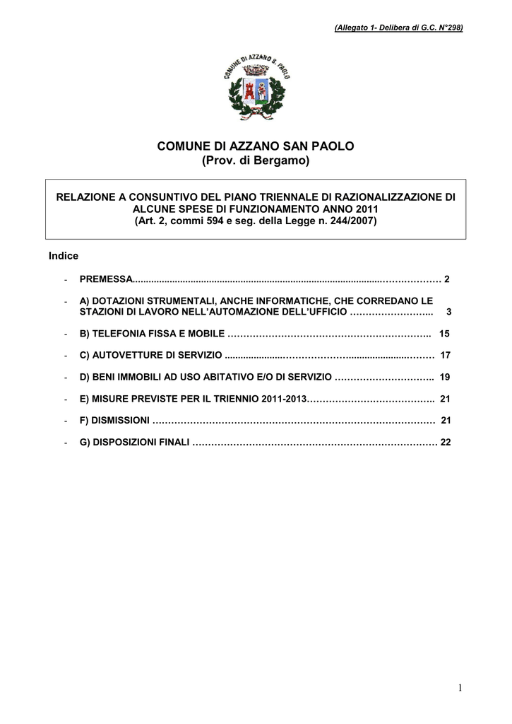 (Allegato 1- Delibera di G.C. N°298) COMUNE DI AZZANO SAN PAOLO (Prov. di Bergamo) RELAZIONE A CONSUNTIVO DEL PIANO TRIENNALE DI RAZIONALIZZAZIONE DI ALCUNE SPESE DI FUNZIONAMENTO ANNO 2011 (Art. 2, commi 594 e seg. della Legge n. 244/2007) Indice - PREMESSA...............................................................................................…….………… 2 - A) DOTAZIONI STRUMENTALI, ANCHE INFORMATICHE, CHE CORREDANO LE STAZIONI DI LAVORO NELL’AUTOMAZIONE DELL’UFFICIO ……………………... 3 - B) TELEFONIA FISSA E MOBILE ……………………………………………………….. 15 - C) AUTOVETTURE DI SERVIZIO ......................…………………......................……… 17 - D) BENI IMMOBILI AD USO ABITATIVO E/O DI SERVIZIO ………………………….. 19 - E) MISURE PREVISTE PER IL TRIENNIO 2011-2013………………………………….. 21 - F) DISMISSIONI ……………………………………………………………………………… 21 - G) DISPOSIZIONI FINALI …………………………………………………………………… 22 1 Premessa La legge 24 dicembre 2007, n. 244 (Legge Finanziaria 2008) all’articolo 2 comma 594 prevede testualmente: “Ai fini del contenimento delle spese di funzionamento delle proprie strutture, le amministrazioni pubbliche di cui all’articolo 1, comma 2 del decreto legislativo 30 marzo 2001, n. 165 adottano piani triennali per le misure finalizzate alla razionalizzazione dell’utilizzo: a) delle dotazioni strumentali, anche informatiche, che corredano le stazioni di lavoro nell’automazione dell’ufficio; b) delle autovetture di servizio, attraverso il ricorso, previa verifica di fattibilità, a mezzi alternativi di trasporto, anche cumulativo; c) dei beni immobili ad uso abitativo o di servizio, con esclusioni di beni infrastrutturali. Il successivo comma 595 prevede che:“ Nei piani di cui alla lettera a) del comma 594 siano altresì indicate le misure dirette a circoscrivere l’assegnazione di apparecchiature di telefonia mobile ai soli casi in cui il personale debba assicurare, per esigenze di servizio pronta e costante reperibilità e limitatamente al periodo necessario allo svolgimento delle particolari attività che ne richiedono l’uso, individuando nel rispetto della normativa sulla tutela della riservatezza dei dati personali, forme di verifica, anche a campione, circa il corretto utilizzo delle relative utenze”. Il comma 596 prevede che qualora vi siano dismissioni strumentali le stesse siano accompagnate da documenti finalizzati alla dimostrazioni della congruenza dell’operazione in termini di costi/benefici; Il comma 597 prevede la trasmissione di consuntivo annuale da inviare alla competente sezione nella Corte dei Conti, mentre il comma 598 prevede adeguate forme di pubblicità di tale piano . 2 A) DOTAZIONI STRUMENTALI, ANCHE INFORMATICHE, CHE CORREDANO LE STAZIONI DI LAVORO NELL’AUTOMAZIONE DELL’UFFICIO: A seguito di una preliminare ricognizione della situazione esistente con riferimento alla verifica dell'idoneità delle dotazioni strumentali, anche informatiche, che corredano le stazioni di lavoro nell'automazione d'ufficio, si ritiene che non sussistano ridondanze e/o sprechi nell'ambito delle dotazioni strumentali di cui trattasi. Le dotazioni strumentali anche informatiche che corredano le stazioni di lavoro degli uffici dell’Ente, sia a livello direzionale che operativo, sono, in linea generale, così composte: - un personal computer con relativo sistema operativo e con gli applicativi tipici dell’automazione d’ufficio; - un telefono in dotazione ad ogni postazione di lavoro connesso alla centrale telefonica; - un collegamento a una stampante individuale e/o di rete presente nell’ufficio o in un’area di lavoro. Il numero di fax è limitato a 3 di cui: - uno presso la sede Municipale di Piazza IV Novembre n°23, ; - n°2 presso la sede distaccata c/o Centro Servizi Marchesi, rispettivamente n°1 c/o Settore Polizia Locale e n°1 c/o Settore Servizi Demografici Gli uffici sono altresì dotati di fotocopiatrici collocate nelle varie aree di lavoro. I dipendenti sono altresì dotati delle attrezzature e vestiario richiesto, ai sensi del D.Lgs. 81/2008 emanato in Attuazione dell'articolo 1 della legge 3 agosto 2007, n.123, in materia di tutela della salute e della sicurezza nei luoghi di lavoro. 3 A.1) DOTAZIONI INFORMATICHE HARDWARE E SOFTWARE Il Comune si avvale, per la gestione ordinaria delle attività lavorative, di un sistema informativo basato su tecnologie informatiche hardware e software di ultima generazione corredate di tutto quanto necessario alla salvaguardia, alla protezione ed alla disponibilità dei dati secondo quanto è previsto dal D.Lgs 196/2003. L’architettura informatica del comune di Azzano San Paolo è strutturata in modo tale che tutti i dati di rilevanza critica all’interno dell’organizzazione siano immagazzinati, custoditi e salvaguardati all’interno di elaboratori con funzionalità e capacità di server, siti in posizione “logica” centrale rispetto agli altri computer, realizzando quella che tecnicamente viene definita una rete informatica in modalità client/server. Questa scelta permette da un lato di scaricare di importanza le risorse hardware client in dotazione agli operatori comunali e, dall’altro, di avere un maggiore controllo dei dati e del loro stato in quanto facenti capo ad una struttura concordata e monitorata. Questa scelta, di contro, richiede un’elevata attenzione ed una concentrazione degli investimenti sulle apparecchiature hardware e sui software di gestione dei server in quanto essi divengono apparati critici nell’erogazione di servizi e di informazioni sulla rete. Per le ragioni sopra esposte si ritiene di concentrare l’analisi dei rischi delle risorse hardware e software solo sui server ed eventualmente su PC per i quali si rileva una criticità funzionale. Le ris