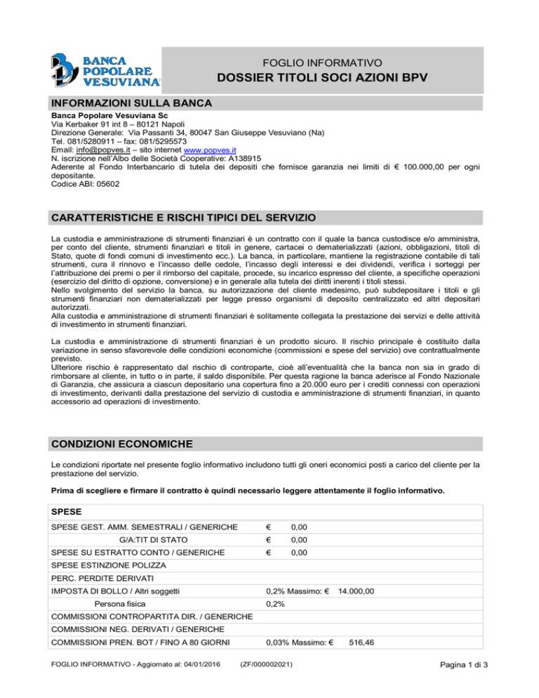 FOGLIO INFORMATIVO DOSSIER TITOLI SOCI AZIONI BPV INFORMAZIONI SULLA BANCA Banca Popolare Vesuviana Sc Via Kerbaker 91 int 8 – 80121 Napoli Direzione Generale: Via Passanti 34, 80047 San Giuseppe Vesuviano (Na) Tel. 081/5280911 – fax: 081/5295573 Email: [email protected] – sito internet www.popves.it N. iscrizione nell’Albo delle Società Cooperative: A138915 Aderente al Fondo Interbancario di tutela dei depositi che fornisce garanzia nei limiti di € 100.000,00 per ogni depositante. Codice ABI: 05602 CARATTERISTICHE E RISCHI TIPICI DEL SERVIZIO La custodia e amministrazione di strumenti finanziari è un contratto con il quale la banca custodisce e/o amministra, per conto del cliente, strumenti finanziari e titoli in genere, cartacei o dematerializzati (azioni, obbligazioni, titoli di Stato, quote di fondi comuni di investimento ecc.). La banca, in particolare, mantiene la registrazione contabile di tali strumenti, cura il rinnovo e l’incasso delle cedole, l’incasso degli interessi e dei dividendi, verifica i sorteggi per l’attribuzione dei premi o per il rimborso del capitale, procede, su incarico espresso del cliente, a specifiche operazioni (esercizio del diritto di opzione, conversione) e in generale alla tutela dei diritti inerenti i titoli stessi. Nello svolgimento del servizio la banca, su autorizzazione del cliente medesimo, può subdepositare i titoli e gli strumenti finanziari non dematerializzati per legge presso organismi di deposito centralizzato ed altri depositari autorizzati. Alla custodia e amministrazione di strumenti finanziari è solitamente collegata la prestazione dei servizi e delle attività di investimento in strumenti finanziari. La custodia e amministrazione di strumenti finanziari è un prodotto sicuro. Il rischio principale è costituito dalla variazione in senso sfavorevole delle condizioni economiche (commissioni e spese del servizio) ove contrattualmente previsto. Ulteriore rischio è rappresentato dal rischio di controparte, cioè all’eventualità che la banca non sia in grado di rimborsare al cliente, in tutto o in parte, il saldo disponibile. Per questa ragione la banca aderisce al Fondo Nazionale di Garanzia, che assicura a ciascun depositario una copertura fino a 20.000 euro per i crediti connessi con operazioni di investimento, derivanti dalla prestazione del servizio di custodia e amministrazione di strumenti finanziari, in quanto accessorio ad operazioni di investimento. CONDIZIONI ECONOMICHE Le condizioni riportate nel presente foglio informativo includono tutti gli oneri economici posti a carico del cliente per la prestazione del servizio. Prima di scegliere e firmare il contratto è quindi necessario leggere attentamente il foglio informativo. SPESE SPESE GEST. AMM. SEMESTRALI / GENERICHE G/A:TIT DI STATO SPESE SU ESTRATTO CONTO / GENERICHE € 0,00 € 0,00 € 0,00 SPESE ESTINZIONE POLIZZA PERC. PERDITE DERIVATI IMPOSTA DI BOLLO / Altri soggetti 0,2% Massimo: € Persona fisica 14.000,00 0,2% COMMISSIONI CONTROPARTITA DIR. / GENERICHE COMMISSIONI NEG. DERIVATI / GENERICHE COMMISSIONI PREN. BOT / FINO A 80 GIORNI FOGLIO INFORMATIVO - Aggiornato al: 04/01/2016 0,03% Massimo: € (ZF/000002021) 516,46 Pagina 1 di 3 DA 81 A 170 GIORNI 0,05% Massimo: € DA 171 A 330 GIORNI 0,1% Massimo: € DA 331 A 5 ANNI COMMISSIONI RACCOLTA/Dipartimentale/Euromot/Azioni Dipartimentale/Euromot/Obbligazionario 0,15% Massimo: € 1% Minimo: € 0,5% Minimo: € Dipartimentale/Euro TLX/Azioni 1% Minimo: € COMMISSIONI RACCOLTA ORD / Dipartimentale / 0,3% Minimo: € Mercato Azionario It Dipartimentale / Mercato Obbligaz. It 0,3% Minimo: € Dipartimentale/Euro TLX/Obbligazionario 0,5% Minimo: € 516,46 516,46 516,46 30,00 10,33 30,00 10,33 Massimo: € 516,46 10,33 Massimo: € 516,46 10,33 Internet / Mercato Azionario It 0,25% Minimo: € 10,33 Internet / Mercato Obbligaz. It 0,25% Minimo: € 10,33 Internet/Euromot/Azioni 0,5% Minimo: € 10,33 COMMISSIONE SOTTOSCRIZIONE TIT / GENERICHE Internet/Euromot/Obbligazionario 0,35% Minimo: € 10,33 SPESE MATERIALITÀ Internet/Euro TLX/Azioni 0,5% Minimo: € SPESE DI NEGOZIAZIONE / Revoca eseguita Dipartimentale / Eseguito normale contro T € 0,00 € 2,58 Internet/Euro TLX/Obbligazionario 0,35% Minimo: € Dipartimentale/Eseguito normal/Pronti € 5,16 Dipartimentale / Non eseguito normale € 0,00 Internet / Eseguito normale € 2,58 Internet / Non eseguito normale € SPESE OPERAZIONI SUL CAPITALE / Adesione € aum.cap. pagamento SPESE OPERAZ. DI GESTIONE / GENERICHE 0,00 10,33 10,33 5,99 RECUPERO SPESE / GENERICHE SPESE SU RIMBORSI / Stacco cedole € 3,01 Stacco dividendi € 3,01 Rimborso titoli € 3,01 COMMISS. RACCOLTA ORDINI BOT / Dipartimentale Internet 0,3% Minimo: € 0,25% Minimo: € 10,33 5,00 Massimo: € 516,46 COMM. PER SPEZZATURE CTP / GENERICHE COMM. PER SPEZZATURE RO / GENERICHE SPESE OBB. PROPRIE IN POLIZZA € 0,00 SPESE SU RIMBORSI IN VALUTA / Stacco cedole € 3,01 COMMISS. OBB. PROPRIA EMISSION / GENERICHE € 0,00 Stacco dividendi € 3,01 Rimborso titoli € 3,01 TRASP. DOCUMENTAZ. PERIODICA / GENERICHE € 1,50 TRASP. DOCUMENTAZ. VARIAZIONI / POSTA € 1,50 STAMPA ELENCO CONDIZIONI TRASP. INFO PRECONTRATTUALE SPESA COMUNICAZIONE / GENERICHE INVIO RACCOMANDATA DORMIENTI FOGLIO INFORMATIVO - Aggiornato al: 04/01/2016 (ZF/000002021) Pagina 2 di 3 GIORNI GIORNI VALUTA RIMBORSO CEDOLE In giornata GIORNI VALUTA RIMBORSO DIVID. In giornata GIORNI VALUTA RIMBORSO TITOLI In giornata RECESSO E RECLAMI Recesso dal contratto Il cliente può recedere dal contratto in qualsiasi momento, con preavviso di almeno 15 giorni da fornire mediante lettera raccomandata A.R.,, senza penalità e senza spese di chiusura, tranne quelle sostenute dalla banca in relazione a un servizio aggiuntivo, qualora esso richieda l’intervento di un soggetto terzo e a condizione che tali spese siano documentate e riportate nella documentazione di trasparenza prevista dalla disciplina vigente. Tempi massimi 