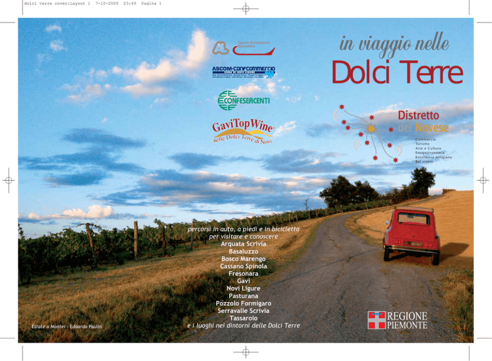 dolci terre cover:Layout 1 7-10-2009 23:49 Pagina 1 in viaggio nelle ZONA DI NOVI LIGURE Gavi - Serravalle Scrivia - Arquata Scrivia - Pozzolo Formigaro Valli Borbera e Spinit - Valle Scrivia - Val Lemme - Val d’Orba nelle Estate a Montei - Edoardo Paulin Dolci Terre d Dolci Terre Distretto del Novese i Novi percorsi in auto, a piedi e in bicicletta per visitare e conoscere Arquata Scrivia Basaluzzo Bosco Marengo Cassano Spinola Fresonara Gavi Novi Ligure Pasturana Pozzolo Formigaro Serravalle Scrivia Tassarolo e i luoghi nei dintorni delle Dolci Terre C o m m e rc i o Tu r i s m o Arte e Cultura Enogastronomia Eccellenza Artigiana Bel vivere dolci terre cover:Layout 1 7-10-2009 23:50 Pagina 2 in viaggio nelle Dolci Terre guida turistica del C o m m e rc i o Tu r i s m o Arte e Cultura Enogastronomia Eccellenza Artigiana Bel vivere www.distrettonovese.it [email protected] TORINO ALESSANDRIA MILANO INFO IAT di Novi Ligure Viale dei Campionissimi, 2 - Novi Ligure Tel. +39 0143 72585 - E-mail: [email protected] Ufficio Informazioni Turistiche Serravalle Designer Outlet Via della Moda, 1 - Serravalle Scrivia Tel. +39 0143 609015 E-mail: [email protected] Consorzio il Cuore di Novi Corso Marenco 103 - Novi Ligure Tel. +39 0143 322118 - E-mail: [email protected] Urp di Novi Ligure Tel. +39 0143 772277 - E-mail: [email protected] Piemonte ciclabile www.piemonteciclabile.it E-mail: [email protected] Comunità Montana Val Borbera e Spinti www.valborbera-news.com E-mail: [email protected] Comunità Montana Alta Val Lemme Alto Ovadese www.cmlemmeovadese.it E-mail: [email protected] Parco Naturale delle Capanne di Marcarolo www.parcocapanne.it GENOVA PORTOFINO distretto novese:Copia di Layout 2 7-10-2009 23:44 Pagina 1 da Novi Ligure a Bosco Marengo Luigi Grasso L e Dolci Terre di Novi hanno nel paesaggio la loro principale attrattiva, nascosta ai viaggiatori che le lambiscono viaggiando nelle autostrade che contornano il territorio del Distretto Novese. La storia ha lasciato tracce evidenti di quanto è accaduto nei secoli in questa terra di confine, crocevia di culture, luogo di scambio, di incontro e di scontro. Novi Ligure è la città centrale per un viaggio nelle Dolci Terre. Lasciamoci guidare dalla toponomastica, da quei personaggi il cui ingegno ha creato per Novi un posto nella storia: Niccolò Girardengo, il tipografo novese che a Venezia imparò l’uso del torchio per stampa, pubblicando il suo primo libro nel 1479. Rientrato a casa nel 1484 continuò a diffondere l’arte che ha rivoluzionato la comunicazione. La via principale è a lui dedicata e vi si affacciano i palazzi dipinti, tra i simboli distintivi di Novi perché manifestazione evidente della sua anima genovese. Nel Seicento furono i banchieri genovesi a introdurre la moda delle facciate dipinte ad affresco: lungo via Roma, via Girardengo, via Marconi e via Gramsci è possibile ammirare stili e tecniche diverse, dal tardo rinascimento al liberty passando per il barocco. In queste case nobili e alto-borghesi si sviluppò l’origi- distretto novese:Copia di Layout 2 7-10-2009 23:44 Pagina 2 nalità della cucina novese, ricca di oltre trecento ricette. I corzetti, dischi di pasta tagliati con un originale attrezzo che stampava anche lo stemma di famiglia, richiedono un pesto di maggiorana d’estate o un ragù di salsiccia e funghi d’inverno. I gnocchetti in brodo erano la pasta dei pranzi di festa, fatti a mano uno ad uno, nelle veglie serali, erano il complemento del brodo di gallina o cappone, un mangiare davvero di lusso. Gli agnolotti invece erano preparati il giorno dopo la festa, per usare nel ripieno gli avanzi di carni e verdure, e solo successivamente divennero un piatto principale, sovente affogati nel vino dolcetto. Percorrendo via Girardengo si incontra il Teatro Romualdo Marenco, dedicato al famoso musicista che compose l’Excelsior e i balli che hanno fatto da colonna sonora alla Belle Epoque. La tradizione musicale e quella teatrale hanno radici profonde a Novi, celebrate ogni anno nel Festival Marenco, dedicato alle bande musicali. Poco dopo il Teatro, a sinistra, un breve vicolo conduce al palazzo comunale in via Paolo Giacometti, famoso commediografo dell’Ottocento; proseguendo si giunge in piazza Dellepiane dominata dalla splendida Collegiata di Santa Maria Assunta. Siamo nel cuore di Novi e qui la storia svolta in un’altra direzione, quella dello sviluppo industriale, dalle filande alla produzione dei Nel centro storico di Novi i palazzi più belli sono legati ai nomi delle grandi famiglie genovesi: Spinola, Balbi, Franzosi-Doria, Gentile, Tursi, Pavese, Durazzo, CambiasoNegrotto. “In piazza Dellepiane palazzo Negroni presenta la facciata più bella della città con due meridiane che segnano l’ora francese e l’ora italica” (da Le Vie del Gavi, Slow Food Editore) Giuseppe Perrone Corzetti al ragù di salsiccia e funghi distretto novese:Copia di Layout 2 7-10-2009 23:44 Pagina 3 Isidoro Parodi velluti (Dellepiane, appunto), dalla metallurgia al cioccolato. Guardando in su si scorge quel che resta del Castello, la torre del Barbarossa risalente al 1233, sulla sommità del Parco che sovrasta la Città. Il centro di Novi si gira agevolmente a piedi, e offre anche buone occasioni per godere del miglior “street food” di stile genovese: la focaccia novese (una squisitezza che esce calda ad ogni ora del giorno dai forni cittadini, spennellata di olio extravergine, anche nella versione “stirata”) e la farinata (pastella di farina di ceci, acqua e olio, cotta in forno nella apposita teglia rotonda) da mangiare sottile e caldissima. Prima di spostarsi verso altre destinazioni, è d’obbligo visitare l’Oratorio di Santa Maria Maddalena in Via G.C. Abba, per il suo Calvario ligneo di fine Cinquecento composto da 21 statue a grandezza naturale e per il gruppo scultoreo in terracotta databile XV-XVI. In direzione Cassano Spinola (vedi altro itinerario) merita una sosta la Pieve S. Maria del XII 