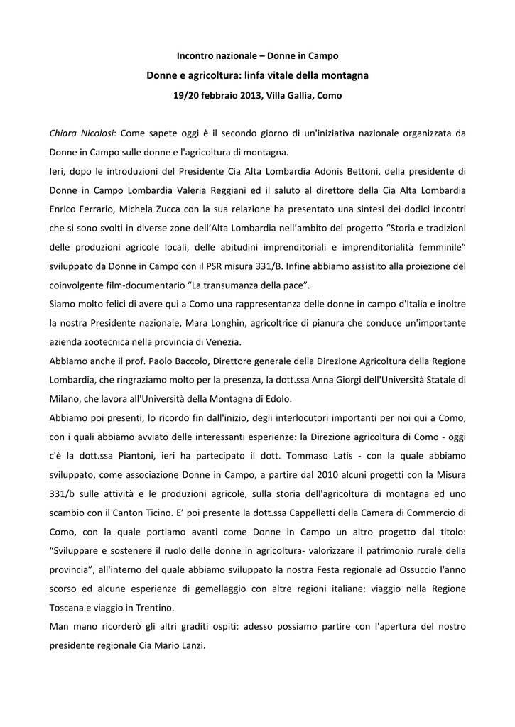 Incontro nazionale – Donne in Campo Donne e agricoltura: linfa vitale della montagna 19/20 febbraio 2013, Villa Gallia, Como Chiara Nicolosi: Come sapete oggi è il secondo giorno di un'iniziativa nazionale organizzata da Donne in Campo sulle donne e l'agricoltura di montagna. Ieri, dopo le introduzioni del Presidente Cia Alta Lombardia Adonis Bettoni, della presidente di Donne in Campo Lombardia Valeria Reggiani ed il saluto al direttore della Cia Alta Lombardia Enrico Ferrario, Michela Zucca con la sua relazione ha presentato una sintesi dei dodici incontri che si sono svolti in diverse zone dell’Alta Lombardia nell’ambito del progetto “Storia e tradizioni delle produzioni agricole locali, delle abitudini imprenditoriali e imprenditorialità femminile” sviluppato da Donne in Campo con il PSR misura 331/B. Infine abbiamo assistito alla proiezione del coinvolgente film-‐documentario “La transumanza della pace”. Siamo molto felici di avere qui a Como una rappresentanza delle donne in campo d'Italia e inoltre la nostra Presidente nazionale, Mara Longhin, agricoltrice di pianura che conduce un'importante azienda zootecnica nella provincia di Venezia. Abbiamo anche il prof. Paolo Baccolo, Direttore generale della Direzione Agricoltura della Regione Lombardia, che ringraziamo molto per la presenza, la dott.ssa Anna Giorgi dell'Università Statale di Milano, che lavora all'Università della Montagna di Edolo. Abbiamo poi presenti, lo ricordo fin dall'inizio, degli interlocutori importanti per noi qui a Como, con i quali abbiamo avviato delle interessanti esperienze: la Direzione agricoltura di Como -‐ oggi c'è la dott.ssa Piantoni, ieri ha partecipato il dott. Tommaso Latis -‐ con la quale abbiamo sviluppato, come associazione Donne in Campo, a partire dal 2010 alcuni progetti con la Misura 331/b sulle attività e le produzioni agricole, sulla storia dell'agricoltura di montagna ed uno scambio con il Canton Ticino. E’ poi presente la dott.ssa Cappelletti della Camera di Commercio di Como, con la quale portiamo avanti come Donne in Campo un altro progetto dal titolo: “Sviluppare e sostenere il ruolo delle donne in agricoltura-‐ valorizzare il patrimonio rurale della provincia”, all'interno del quale abbiamo sviluppato la nostra Festa regionale ad Ossuccio l'anno scorso ed alcune esperienze di gemellaggio con altre regioni italiane: viaggio nella Regione Toscana e viaggio in Trentino. Man mano ricorderò gli altri graditi ospiti: adesso possiamo partire con l'apertura del nostro presidente regionale Cia Mario Lanzi. Mario Lanzi: Il mio sarà solo un saluto perché purtroppo l'epidemia ci ha colpiti in massa, me e il presidente Politi che avrebbe dovuto concludere ma non ce l'ha fatta a venire. Entrambi volevamo però testimoniare che la Confederazione è partecipe; che è un'iniziativa della Confederazione, discussa sul piano non solo regionale, ma anche nazionale. E riteniamo che questo sia uno degli appuntamenti qualificanti dell'Organizzazione, che recuperano un dibattito importante sia per quest'area della Lombardia che per il sistema nazionale. Ci sono tutta una serie di percorsi su cui la Confederazione sta investendo attraverso le sue associazioni diffuse sul territorio: oggi l'iniziativa è presentata da Donne in Campo, i giovani hanno affrontato un percorso che riguarda le norme della Politica Comune, i pensionati hanno in previsione per il mese prossimo la conferenza di sviluppo dell'associazione. La Direzione è in movimento. Cerchiamo di cogliere quali sono le aspettative degli agricoltori e delle imprese e magari in questi due giorni cerchiamo di produrre qualcosa che rimanga all'Organizzazione da portare avanti nelle agende, nelle istituzioni, nel confronto: tutte le questioni che vengono avanti nei Piani di Sviluppo Rurale, nella riforma della PAC, e -‐ perché no -‐ del nuovo governo regionale che avremo tra qualche settimana. Noi vediamo questi momenti come momenti di studio, di preparazione, anche di recupero di lacune che abbiamo avuto sulla montagna o perché ci siamo occupati in questi anni più di questioni di carattere economico, sociale, meno dal punto di vista storico. Importante sarebbe produrre delle iniziative cercando anche di cogliere quelle che sono le nuove necessità della società civile, che recupera valori importanti, spesso dimenticati, messi in secondo piano o addirittura mortificati come la qualità della vita, dell'ambiente; questioni che dopo un periodo forte di consumismo oggi ritornano al loro posto nella cultura della società. Chiara Nicolosi: Grazie. Volevo dire che in sala c'è anche Anita Tomaszewska, la responsabile del settore Agriturismo dell'Unione Contadini Ticinesi, con la quale tre anni fa abbiamo avviato questa riflessione sulle donne , l’agricoltura e la montagna che poi è proseguita in Trentino e in Toscana. Cominciamo allora con Marta Zampieri, presidente della CIA di Belluno, imprenditrice agricola che gestisce un'innovativa azienda a Zoldo Alto, in provincia di Belluno; come ricordava Lanzi, la Confederazione Italiana Agricoltori ha avviato un gruppo Alta Montagna, infatti anche grazie alle sollecitazioni di Marta questa riflessione sul ruolo dell'agricoltura di montagna, partita da Donne in Campo, è stata ripresa a livello confederale. Come vedrete molte delle agricoltrici che presenteremo oggi hanno più di un impegno e si sono assunte, oltre al loro lavoro aziendale, la responsabilità di portare avanti l'agricoltura, di svilupparla in modo innovativo e di valorizzare e promuovere il ruolo delle donne in agricoltura. Marta Zampieri: Grazie, buongiorno a tutti. Io di solito mi presento come una pazza che ha deciso di allevare capre in un terreno montano. Mi piace dire che sono una montanara per scelta e la mia è stata veramente una scelta ponderata; sono nata a Motta di Livenza che è un paese della bassa pianura perché è a zero sul livello della Livenza e mi sono trasferita nel 1997 a 1300 met