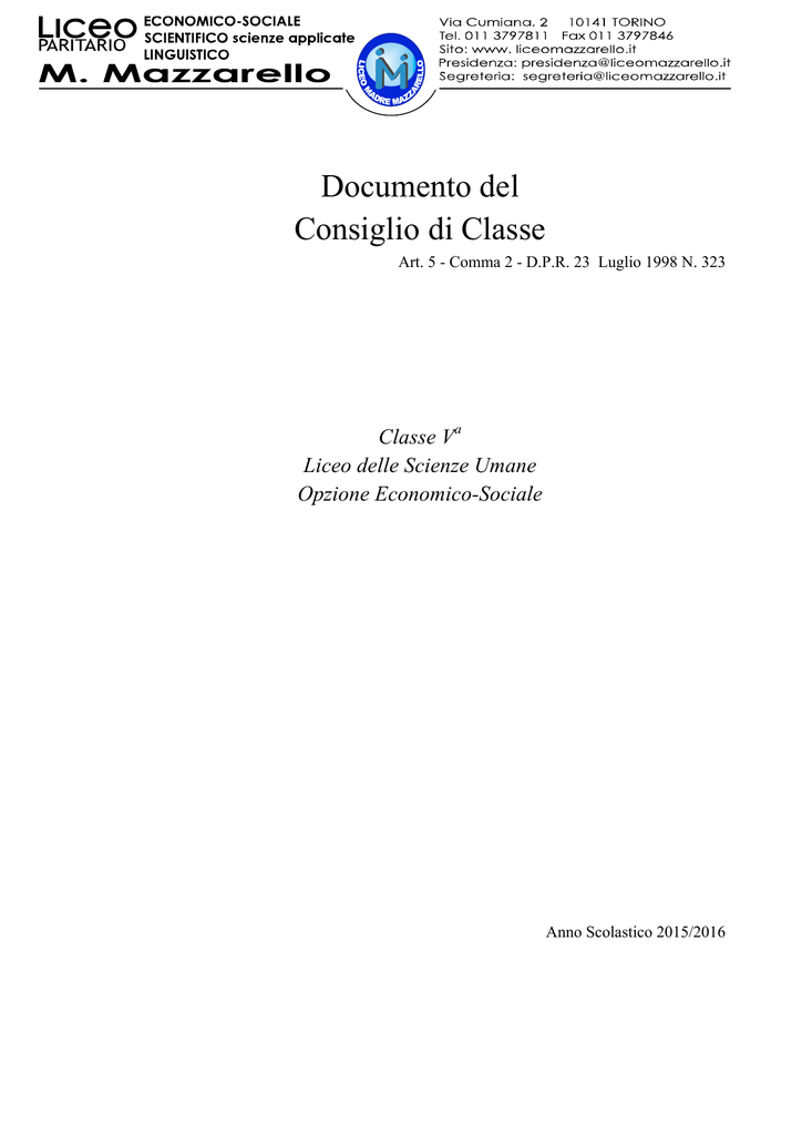 Documento del Consiglio di Classe Art. 5 - Comma 2 - D.P.R. 23 Luglio 1998 N. 323 Classe Va Liceo delle Scienze Umane Opzione Economico-Sociale Anno Scolastico 2015/2016 Anno Scolastico 2015/2016 Indice • Indice…………………………………………………………. 2 • La scuola……………………………………………………... 3 ∼ Un po’ di storia…………………………………………... 3 ∼ Orientamenti ideali………………………………………. 4 ∼ Il Liceo Economico-Sociale……………………………… 6 • La Classe……………………………………………………... 9 • I Docenti……………………………………………………… 14 • Programmazione educativa e didattica………………………. 15 ∼ Obiettivi…………………………………………………. 17 ∼ Attività ………………………………………………….. 18 ∼ Simulazioni prove d’esame……………………………… 20 Valutazione…………………………………………………... 21 ∼ Criteri ……………………………………………………. 22 ∼ Griglie di valutazione…………………………………….. 23 • Tipologia delle prove………………………………………… 24 • Attività di recupero…………………………………………... 24 • Approfondimenti……………………………………………... 25 • Allegati ………………………………………………………. 29 • 2 La scuola Un po’ di storia (estratto del PTOF 2015/2018) La Scuola Superiore “Madre Mazzarello”, che dal 1924 offre, in Torino, un servizio formativo-culturale alla gioventù, si qualifica come un’esperienza educativa dell’Istituto delle Figlie di Maria Ausiliatrice che realizza, nella Chiesa e nella società, un progetto di educazione cristiana nello stile del sistema preventivo di Don Bosco. Fin dall’inizio l’Opera si rivolse alla popolazione delle fasce meno abbienti, con laboratori di sartoria e ricamo per l’apprendistato delle ragazze che, secondo la legislazione allora vigente, potevano essere assunte al lavoro a 12 anni; con una scuola materna per assistere i bambini delle famiglie operaie; con corsi serali a carattere professionale (camiceria maschile, sbalzo di pelle e metallo, economia domestica…). Nell’anno 1931 ha inizio la Scuola Magistrale che ha il merito di aver formato le insegnanti di tutte le Scuole Materne di Torino, con validità riconosciuta dalle competenti Autorità cittadine. Nel 1935 con l’avvio della costruzione di un nuovo complesso scolastico, si dà inizio alla Scuola Elementare e all’Avviamento Professionale che nel 1962 si trasforma in Scuola Media Unica. Nel 1947 una nuova forma di Istruzione Professionale, con un duplice programma culturale e professionale con un apprendistato in ditta, porta all’avvio della Scuola Aziendale di Sartoria Maschile frequentata da una popolazione di profughe prima e immigrate poi, che, dopo tre anni di frequenza, venivano assunte dalla ditta Marus. Nel 1953, viene aperto l’Istituto Professionale femminile per l’abbigliamento, primo in Italia, mentre dieci anni dopo il Magistero Professionale per la Donna viene trasformato in Istituto Tecnico Femminile. Nel 1966, in occasione della consegna della Medaglia d’oro da parte del ministro Oscar Luigi Scalfaro, l’Istituto si presenta come un complesso comprendente: Scuola Materna, Scuola Elementare, Scuola di Avviamento Professionale, Nuova Scuola Media, Scuola Magistrale, 3 Istituto Professionale per l’abbigliamento, Istituto Tecnico Femminile, Corsi serali (taglio, sartoria, camiceri a, ricamo, economia domestica, infermieristica familiare, dattilografia, stenografia, francese, inglese). È affiancato da un vasto complesso di opere sociali giovanili a carattere culturale con un bacino di utenza che va ben oltre i confini del borgo. Dal 1973 dato il numero elevato di attività e di utenza, le Figlie di Maria Ausiliatrice decidono di costituire due plessi scolastici educativi. All’ingresso n.14 si trovano la Scuola Elementare Parificata e la Scuola Media Legalmente riconosciuta, mentre al n.2 la Scuola Materna, la Scuola Magistrale e l’Istituto Tecnico Femminile. Nel 1977 con D.M.15/09/1977 si avvia la Sperimentazione nel Biennio dell’Istituto Tecnico comprendente tre indirizzi: Pedagogico-Sociale, Linguistico-Commerciale, Socio-Sanitario. Nel 1992 l’Istituto Tecnico Femminile viene sostituito da due licei: il Liceo Linguistico Europeo e il Liceo Scientifico Biologico. Nel 1996 viene aggiornato il progetto del Liceo Biologico. Nel 1998 prende avvio il Liceo della Comunicazione con opzione Beni culturali e Sociale. Nel 2003viene aggiunta al Liceo della Comunicazione l’opzione “Civiltà comparate”, che si conclude nel luglio 2008. Nel 2010, in conformità con le indicazioni della legge 133 del 06/08/2008, si avviano le classi 1^ del Liceo Scientifico opzione Scienze applicate, del Liceo Linguistico, del Liceo delle Scienze Umane opzione Economico- Sociale. Orientamenti ideali (estratto del PTOF 2015/2018) Noi educatori religiosi e laici di questa Scuola, ci sentiamo parte viva di un patrimonio educativo e culturale che ha la sua sorgente in Don Bosco e in Madre Mazzarello ed 4 ècaratterizzato dalla scelta di educare i giovani secondo una precisa finalità: aiutarli a diventare “buoni cristiani ed onesti cittadini”. È questa una prospettiva di educazione integrale in cui la fede è l’orizzonte che dà significato all’attività educativa e la vita del giovane è il percorso quotidiano in cui si incarna e si rende credibile la fede. La linea concreta che qualifica il nostro progetto educativo consiste nell’offrire ai giovani esperienze positive capaci di risvegliare e coinvolgere tutte le loro risorse. L’esperienza fondamentale e qualificante è l’attività culturale che ma