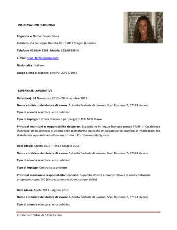 INFORMAZIONI PERSONALI Cognome e Nome: Ferrini Silvia Indirizzo: Via Giuseppe Romita, 88 - 57017 Stagno (Livorno) Telefono: 0586/941398 Mobile: 328/0835840 E-mail: [email protected] Nazionalità : Italiana Luogo e data di Nascita: Livorno, 20/12/1987 ESPERIENZE LAVORATIVE Date(da-a): 24 Novembre 2013 – 28 Novembre 2013 Nome e indirizzo del datore di lavoro: Autorità Portuale di Livorno, Scali Rosciano 7, 57123 Livorno Tipo di azienda o settore: ente pubblico Tipo di impiego: Lettera d’incarico per progetto ITALMED Maroc Principali mansioni e responsabilità ricoperte: Esposizione in lingua francese presso l’ANP di Casablanca (Marocco) dello scenario di utilizzo delle piattaforme logistiche impiegate per lo scambio di informazioni tra stakeholder operanti nel settore marittimo, i Port Community System. Date (da-a): Agosto 2013 – Fino a Maggio 2015 Nome e indirizzo del datore di lavoro: Autorità Portuale di Livorno, Scali Rosciano 7, 57123 Livorno Tipo di azienda o settore: ente pubblico Tipo di impiego: Contratto a progetto Principali mansioni e responsabilità ricoperte: Supporto attività amministrativa e di rendicontazione progetto europeo SIC (sicurezza, innovazione, competitività). Date (da-a): Aprile 2013 – Agosto 2013 Nome e indirizzo del datore di lavoro: Autorità Portuale di Livorno, Scali Rosciano 7, 57123 Livorno Tipo di azienda o settore: ente pubblico Curriculum Vitae di Silvia Ferrini Tipo di impiego: Contratto a progetto Principali mansioni e responsabilità ricoperte: Gestione attività amministrativa e di rendicontazione relativa al progetto europeo ITALMED Maroc. Date (da-a): Febbraio 2013 – Giugno 2013 Nome e indirizzo del datore di lavoro: UPS express agency, c/o Interporto Toscano Vespucci Via delle Colline, 100 Livorno Tipo di azienda o settore: corriere espresso, Logistica Tipo di impiego: Tirocinante Principali mansioni e responsabilità ricoperte: Analisi dei sistemi informatici dell’azienda e proposta di soluzioni economiche ed informatiche idonee a risolvere i principali problemi interni. Sviluppo di un progetto concettuale e logico di CRM Analitico. Date (da-a): Novembre 2011 - Maggio 2012 Nome e indirizzo del datore di lavoro: Comune di Livorno, Piazza del Municipio 1, 57123 Livorno Tipo di azienda o settore: Ricerca Tipo di impiego: Borsista Principali mansioni e responsabilità ricoperte: La borsa di studio vinta con il bando indetto dal Comune di Livorno, quale “Realizzazione di uno studio relativo alla creazione di un laboratorio sulla logistica”, mi ha permesso di porre in essere attività di ricerca soprattutto in attinenza a temi relativi alle TEN-T ed allo studio del Ports in Proximity sia per quanto riguarda il territorio italiano che quello europeo. Date (da-a): Settembre 2009 – Dicembre 2009 Nome e indirizzo del datore di lavoro: AVIS Comunale Livorno, Viale Giosuè Carducci 16, 57124 Livorno Tipo di azienda o settore: ONLUS, Associazione di volontariato Tipo di impiego: Stagista Principali mansioni e responsabilità ricoperte: Analisi della contabilità generale e definizione di azioni correttive per la corretta allocazione delle risorse Curriculum Vitae di Silvia Ferrini ISTRUZIONE E FORMAZIONE Date (da-a): Dicembre 2010 – Ottobre 2013 Nome e tipo di istituto di istruzione o formazione: Corso di laurea magistrale in Informatica Per L’economia e Per L’azienda (Business Informatics) Materie studiate: Gestione dell’innovazione e dei progetti, logistica dei trasporti e della distribuzione, pricing e costing nei servizi, diritto commerciale internazionale e del lavoro, diritto doganale e della concorrenza nei trasporti, governo del territorio, modelli per le decisioni dei sistemi logistici, organizzazione delle aziende industriali, programmazione e algoritmi, reti e servizi, sistemi di movimentazione e stoccaggio, sistemi informatici operazionali, sistemi di supporto alle decisioni (Data warehouse, business intelligence) Certificato o diploma ottenuto: Laurea magistrale Livello nella classificazione: 110/110 Tesi o lavoro conclusivo del corso: “Strategie di miglioramento della customer retention attraverso la metodologia del CRM Analitico” Date (da-a): Settembre 2006 – Luglio 2010 Nome e tipo di istituto di istruzione o formazione: Corso di laurea triennale in Economia e legislazione dei sistemi logistici Materie studiate: Conoscenze informatiche, conoscenze linguistiche (Inglese e Spagnolo), economia aziendale, istituzioni di economia politica, matematica per l’economia e per l’azienda, sociologia generale, storia del commercio e della navigazione, diritto commerciale, economia e gestione delle imprese, organizzazione aziendale, economia industriale e dei trasporti, finanziamenti e assicurazioni di azienda, statistica, business planning, economia delle infrastrutture, gestione finanziaria interna e internazionale, istituzioni di diritto privato, istituzioni di diritto pubblico, diritto amministrativo, marketing dei servizi industriali, pianificazione e controllo aziendale, pricing e costing Certificato o diploma ottenuto: Laurea triennale Livello nella classificazione: 110/110 con lode Tesi o lavoro conclusivo del corso: “La realizzazione del Ponte sullo Stretto di Messina: un’analisi costibenefici” Date (da-a): Settembre 2001 – Luglio 2006 Nome e tipo di istituto di istruzione o formazione: Istituto tecnico commerciale Amerigo Vespucci - Piero Calamandrei Materie studiate: Economia aziendale, matematica, lingue straniere (inglese e francese), diritto, economia politica, italiano, storia, geografia politica Certificato o diploma ottenuto: Diploma di scuola media-superiore Curriculum Vitae di Silvia Ferrini Livello nella classificazione: 100/100 CAPACITÁ E COMPETENZE PERSONALI Madrelingua: Italiano Altre lingue (Livelli europei delle lingue CEFR) – Autovalutazione Capacità e competenze sociali: Mi reputo una persona capace di lavorare in team, con una buona capacità di adattamento e comunicazione. 
