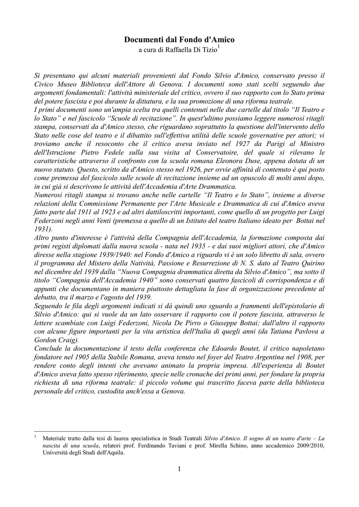 Documenti dal Fondo d'Amico a cura di Raffaella Di Tizio 1 Si presentano qui alcuni materiali provenienti dal Fondo Silvio d'Amico, conservato presso il Civico Museo Biblioteca dell'Attore di Genova. I documenti sono stati scelti seguendo due argomenti fondamentali: l'attività ministeriale del critico, ovvero il suo rapporto con lo Stato prima del potere fascista e poi durante la dittatura, e la sua promozione di una riforma teatrale. I primi documenti sono un'ampia scelta tra quelli contenuti nelle due cartelle dal titolo “Il Teatro e lo Stato” e nel fascicolo “Scuole di recitazione”. In quest'ultimo possiamo leggere numerosi ritagli stampa, conservati da d'Amico stesso, che riguardano soprattutto la questione dell'intervento dello Stato nelle cose del teatro e il dibattito sull'effettiva utilità delle scuole governative per attori; vi troviamo anche il resoconto che il critico aveva inviato nel 1927 da Parigi al Ministro dell'Istruzione Pietro Fedele sulla sua visita al Conservatoire, del quale si rilevano le caratteristiche attraverso il confronto con la scuola romana Eleonora Duse, appena dotata di un nuovo statuto. Questo, scritto da d'Amico stesso nel 1926, per ovvie affinità di contenuto è qui posto come premessa del fascicolo sulle scuole di recitazione insieme ad un opuscolo di molti anni dopo, in cui già si descrivono le attività dell'Accademia d'Arte Drammatica. Numerosi ritagli stampa si trovano anche nelle cartelle “Il Teatro e lo Stato”, insieme a diverse relazioni della Commissione Permanente per l'Arte Musicale e Drammatica di cui d'Amico aveva fatto parte dal 1911 al 1923 e ad altri dattiloscritti importanti, come quello di un progetto per Luigi Federzoni negli anni Venti (premessa a quello di un Istituto del teatro Italiano ideato per Bottai nel 1931). Altro punto d'interesse è l'attività della Compagnia dell'Accademia, la formazione composta dai primi registi diplomati dalla nuova scuola - nata nel 1935 - e dai suoi migliori attori, che d'Amico diresse nella stagione 1939/1940: nel Fondo d'Amico a riguardo vi è un solo libretto di sala, ovvero il programma del Mistero della Natività, Passione e Resurrezione di N. S. dato al Teatro Quirino nel dicembre del 1939 dalla “Nuova Compagnia drammatica diretta da Silvio d'Amico”, ma sotto il titolo “Compagnia dell'Accademia 1940” sono conservati quattro fascicoli di corrispondenza e di appunti che documentano in maniera piuttosto dettagliata la fase di organizzazione precedente al debutto, tra il marzo e l'agosto del 1939. Seguendo le fila degli argomenti indicati si dà quindi uno sguardo a frammenti dell'epistolario di Silvio d'Amico: qui si vuole da un lato osservare il rapporto con il potere fascista, attraverso le lettere scambiate con Luigi Federzoni, Nicola De Pirro o Giuseppe Bottai; dall'altro il rapporto con alcune figure importanti per la vita artistica dell'Italia di quegli anni (da Tatiana Pavlova a Gordon Craig). Conclude la documentazione il testo della conferenza che Edoardo Boutet, il critico napoletano fondatore nel 1905 della Stabile Romana, aveva tenuto nel foyer del Teatro Argentina nel 1908, per rendere conto degli intenti che avevano animato la propria impresa. All'esperienza di Boutet d'Amico aveva fatto spesso riferimento, specie nelle cronache dei primi anni, per fondare la propria richiesta di una riforma teatrale: il piccolo volume qui trascritto faceva parte della biblioteca personale del critico, custodita anch'essa a Genova. 1 Materiale tratto dalla tesi di laurea specialistica in Studi Teatrali Silvio d'Amico. Il sogno di un teatro d'arte – La nascita di una scuola, relatori prof. Ferdinando Taviani e prof. Mirella Schino, anno accademico 2009/2010, Università degli Studi dell'Aquila. 1 Indice2 1. SCUOLE DI RECITAZIONE................................................................p.10 Regio decreto 7 gennaio 1926, n.505 - Statuto della Regia scuola di recitazione di Roma ―Eleonora Duse‖ – p.11 Opuscolo di presentazione della Regia Accademia d'Arte Drammatica (1939) – p.17 Lettera dattiloscritta di d'Amico Silvio a S. E. il Ministro dell'Istruzione, 1927 luglio 15 – p.18 RITAGLI STAMPA ...................................................................................p. 22 Giordani P., Alla scuola di Virginia Marini (1918) – p. 24 Vice, “La scuola degli attori”. Inconvenienti e vantaggi di una proposta. I figli d'arte, i filodrammatici e la realtà (1919) – p. 27 Levi C., Filodrammatiche, Scuole di recitazione e simili, «Il Marzocco», 1 febbraio 1920 – p. 28 D'Amico S., Teatro e Scuola di recitazione, «Il Marzocco» n. 6, 8 febbraio 1920 – p. 30 D'Amico S., Per concludere sul Teatro e la Scuola di recitazione, «Il Marzocco» n. 8, 22 febbraio 1920 - p. 31 La Scuola di recitazione a Santa Cecilia (Un colloquio con Franco Liberati), «Il Messaggero», 4 novembre 1925 – p. 33 Porfirio (Umberto Fracchia), Dopo il teatro – p. 35 D'Amico S., Nota alla legge sul diritto d'autore. Il povero teatro, «Il corriere del Teatro», anno II n.1, gennaio 1926 - p. 36 Italo Inglese, Un prezioso cantiere. La Scuola di recitazione Eleonora Duse, «Il Popolo di Roma» p. 39 Don Marzio (Mario Corsi), Le Scuole di recitazione – Vita Grama, «Gazzetta del Popolo», Roma, 4 agosto 1927 – p. 41 Don Marzio (Mario Corsi), Le scuole di recitazione. Una fucina di attori. La questione dei programmi e degli orari. La cattedra di storia della letteratura drammatica. Il problema degli insegnanti , «Gazzetta del Popolo» 7 agosto 1927 - p. 43 2 Non tutti i documenti hanno indicazioni riguardo alla data: dove questa è desumibile da quanto è scritto la indicheremo tra parentesi. 2 Bertuetti E., La nostra inchiesta sulle Scuole di recitazione. Alcuni pareri di Franco Liberati «Gazzetta del Popolo», 11 agosto 1927 – p. 45 D'Amico S., Per un Teatro-Scuola, «La Tribuna», 18 agosto 1927 - p. 48 D'Amico Silvio, Adunata teatrale a Parigi. La crisi, la crisi, la cr