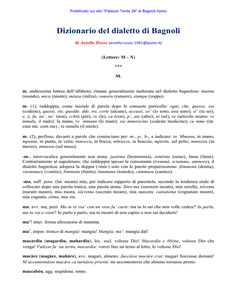 Pubblicato sul sito "Palazzo Tenta 39" di Bagnoli Irpino Dizionario del dialetto di Bagnoli di Aniello Russo (aniello.russo‐[email protected]) (Lettere: M – N) *** M. m, undicesima lettera dell’alfabeto; rimane generalmente inalterata nel dialetto bagnolese: munnu (mondo), mica (niente), mèuza (milza), rumoru (rumore), stumpu (zoppo). m- (1), raddoppia, come iniziale di parola dopo le consuete particelle: ogni, che, quesse, sse (codeste), queste, ste, quedde, dde, tre, certe (alcune), accussì, so’ (io sono, essi sono), sì’ (tu sei), e, è, fu, nu’, no’ (non), cchiù (più), re (le), cu (con), p’, ate (altre), ni (né), re (articolo neutro: re mmalu, il male): la manu, re mmanu (le mani); sse mmerecìne (codeste medicine); cu mme (lat. cum me: com me) ; re mmèlu (il miele). m- (2), prefisso, davanti a parole che cominciano per: m-, p-, b-, a indicare: in. Mmanu, in mano; mponta, in punta, in vetta; mmocca, in bocca; mbrazza, in braccio; mpiettu, sul petto; mmiezzu (in mezzo), mmussu (sul muso). -m-, intervocalica generalmente non muta: jastèma (bestemmia), semènta (seme), fama (fame). Contrariamente al napoletano, che raddoppia spesso la consonante (tremmà, sciummo, ammore), il dialetto bagnolese adopera la doppia (-mm-) solo con le parole proparossitone: fémmena (donna), vuommucu (vomito), lémmutu (limite), tùmmunu (tomolo), càmmusu (camice). -ma, suff. poss. (lat. meam) mia, per indicare rapporto di parentela, secondo la tendenza orale di collocare dopo una parola tonica, una parola atona. Sòre-ma (sororem meam), mia sorella; nòrema (nurum meam), mia nuora; sòcrema (socrum meam), mia suocera; cainàtema (cognatam meam), mia cognata; zìima, mia zia. ma, avv. ma, però. Ma tu re ssa’ can un vose fa’ carte: ma tu lo sai che non volle cedere? Iu parlu, ma tu vai o vieni? Io parlo e parlo, ma tu mostri di non capire o non sai deciderti! ma’! inter. forma allocutoria di mamma. ma’, imper. tronco di mangià: mangia! Mangia, ma’: mangia dài! macardìu (magardìu, mahardìu), loc. escl. volesse Dio! Macardìu e bbène, volesse Dio che venga! Vulésse fa’ nu ternu, macardìu: vorrei fare un terno al lotto, lo volesse Dio! macàre (magàre, mahàre), avv. magari, almeno. Juccàsse macàre crai: magari fioccasse domani! M’accuntentàsse macàre ca turnàsse priestu: mi accontenterei che almeno tornasse presto. maccabèu, agg. stupidone, tonto. Pubblicato sul sito "Palazzo Tenta 39" di Bagnoli Irpino maccaronu (1), s. m. maccherone, pasta lunga (spahètti, virmicieddi, linguini, trainieri, tagliatèdde récce, miezzizìti, cannéle). Pl. maccarùni. Vai a ccarn’e mmaccarùni: si nutre solo di carne e maccheroni. Li maccarùni se màngine càveri: i maccheroni vanno consumati caldi; cioè un affare va concluso all’istante. Se votta li maccaruni p’ faccia: gode di un tale il benessere che sciupa i maccheroni lascinadoseli scivolare sul volto. Vulésse ca chiuvésere maccarùni: vorrei che piovessero maccheroni! maccaronu (2), agg. stupido, scioccone. Sin. tòturu. Nu’ ng’era juornu can un li ricìa: “Maccaro’!”: non passava giorno senza dirgli “Buono a nulla!” Sì carùtu, maccaronu, int’a re ccasu! Alla fine, come uno sciocco, sei caduto in trappola! Maccaronu, soprannome. maccarunàru (1), s. m. matterello con filettatura per tagliare le làgane, le fettuccine. maccarunàru (2), s. m. costruttore di matterelli. maccarunàru (3), agg. mangiatore frequente di maccheroni; che va matto per la pasta. Maccarunàru, soprannome. Maccarùni e Bbinu, soprannome. maccatùru (1), s. m. (lat. maculosum) fazzoletto da naso. Dim. maccaturiéddu: fazzolettino. Che bbulìsse assucà lu maccatùru a ccu lu jatu tua? Vorresti asciugare il fazzoletto con il tuo fiato? Cu stu maccàturu russu iu m’appulìzzu lu culu e tu lu mussu: con questo fazzoletto rosso, io mi pulisco il culo e tu il muso! Ncapu purtava nu maccatùru cu quattu noreche: in testa aveva un fazzoletto annodato ai quattro capi. maccatùru (2), s. m. pezzuola usato dalle donne per coprisi il capo (maccatùru r’ capu); cercine, detto anche: truocchiu. Purtà lu maccatùru nìvuru: avere sul capo un fazzoletto nero per lutto. maccatùru r’ scorza, s. m. grosso fazzoletto, detto anche maccatùru r’ la spesa, in cui si deponeva ogni genere di acquisto (pasta, frutta, fagioli…). macchia (1), s. f. (lat. maculam) macchia. Na macchia r’ sangu, r’uogliu, r’ nchiostru: una macchia di sangue, di olio, di inchiostro. macchia (2), s. f. cespuglio, sterpaia; fitta boscaglia. Accr. macchionu. Na macchia r’ fìlici, r’ spine: una sodaglia sparsa di felci, un cespuglio di spine. La macchia r’ Tumasu la Réccia, la sterpaia di Tommaso la Reccia. macchià, v. tr. macchiare, insudiciare. macchiàrse, v. intr. pron. macchiarsi, sporcarsi. Lu pannu cchiù è gghiancu, cchiù subbitu se macchia: quanto più bianco è il pann, tanto più facilmente si sporca. macchiàtu, part. di macchià: macchiato. macchionu, s. m. grosso cespuglio di rovi. Macchionu, soprannome. Pubblicato sul sito "Palazzo Tenta 39" di Bagnoli Irpino màchina (màchena), s. f. auto. machinetta, s. f. macchinetta manuale per tritare la carne di maiale e insaccarla. maciéllu (1), s. m. mattatoio. Carne a bbasciu maciellu: carne di mucca, di solito vittima di un incidente, venduta a metà del prezzo di listino. maciéllu (2), s. m. massacro, carneficina, scempio. Fa’ nu maciellu: fare strage. macillà, v. tr. macellare. Pres. macèllu, macielli, macèlla… macillàtu, part. di macillà: macellato. màcina (1), s. f. quantità di frumento o di granone sufficiente per avviare il mulino. A àcinu a àcinu fai la màcina: un chicco per volta si riesce ad accumulare una quantità di grano tale da poterla portare a macinare. màcina (2), s. f. mola del mulino, na prèta r’ màcina. macinà, v. tr. macinare. Pres. macìnu, macìni, macìna… Macenà finu finu re granurìniu: ridurre i chicchi di granturco in farina molto