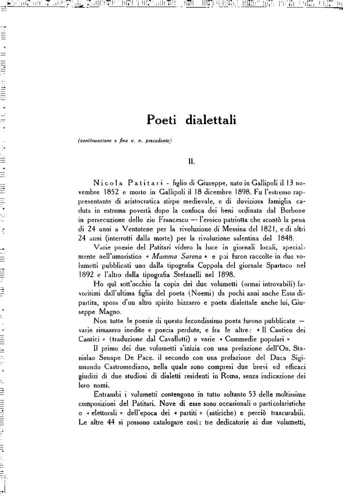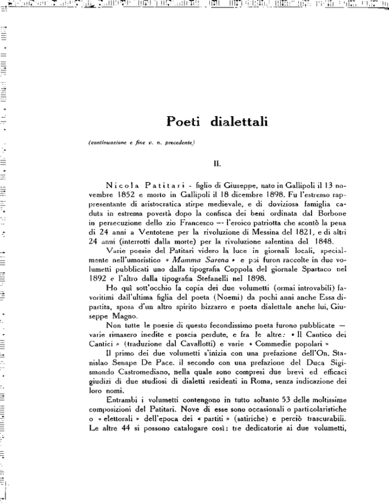 Varie poesie del Patitari videro la luce in giornali locali, specialmente nell'umoristico « Mamma Sarena ► e ppi furon raccolte in due volumetti pubblicati uno dalla tipografia Coppola del giornale Spartaco nel
