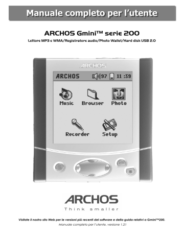 Manuale completo per l’utente ARCHOS Gmini™ serie 200 Lettore MP3 e WMA/Registratore audio/Photo Wallet/Hard disk USB 2.0 Visitate il nostro sito Web per le versioni più recenti del software e della guida relativi a Gmini™200. Manuale completo per l’utente, versione 1.21 1 6 Uso di MusicMatch™ INDICE 1 Collegamenti, porte e pulsanti 4 2 Primo impiego 7 2.1 Collegamento dell’adattatore CA 2.2 Accensione di Gmini 2.3 Modifica della lingua dell’interfaccia utente 2.4 Spegnimento di Gmini e funzioni di risparmio della batteria 2.5 Manutenzione di Gmini 7 7 7 8 8 3 Panoramica dell’interfaccia utente 9 3.2.2 Browser 9 4 con Gmini 37 8.1.1 Download del file .AOS 38 38 8.1.2 Lettura del file di testo della cronologia 38 8.1.3 Copia sulla directory principale di Gmini 38 9 Risoluzione dei problemi 39 39 41 3.2.3 Schermata Settings (Impostazioni) 10 3.2.4 Menu contestuali 10 9.2.1 Windows® 98SE & ME con Scan-Disk in esecuzione (Error Checking) 42 3.2.5 Caselle di messaggio 11 9.2.2 Esecuzione dell’utilità di controllo dell’integrità del disco (ChkDsk) con Windows® XP e 2000 42 3.2.6 Utilizzo della tastiera virtuale 11 3.2.7 Come bloccare i pulsanti di Gmini 11 12 4.1 Riproduzione dei brani musicali 12 4.1.2 Riproduzione di un brano musicale 12 4.1.3 Uso degli elenchi di riproduzione 14 4.1.4 File.m3u 15 11 Supporto tecnico 45 16 16 4.2.2 Modifica delle impostazioni PlayMode (Modalità di riproduzione) 17 4.2.3 Impostazione dell’orologio 18 4.2.4 Modifica della impostazioni di alimentazione 19 4.2.5 Modifica delle impostazioni di registrazione 20 4.2.6 Modifica delle impostazioni del sistema 21 4.3 Uso del browser 4.3.1 Contenuto della cartella MUSIC 44 22 22 4.3.2 Esplorazione della struttura di directory 22 4.3.3 Operazioni su file e cartelle in modalità Browser 23 4.4 Registrazioni musicali MP3 25 4.4.1 Registrazione con il microfono 26 4.4.2 Registrazione Line-In 26 4.5 Uso del portafoto personale 27 4.5.1 Uso del browser delle foto 27 4.5.2 Copia di file da una scheda CompactFlash™ 27 4.5.3 Visualizzazione delle foto su Gmini 28 5 Collegamento di Gmini al computer 29 5.1 Collegamento USB 29 5.1.1 Windows® ME/2000/XP e Macintosh® 9.2 o 10.2.4 e superiori 29 5.1.2 Windows® 98SE 29 5.2 Uso di Gmini come unità esterna 5.3 Scollegamento di Gmini dal computer 31 31 5.3.1 Windows® 31 5.3.2 Macintosh® 32 INDICE 4.2.1 Modifica delle impostazioni audio 10 Specifiche tecniche 12 4.1.1 Selezione di un brano musicale 4.2 Modifica delle impostazioni di Gmini INDICE 36 iTunes® 9.1 Problemi di connessione USB 9.2 Problemi di file, dati danneggiati, formattazione e ripartizione 4 Uso di Gmini 200 2 35 6.4.2 Creazione e uso delle sequenze di brani con MusicMatch™ 8 Aggiornamento del software del sistema operativo di Gmini 9 9 3.2.1 Menu principale 33 34 35 35 6.4.1 Aggiornamento dell’ARCLibrary 7 Uso di 9 3.1 Menu principale 3.2 Come familiarizzare con l’interfaccia 33 6.1 Installazione di MusicMatch™ 6.2 Creazione di file MP3 dai CD audio 6.3 Come acquistare i file MP3 da Gmini 6.4 Elenchi di riproduzione ARCLibrary e MusicMatch™ 3 1 Collegamenti, porte e pulsanti 4 B Menu contestuale - quando l’icona schermata, è disponibile un menu. viene visualizzata in alto a sinistra della C Sposta a sinistra - consente anche di diminuire il guadagno registrazione A Microfono incorporato D Sposta in alto - consente anche di aumentare il volume di riproduzione B Spina dell’adattatore a connessione multipla - consente le connessioni per Line-In e Line-Out. E Sposta a destra - consente anche di aumentare il guadagno registrazione C Jack per cuffie a connessione multipla - per collegare cuffie, telecomando FM o la spina dell’adattatore. F Play/Pausa/OK - consente di riprodurre l’elemento corrente, di metterlo in pausa e di riprodurlo di nuovo. Immettere un valore. G Pulsante Stop/Esc - consente di interrompere la riproduzione del file corrente oppure di uscire dalla schermata corrente. H Sposta in basso - consente anche di diminuire il volume di riproduzione D Porta per portafoto personale (CompactFlash™ tipo I & II) Collegamenti, porte e pulsanti Collegamenti, porte e pulsanti A Pulsante di accensione - tenerlo premuto per alcuni secondi per avviare Gmini™. 5 2 Primo impiego Questo dispositivo dispone di una CPU, un disco rigido e un sistema operativo, pertanto è molto più simile a un computer che a un lettore CD, un registratore o una radio. Se non si ha troppa familiarità con i computer, è opportuno leggere attentamente il presente manuale dell’utente. 2.1 Collegamento dell’adattatore CA Prima di utilizzare Gmini 200 per la prima volta, caricare completamente le batterie interne. • Utilizzare SOLO l’adattatore/caricatore Archos incluso. L’adattatore/caricatore ARCHOS dispone di una speciale punta USB da collegare alla porta USB. Il caricamento si avvia automaticamente appena si inserisce l’adattatore. • Il caricamento completo viene indicato dall’icona di batteria piena. Batteria scarica: la batteria è scarica. È necessario caricarla. 6 2.2 C Alimentazione - Per alimentare l’unità e caricare le batterie interne con l’adattatore CA esterno. Dopo il caricamento completo iniziale, è possibile utilizzare Gmini mentre l’adattatore CA è inserito. Accensione di Gmini • Tenere premuto il tasto di accensione finché non viene visualizzata la schermata, quindi rilasciarlo. • Se il Gmini è in ricarica, fare clic sul pulsante PLAY per accenderlo. • Se viene visualizzata l’icona della batteria scarica o se non è visualizzato niente, è necessario inserire l’adattatore/caricatore Archos e accertarsi che le batterie vengano caricate. A Miniporta USB 2.0 (compatibile con USB 1.1) B Alimentatore USB Batteria piena: la batteria è completamente carica ed è possibile scollegare l’adattatore CA. 2.3 Modifica della lingua dell’interfaccia utente L’inglese è selezionato come lingua predefinita per l’interfaccia utente Gmini. È possi