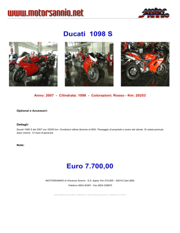 Ducati 1098 S Anno: 2007 - Cilindrata: 1098 - Colorazioni: Rosso - Km: 20253 Optional e Accessori: Dettagli: Ducati 1098 S del 2007 con 20253 km. Condizioni ottime.Gomme al 90%. Passaggio di proprietà a carico del cliente. Si valuta permuta dopo visione. 12 mesi di garanzia. Note: Euro 7.700,00 MOTORSANNIO di Vincenzo Gnerre - S.S. Appia, Km 274,800 – 82018 Calvi (BN) Telefono 0824.40387 - Fax 0824.338970 Data Pubblicazione Offerta: 04/02/2016 - Data Stampa Documento: 15/03/2017 01:22:05