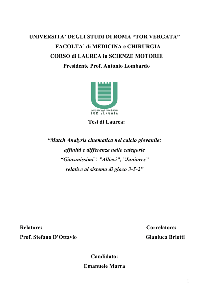 UNIVERSITA’ DEGLI STUDI DI ROMA “TOR VERGATA” FACOLTA’ di MEDICINA e CHIRURGIA CORSO di LAUREA in SCIENZE MOTORIE Presidente Prof. Antonio Lombardo Tesi di Laurea: “Match Analysis cinematica nel calcio giovanile: affinità e differenze nelle categorie “Giovanissimi”, ”Allievi”, ”Juniores” relative al sistema di gioco 3-5-2” Relatore: Correlatore: Prof. Stefano D’Ottavio Gianluca Briotti Candidato: Emanuele Marra 1 CAPITOLO 1: Introduzione 1.1 Scopo della ricerca……………………………………... CAPITOLO 2: Revisione letteratura 2.1. La Match Analysis …………………………………….. 2.2. Il modello di prestazione del giovane calciatore………. CAPITOLO 3: Match Analysis cinematica per mezzo di sistema GPS 3.1 Metodi…………………………………………………… 3.2 Materiali…………………………………………………. 3.3 Procedure………………………………………………… 3.4 Risultati………………………………………………….. 3.4.1 Giovanissimi…………………………………………… 3.4.2 Allievi………………………………………………….. 3.4.3 Juniores………………………………………………… 3.5 Affinità e differenze tra le categorie……………………… CAPITOLO 4: Elaborazione di una metodica specifica di allenamento in funzione della categoria di riferimento 4.1 Elaborazione di una metodica specifica di allenamento per la potenza aerobica……………………… CAPITOLO 5: Discussioni e Conclusioni 5.1 Discussioni…………………………………………………………………… 5.2 Conclusioni……………………… Ringraziamenti Bibliografia 2 Capitolo 1: Introduzione L’Allenamento per il gioco del calcio è caratterizzato dalla riproposizione nel tempo di esercitazioni idonee a determinare negli atleti la possibilità di esprimere le proprie migliori qualità tecniche e tattiche durante tutto il corso della partita. Che la partita impegni la capacità di “resistere” è dimostrato da numerose ricerche,nelle quali si evince che la media di percorrenza in 90 minuti può variare dai 9 ai 12 km (Bangsbo et al., 1991; D’Ottavio 2001; Mohr et al., 2003; Krustrup et al., 2009) svolti alternando diverse andature (passo, corsa lenta , corsa veloce, sprint, corsa indietro, laterale, etc.). A questo proposito anche se l’impegno dei giocatori “dura a lungo”, non siamo certamente di fronte ad una prestazione di “lunga durata”, così come la si intende in maniera classica nell’atletica leggera. Durante la partita di calcio,al contrario, ogni giocatore alterna numerosi momenti di attività senza palla trascorsi a vari ritmi di corsa, a brevissimi altri periodi in cui ne detiene il possesso. (R.Capanna,1997). Negli ultimi anni,con l’avvento di nuove tecnologie applicate al gioco del calcio,si è passati dalla semplicistica concezione di “sport aerobico-anaerobico alternato” (Dal Monte, Faina,1999) a quella fornita dagli studiosi della proZone system: “Il calcio è caratterizzato da una attività intermittente con gli sforzi anaerobici ad alta intensità sovrapposti ad una bassa attività aerobica”. Si è quindi spostato l’obiettivo dal miglioramento di capacità aerobiche e lattacide verso un aumento della capacità di effettuare sprint ad alta intensità per tutta la durata della gara. Essere a conoscenza del preciso modello di prestazione consente di ottimizzare al meglio il poco tempo che il preparatore fisico ha a disposizione durante la seduta di allenamento per migliorare e mantenere un buono stato di forma del calciatore. In particolare bisogna sottolineare come l’avvento della tecnologia a rilievo satellitare della posizione (Global Position System GPS) abbia rappresentato un punto di svolta garantendo l’analisi della prestazione di gara e di allenamento negli sport di squadra. L’ulteriore progresso della tecnologia GPS ha consentito lo sviluppo di sistemi portatili utilizzabili anche per la monitorizzazione temporale (time-motion analysis) della prestazione degli sport di squadra, risolvendo le problematiche metodologiche a questa inerenti. Nella mia ricerca come in molte altre che mi hanno preceduto, il pensiero comune è quello che l’utilizzo di queste apparecchiature GPS possa fornire un insieme di dati e di informazioni utili nel definire oltre che la prestazione anche e soprattutto l’ottimizzazione dell’allenamento fisico specifico dei giovani calciatori. 3 1.1 Scopo della ricerca Trovandomi a lavorare di fronte un intero settore giovanile calcistico, con ragazzi che presentavano fasce di età che andavano dai 12 ai 18 anni, mi chiesi quale potesse essere per ognuno di loro il carico più adatto, convinto del fatto che gli stimoli allenanti proposti non potevano differenziarsi solo per la diversa quantità proposta durante la settimana. Utilizzando quindi un apparecchiatura GPS (Spi-elite) ho cercato di esaminare la prestazione di giovani calciatori con lo scopo di verificare eventuali differenze e affinità (tra giocatori della stessa categoria che ricoprivano ruoli differenti e giocatori di categorie differenti) all’interno del contenitore che deve essere la base da cui partire: la gara. Esaminando così attentamente il modello prestativo possiamo creare un lavoro adeguato e cercare, se non altro, di sbagliare il meno possibile nella somministrazione del carico allenante. Capitolo 2: Revisione letteratura 2.1: La Match Analysis La match analysis è la metodica di rilevamento dati che, attraverso l’indagine scientifica e statistica, consente di valutare, in modo oggettivo, il rendimento fisico e tecnico-tattico del singolo atleta e dell’intera squadra. Potrebbe quindi essere definita come il mezzo che trasforma il modello di prestazione in un dato matematico per poter analizzare meglio il modello stesso e migliorarlo attraverso l’allenamento. La di