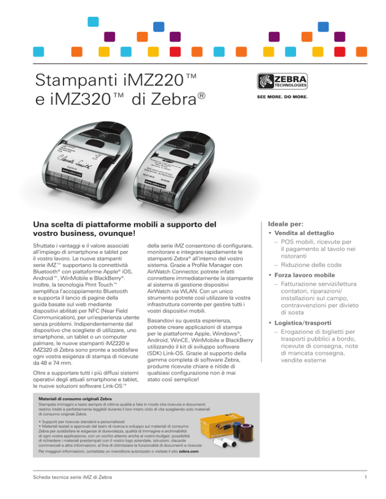 Stampanti iMZ220™ e iMZ320™ di Zebra® Una scelta di piattaforme mobili a supporto del vostro business, ovunque! Sfruttate i vantaggi e il valore associati all’impiego di smartphone e tablet per il vostro lavoro. Le nuove stampanti serie iMZ™ supportano la connettività Bluetooth® con piattaforme Apple® iOS, Android™, WinMobile e BlackBerry®. Inoltre, la tecnologia Print Touch™ semplifica l’accoppiamento Bluetooth e supporta il lancio di pagine della guida basate sul web mediante dispositivi abilitati per NFC (Near Field Communication), per un’esperienza utente senza problemi. Indipendentemente dal dispositivo che scegliete di utilizzare, uno smartphone, un tablet o un computer palmare, le nuove stampanti iMZ220 e iMZ320 di Zebra sono pronte a soddisfare ogni vostra esigenza di stampa di ricevute da 48 e 74 mm. Oltre a supportare tutti i più diffusi sistemi operativi degli attuali smartphone e tablet, le nuove soluzioni software Link-OS™ della serie iMZ consentono di configurare, monitorare e integrare rapidamente le stampanti Zebra® all’interno del vostro sistema. Grazie a Profile Manager con AirWatch Connector, potrete infatti connettere immediatamente la stampante al sistema di gestione dispositivi AirWatch via WLAN. Con un unico strumento potrete così utilizzare la vostra infrastruttura corrente per gestire tutti i vostri dispositivi mobili. Basandovi su questa esperienza, potrete creare applicazioni di stampa per le piattaforme Apple, Windows®, Android, WinCE, WinMobile e BlackBerry utilizzando il kit di sviluppo software (SDK) Link-OS. Grazie al supporto della gamma completa di software Zebra, produrre ricevute chiare e nitide di qualsiasi configurazione non è mai stato così semplice! Ideale per: • Vendita al dettaglio –– POS mobili, ricevute per il pagamento al tavolo nei ristoranti –– Riduzione delle code • Forza lavoro mobile –– Fatturazione servizi/lettura contatori, riparazioni/ installazioni sul campo, contravvenzioni per divieto di sosta • Logistica/trasporti –– Erogazione di biglietti per trasporti pubblici a bordo, ricevute di consegna, note di mancata consegna, vendite esterne Materiali di consumo originali Zebra Stampate immagini e testo sempre di ottima qualità e fate in modo che ricevute e documenti restino intatti e perfettamente leggibili durante il loro intero ciclo di vita scegliendo solo materiali di consumo originali Zebra. • Supporti per ricevute standard e personalizzati • Materiali testati e approvati dal team di ricerca e sviluppo sui materiali di consumo Zebra per soddisfare le esigenze di durevolezza, qualità di immagine e archiviabilità di ogni vostra applicazione, con un occhio attento anche al vostro budget; possibilità di richiedere i materiali prestampati con il vostro logo aziendale, istruzioni, clausole commerciali e altre informazioni, al fine di ottimizzare la funzionalità di documenti e ricevute Per maggiori informazioni, contattate un rivenditore autorizzato o visitate il sito zebra.com Scheda tecnica serie iMZ di Zebra 1 PRESENTAZIONE DELLA NUOVA SERIE IMZ Serie iMZ: tutta la potenza della stampa Zebra nel palmo della vostra mano. Stampanti portatili per ricevute entry-level per la produzione di documenti semplici. Un’assistente elegante e discreta Le piccole stampanti della serie iMZ sono perfette per applicazioni di stampa mobile in cui è richiesta la produzione on demand di ricevute rapide e semplici. Si tratta di stampanti dalle dimensioni e dal peso minimi, pratiche da indossare, che non intralciano l’operatore durante le normali procedure di lavoro. Estremamente facile da usare, rappresentano una perfetta soluzione iniziale per coloro che desiderano abbandonare documentazione cartacea, ricevute prestampate o stampanti portatili poco affidabili. La compattezza e la praticità della serie iMZ possono essere sfruttate in numerose applicazioni in cui è previsto l’impiego di forza lavoro mobile; inoltre, il marchio Zebra è una garanzia di affidabilità. Un’assistente che non vi sarà di alcun peso • Con soli 0,34 kg di peso, queste leggerissime stampanti possono essere indossate per tutta la giornata senza alcun intralcio o fastidio per l’operatore • È possibile agganciare la stampante alla cintura oppure portarla a tracolla, per la massima praticità di stampa Facile da usare • Accesso ai supporti con un singolo pulsante, per la massima semplicità di ricarica • LED intuitivi indicano lo stato di accensione/ spegnimento, errore e connettività Alternativa economica • Un’alternativa semplice, affidabile ed economica per le vostre esigenze di stampa portatile • Tutte le stampanti iMZ presentano opzioni di connettività USB e Bluetooth standard, per consentirvi di comunicare con qualsiasi dispositivo portatile che esegue sistemi operativi iOS, WinMobile, Android e BlackBerry 2 Tutta la potenza di stampa Zebra nel palmo di una mano • Processore ad alta velocità e memoria potenziata per la stampa di codici a barre, font ed elementi grafici complessi • Le stampanti della serie iMZ presentano ora anche un’opzione 802.11n con supporto dual-band (2.4 GHz – 802.11b/g/n e 5 GHz – 802.11a/n) per consentire agli utenti della vendita al dettaglio, dove le reti wireless sono spesso sovraccariche, di spostare agevolmente le loro comunicazioni sulla banda da 5 GHz, meno trafficata • Connettività Bluetooth 2.0 protetta, 802.11a/b/g/n (opzionale) o USB (client) con certificazione Wi-Fi® e Cisco® CCX V4 ASD TM Questa mini stampante di Zebra consente di stampare ricevute di 48 mm di larghezza ed è ideale per POS e applicazioni di vendita e/o assistenza presso il cliente. Scheda tecnica serie iMZ di Zebra STAMPA DI RICEVUTE ON DEMAND PER UN’AMPIA GAMMA DI APPLICAZIONI POS mobili per la vendita al dettaglio Scansione degli articoli nel carrello e stampa di una ricevuta con codice a barre per ridurre il tempo di attesa alle casse e migliorare la velocità di sma