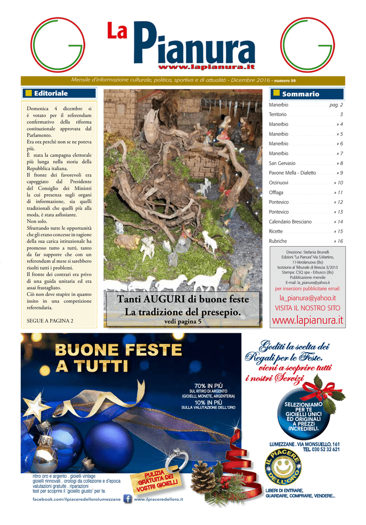 Mensile d’informazione culturale, politica, sportiva e di attualità - Dicembre 2016 - numero 99 Editoriale Domenica 4 dicembre si è votato per il referendum confermativo della riforma costituzionale approvata dal Parlamento. Era ora perchè non se ne poteva più. È stata la campagna elettorale più lunga nella storia della Repubblica italiana. Il fronte dei favorevoli era capeggiato dal Presidente del Consiglio dei Ministri la cui presenza sugli organi di informazione, sia quelli tradizionali che quelli più alla moda, è stata asfissiante. Non solo. Sfruttando tutte le opportunità che gli erano concesse in ragione della sua carica istituzionale ha promesso tutto a tutti, tanto da far supporre che con un referendum al mese si sarebbero risolti tutti i problemi. Il fronte dei contrari era privo di una guida unitaria ed era assai frastagliato. Ciò non deve stupire in quanto insito in una competizione referendaria. SEGUE A PAGINA 2 Sommario Manerbio. . . . . . . . . . . . . . . . . . . . . . pag. 2 Territorio. . . . . . . . . . . . . . . . . . . . . . . . . . . 3 Manerbio. . . . . . . . . . . . . . . . . . . . . . . . . » 4 Manerbio. . . . . . . . . . . . . . . . . . . . . . . . . » 5 Manerbio . . . . . . . . . . . . . . . . . . . . . . . . » 6 Manerbio. . . . . . . . . . . . . . . . . . . . . . . . . » 7 San Gervasio. . . . . . . . . . . . . . . . . . . . . » 8 Pavone Mella - Dialetto . . . . . . . . . . » 9 Orzinuovi. . . . . . . . . . . . . . . . . . . . . . . . » 10 Offlaga . . . . . . . . . . . . . . . . . . . . . . . . . . » 11 Pontevico . . . . . . . . . . . . . . . . . . . . . . . » 12 Pontevico . . . . . . . . . . . . . . . . . . . . . . . » 13 Calendario Bresciano . . . . . . . . . . . » 14 Ricette. . . . . . . . . . . . . . . . . . . . . . . . . . . » 15 Rubriche . . . . . . . . . . . . . . . . . . . . . . . . » 16 Direzione: Stefania Brunelli Edizioni “La Pianura”-Via S.Martino, 11-Verolanuova (Bs) Iscrizione al Tribunale di Brescia 3/2013 Stampa: CSQ spa - Erbusco (Bs) Pubblicazione mensile E-mail: [email protected] per inserzioni pubblicitarie email: Tanti AUGURI di buone feste La tradizione del presepio. [email protected] VISITA IL NOSTRO SITO www.lapianura.it vedi pagina 5 SELEZIONIAMO PER TE GIOIELLI UNICI ED ORIGINALI A PREZZI INCREDIBILI. D facebook.com/ilpiaceredellorolumezzane E www.ilpiaceredelloro.it O ritiro oro e argento . gioielli vintage gioielli rinnovati . orologi da collezione e d’epoca valutazioni gratuite . riparazioni test per scoprire il ‘gioiello giusto’ per te. ACER PI E IL LUMEZZANE . VIA MONSUELLO, 161 TEL. 030 52 32 621 LL’ OR Pag. 2 Manerbio Dicembre 2016 Lavori di ristrutturazione per l'isola ecologica Hanno preso il via il 5 Dicembre i lavori di ristrutturazione e manutenzione dell’isola ecologica del Comune di Manerbio sita in via Cadignano, al fine di rendere il centro di raccolta sempre più fruibile ed efficace per i cittadini, ma soprattutto di utilizzo più semplice e immediato: gli interventi riguarderanno in particolare la messa in sicurezza dell’area, la sistemazione logistica dei container di raccolta e l’informatizzazione dell’accesso e dei dati di raccolta; in seguito a questi interventi, inoltre, il centro di raccolta potrà diventare un punto di recupero e riutilizzo di piccoli elettrodomestici, mobili etc. Durante il periodo dei lavori l’Amministrazione Comunale, certa della collaborazione e dello spirito di adattamento dei cittadini, si impegna a garantire ai manerbiesi il minor disturbo e disagio possibile, ricordando che il servizio “porta a porta” di ritiro dei rifiuti continuerà a svolgersi regolarmente e senza nessuna modifica sia per le utenze domestiche che per le non domestiche, mentre per il conferimento presso l’isola ecologica le nuove norme prevedono quanto segue: UTENZE DOMESTICHE Le utenze domestiche potranno conferire i propri rifiuti in un centro di raccolta temporaneo/mobile, allestito in via Rigamonti, secondo queste modalità: UTENZE NON DOMESTICHE Solo ed esclusivamente le UTENZE NON DOMESTICHE MEDIO/ PICCOLE, grazie ad un accordo fra i Comuni e i gestori COGES e Gardauno, potranno conferire i propri rifiuti al Centro di Raccolta di Offlaga ubicato in via Artigianato (adiacente S.S. 668) in Frazione di Cignano, presentando un documento di identità attestante la residenza o la sede operativa della Ditta. GRANDI UTENZE: le grandi utenze saranno contattate dagli uffici comunali per definire le modalità di conferimento. GIARDINIERI: Il centro di raccolta di Offlaga non può ricevere il rifiuto vegetale. Gli operatori del settore dovranno provvedere a smaltire i rifiuti vegetali presso impianti autorizzati. Al centro raccolta di Cignano NON potranno essere consegnati: VEGETALE, UMIDO ed ABBIGLIAMENTO. Per info, rivolgersi all’Uff. Ecologia Comune di Manerbio, tel 0309387277 email:[email protected] PROSEGUE DALLA PRIMA La riforma oggetto del quesito referendario, come molto opportunamente sostenuto da Romano Prodi, era poco chiara e priva della necessaria profondità. Da parte nostra aggiungiamo che la riduzione del numero dei parlamentari era perlomeno un provvedimento monco. Infatti, se si riduce solo il numero, non si intacca l’area del previlegio consistente nelle stratosferiche indennità percepite dai nostri parlamentari. Tutto ciò in un momento di perdurante ed acuta crisi economica che investe il paese. Ad urne aperte si è registrata la vittoria del fronte del no per il tramite di un risultato clamoroso, non tanto per l’esito, quanto per la dimensione. Il tutto supportato da un’affluenza molto massiccia. Quella che esce irrimediabilmente sconfitta è la narrazione per la quale l’Italia era ripartita. Per i cantori di questa vulgata non vi è altra via che quella delle dimissioni. E’ finita la stagione dei gufi, dei rosiconi e dei ciaoni. Si ritorni alla politica che, come è noto, è una scienza esatta. Territorio Dicembre 2016 Pag. 3 STATE SERENI 