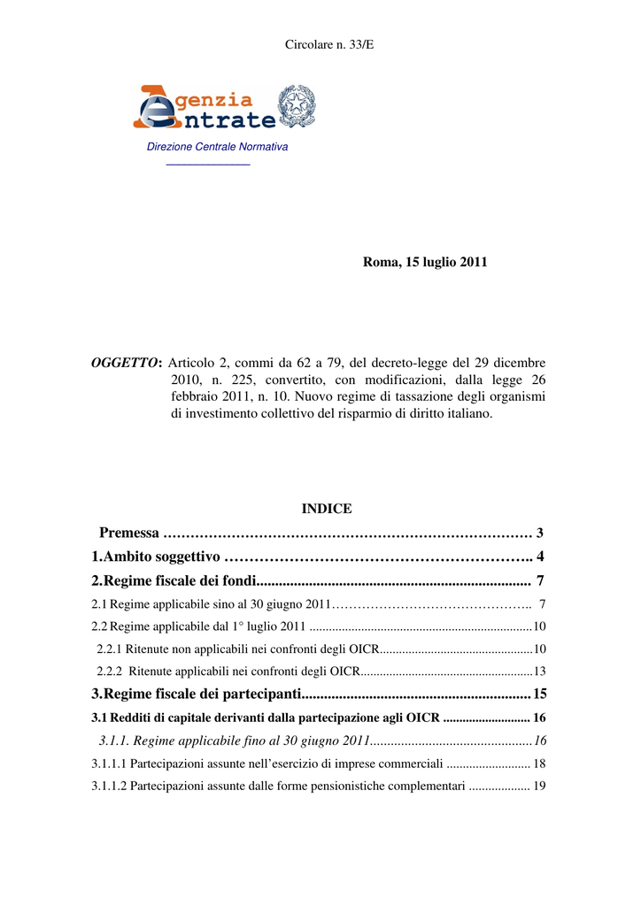 Circolare n. 33/E Direzione Centrale Normativa ______________ Roma, 15 luglio 2011 OGGETTO: Articolo 2, commi da 62 a 79, del decreto-legge del 29 dicembre 2010, n. 225, convertito, con modificazioni, dalla legge 26 febbraio 2011, n. 10. Nuovo regime di tassazione degli organismi di investimento collettivo del risparmio di diritto italiano. INDICE Premessa ……………………………………………………………………… 3 1. Ambito soggettivo …………………………………………………….. 4 2. Regime fiscale dei fondi......................................................................... 7 2.1 Regime applicabile sino al 30 giugno 2011……………………………………….. 7 2.2 Regime applicabile dal 1° luglio 2011 ..................................................................... 10 2.2.1 Ritenute non applicabili nei confronti degli OICR................................................10 2.2.2 Ritenute applicabili nei confronti degli OICR......................................................13 3. Regime fiscale dei partecipanti............................................................. 15 3.1 Redditi di capitale derivanti dalla partecipazione agli OICR ........................... 16 3.1.1. Regime applicabile fino al 30 giugno 2011...............................................16 3.1.1.1 Partecipazioni assunte nell’esercizio di imprese commerciali .......................... 18 3.1.1.2 Partecipazioni assunte dalle forme pensionistiche complementari ................... 19 3.1.1.3 Partecipazioni assunte da soggetti non residenti ...............................................19 3.1.2. Regime applicabile dal 1° luglio 2011 .......................................................... 20 3.1.2.1. Modalità di applicazione della ritenuta ..................................................... 24 3.1.2.2 Partecipazioni assunte nell’esercizio di imprese commerciali ...........................25 3.1.2.3 Partecipazioni assunte dalle forme pensionistiche complementari ....................25 3.1.2.4 Partecipazioni assunte da soggetti non residenti ...............................................25 3.2 Redditi diversi di natura finanziaria derivanti dalla partecipazione in OICR 29 3.2.1 Regime applicabile fino al 30 giugno 2011....................................................... 29 3.2.2 Regime applicabile dal 1° luglio 2011 .............................................................. 30 4. Regime transitorio.................................................................................................. 33 4.1 Regime transitorio di tassazione dei fondi ..................................................................33 4.2 Regime transitorio di tassazione dei partecipanti non esercenti attività d’impresa..38 4.3 Regime transitorio di tassazione dei partecipanti esercenti attività d’impresa ........40 4. 4 Regime transitorio dei partecipanti non residenti .......................................................44 4.5 Regime transitorio di tassazione delle forme di previdenza complementare ................45 4.6 Regime transitorio per l’applicazione del risparmio amministrato ..........................46 5. Abrogazione di norme ........................................................................................... 47 2 3.1 Redditi di capitale derivanti dalla partecipazione agli OICR 3.1.1. Regime applicabile fino al 30 giugno 2011 3.1.1.2 Partecipazioni assunte dalle forme pensionistiche complementari Si ricorda che l’articolo 17, comma 2, del decreto legislativo 5 dicembre 2005, n. 252, che disciplina il regime tributario delle forme pensionistiche complementari, prevede che i proventi derivanti da quote o azioni di OICR soggetti a imposta sostitutiva concorrono a formare il risultato di gestione, se percepiti o se iscritti nei rendiconti, e su di essi compete un credito di imposta del 15 per cento. Tale credito di imposta concorre a formare il risultato della gestione ed è detratto dall’imposta sostitutiva dovuta dalle forme di previdenza complementare nella misura dell’11 per cento. 3.1.2. Regime applicabile dal 1° luglio 2011 Come anticipato, con la soppressione dell’imposta sostitutiva sul risultato maturato della gestione in capo agli OICVM, a decorrere dal 1° luglio 2011, la tassazione avviene, in via generale, in capo ai partecipanti al momento della percezione dei proventi. In particolare, il comma 63 dell’articolo 2 del provvedimento ha aggiunto un nuovo articolo nel D.P.R. n. 600 del 1973 – l’articolo 26-quinquies rubricato “Ritenuta sui redditi di capitale derivanti dalla partecipazione ad OICR italiani e lussemburghesi storici” – per disciplinare le modalità di tassazione in capo ai partecipanti dei redditi di capitale derivanti dalla partecipazione ad OICR italiani e lussemburghesi storici, considerato che l’organismo non sconterà più la tassazione a monte sul risultato della gestione annualmente maturato. La nuova disposizione prevede che sui redditi di capitale di cui alla lettera g) dell’articolo 44 del TUIR, derivanti dalla partecipazione al fondo e determinati ai sensi della medesima nuova disposizione, è applicata una ritenuta alla fonte del 12,50 per cento. 3.1.2.3 Partecipazioni assunte dalle forme pensionistiche complementari La ritenuta non è altresì operata sui proventi percepiti dalle forme pensionistiche complementari di cui al decreto legislativo n. 252 del 2005 e sono computati pertanto nel risultato di gestione assoggettato ad imposta sostitutiva dell’11 per cento, su quelli percepiti dagli organismi d’investimento collettivo del risparmio istituiti in Italia e lussemburghesi storici, nonché sui proventi percepiti dai fondi immobiliari istituiti ai sensi dell’articolo 37 del TUF (cfr. articolo 2, commi 66 e 67, del provvedimento). Pertanto, ai fini dell’applicazione della ritenuta in argomento i predetti soggetti sono trattati come soggetti “lordisti”. 4. Regim