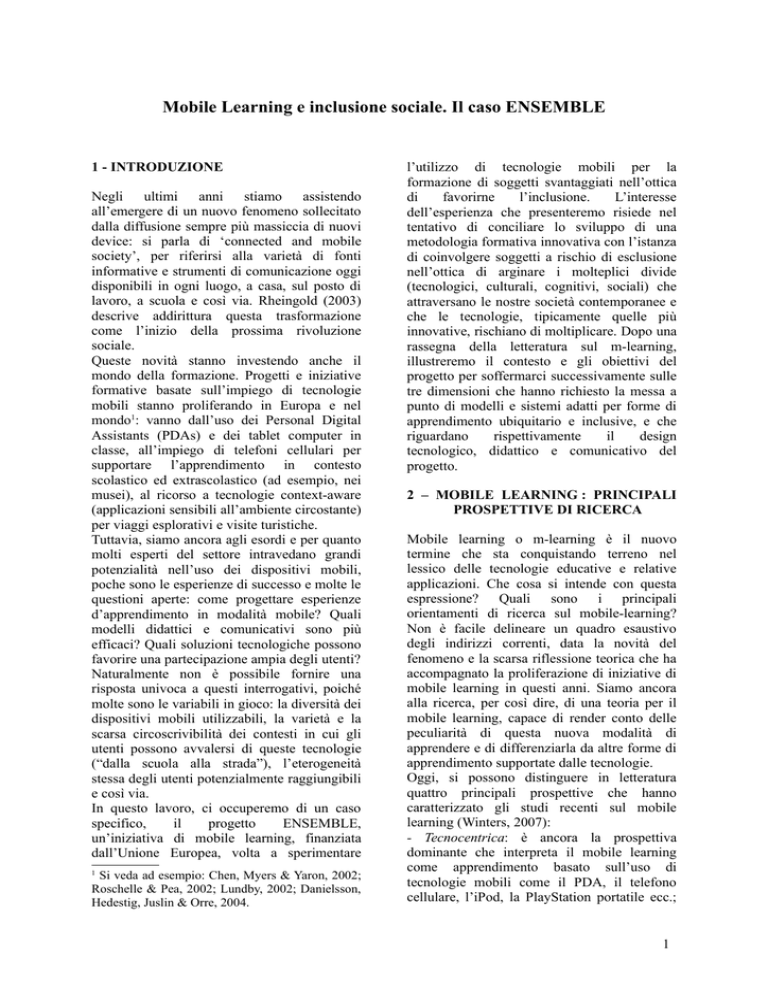 Mobile Learning e inclusione sociale. Il caso ENSEMBLE 1 - INTRODUZIONE Negli ultimi anni stiamo assistendo all’emergere di un nuovo fenomeno sollecitato dalla diffusione sempre più massiccia di nuovi device: si parla di ‘connected and mobile society’, per riferirsi alla varietà di fonti informative e strumenti di comunicazione oggi disponibili in ogni luogo, a casa, sul posto di lavoro, a scuola e così via. Rheingold (2003) descrive addirittura questa trasformazione come l’inizio della prossima rivoluzione sociale. Queste novità stanno investendo anche il mondo della formazione. Progetti e iniziative formative basate sull’impiego di tecnologie mobili stanno proliferando in Europa e nel mondo1: vanno dall’uso dei Personal Digital Assistants (PDAs) e dei tablet computer in classe, all’impiego di telefoni cellulari per supportare l’apprendimento in contesto scolastico ed extrascolastico (ad esempio, nei musei), al ricorso a tecnologie context-aware (applicazioni sensibili all’ambiente circostante) per viaggi esplorativi e visite turistiche. Tuttavia, siamo ancora agli esordi e per quanto molti esperti del settore intravedano grandi potenzialità nell’uso dei dispositivi mobili, poche sono le esperienze di successo e molte le questioni aperte: come progettare esperienze d’apprendimento in modalità mobile? Quali modelli didattici e comunicativi sono più efficaci? Quali soluzioni tecnologiche possono favorire una partecipazione ampia degli utenti? Naturalmente non è possibile fornire una risposta univoca a questi interrogativi, poiché molte sono le variabili in gioco: la diversità dei dispositivi mobili utilizzabili, la varietà e la scarsa circoscrivibilità dei contesti in cui gli utenti possono avvalersi di queste tecnologie (“dalla scuola alla strada”), l’eterogeneità stessa degli utenti potenzialmente raggiungibili e così via. In questo lavoro, ci occuperemo di un caso specifico, il progetto ENSEMBLE, un’iniziativa di mobile learning, finanziata dall’Unione Europea, volta a sperimentare Si veda ad esempio: Chen, Myers & Yaron, 2002; Roschelle & Pea, 2002; Lundby, 2002; Danielsson, Hedestig, Juslin & Orre, 2004. 1 l’utilizzo di tecnologie mobili per la formazione di soggetti svantaggiati nell’ottica di favorirne l’inclusione. L’interesse dell’esperienza che presenteremo risiede nel tentativo di conciliare lo sviluppo di una metodologia formativa innovativa con l’istanza di coinvolgere soggetti a rischio di esclusione nell’ottica di arginare i molteplici divide (tecnologici, culturali, cognitivi, sociali) che attraversano le nostre società contemporanee e che le tecnologie, tipicamente quelle più innovative, rischiano di moltiplicare. Dopo una rassegna della letteratura sul m-learning, illustreremo il contesto e gli obiettivi del progetto per soffermarci successivamente sulle tre dimensioni che hanno richiesto la messa a punto di modelli e sistemi adatti per forme di apprendimento ubiquitario e inclusive, e che riguardano rispettivamente il design tecnologico, didattico e comunicativo del progetto. 2 – MOBILE LEARNING : PRINCIPALI PROSPETTIVE DI RICERCA Mobile learning o m-learning è il nuovo termine che sta conquistando terreno nel lessico delle tecnologie educative e relative applicazioni. Che cosa si intende con questa espressione? Quali sono i principali orientamenti di ricerca sul mobile-learning? Non è facile delineare un quadro esaustivo degli indirizzi correnti, data la novità del fenomeno e la scarsa riflessione teorica che ha accompagnato la proliferazione di iniziative di mobile learning in questi anni. Siamo ancora alla ricerca, per così dire, di una teoria per il mobile learning, capace di render conto delle peculiarità di questa nuova modalità di apprendere e di differenziarla da altre forme di apprendimento supportate dalle tecnologie. Oggi, si possono distinguere in letteratura quattro principali prospettive che hanno caratterizzato gli studi recenti sul mobile learning (Winters, 2007): - Tecnocentrica: è ancora la prospettiva dominante che interpreta il mobile learning come apprendimento basato sull’uso di tecnologie mobili come il PDA, il telefono cellulare, l’iPod, la PlayStation portatile ecc.; 1 in questo tipo ricerche l’attenzione cade sulle tecnologie e le loro prestazioni e l’aggettivo ‘mobile’ è principalmente giustificato dalla portabilità del dispositivo utilizzato per apprendere; - e-learning-oriented: in questa prospettiva, il m-learning si caratterizza come un’estensione dell’e-learning. Stone (2004), ad esempio, definisce il m-learning come “un tipo speciale di e-learning, vincolato da un serie di proprietà particolari e dalla capacità di strumenti, banda larga e altre caratteristiche delle tecnologie di rete che vengono usate”. Analogamente Milrad (2003) definisce il m-learning come una forma di e-learning basata sull’uso di tecnologie mobili e trasmissione wireless. Quinn (2000) definisce il m-learning come l’intersezione tra tecnologie mobili (uso di strumenti di comunicazione e di computing piccoli, portatili e wireless) e l’e-learning. L’accostamento tra m-learning e e-learning non aiuta però a comprendere in cosa consista esattamente lo specifico del mobile learning e a coglierne le peculiarità (Traxler, 2005). - Integrativa rispetto all’educazione formale: nella letteratura sul mobile learning, l’educazione formale viene spesso identificata con la didattica tradizionale, intesa come quella forma di didattica che avviene in un determinato spazio e tempo. L’apprendimento informale sarebbe invece quello che avviene in ogni luogo e in ogni tempo e in questo senso il mobile learning viene considerato una forma di apprendimento informale (Cavus e Ibrahim, 2009). E’ probabile che un dispositivo mobile possa consentire più di altri dispositivi forme di apprendimento informale, ma la ragione indicata – indipendenza dai vincoli spaziotemporali - non a
