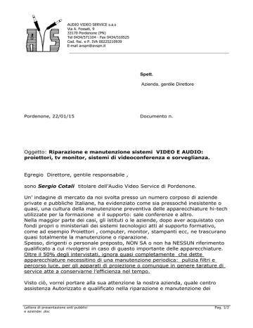 AUDIO VIDEO SERVICE s.a.s Via A. Fossati, 9 33170 Pordenone (PN) Tel 0434/571104 - Fax 0434/510525 Cod. fisc. e P. IVA 00225210939 E-mail [email protected] Spett. Azienda, gentile Direttore Pordenone, 22/01/15 Documento n. Oggetto: Riparazione e manutenzione sistemi VIDEO E AUDIO: proiettori, tv monitor, sistemi di videoconferenza e sorveglianza. Egregio Direttore, gentile responsabile , sono Sergio Cotali titolare dell’Audio Video Service di Pordenone. Un’ indagine di mercato da noi svolta presso un numero corposo di aziende private e pubbliche Italiane, ha evidenziato come sia pressoché inesistente o quasi, una cultura della manutenzione preventiva delle apparecchiature hi-tech utilizzate per la formazione e il supporto: sale conferenze e altro. Nella maggior parte dei casi, gli istituti o le aziende, dopo aver acquistato con fondi propri o ministeriali dei sistemi tecnologici atti al supporto formativo, come ad esempio Proiettori , computer, monitor, stampanti ecc, ne trascurano quasi totalmente la manutenzione o riparazione. Spesso, dirigenti o personale preposto, NON SA o non ha NESSUN riferimento qualificato a cui rivolgersi in caso di guasto importante delle apparecchiature. Oltre il 50% degli intervistati, ignora quasi completamente che dette apparecchiature necessitino di una manutenzione periodica: pulizia filtri e percorso luce, per gli apparati di proiezione o comunque in genere tarature di service atte a conservarne l’efficienza nel tempo. Visto ciò, vorrei portare alla sua attenzione la nostra azienda, quale centro assistenza Autorizzato e qualificato nella riparazione e manutenzione dei Lettera di presentazione enti pubblici e aziendei .doc Pag. 1/2 AUDIO VIDEO SERVICE s.a.s Via A. Fossati, 9 33170 Pordenone (PN) Tel 0434/571104 - Fax 0434/510525 Cod. fisc. e P. IVA 00225210939 E-mail [email protected] sistemi audiovisivi : LIM, Proiettori LCD e DLP,TV led e plasma, impianti audio e video in genere. Da oltre 30 anni, siamo partner e punto di rifermento per il territorio nazionale delle note case costruttrici, Sanyo Panasonic, Hitachi, Eiki, Sharp, Mitsubishi e JVC, per le quali SIAMO AUTORIZZATI AGLI INTERVENTI IN GARANZIA e non. L’esperienza e la preparazione del nostro personale tecnico, unita all’efficienza della nostra organizzazione logistica, ci consente d’intervenire con professionalità e successo, anche su prodotti di altre marche, come ad esempio: EPSON, BENQ, ACER, PROMETHEAN, NEC, CHRISTIE, VIVITEK e altri. Il nostro magazzino parti di ricambio è a vostra completa disposizione per offerte di Lampade e accessori ORIGINALI : http://www.avspn.it/it/modulo-magazzino-richiesta-ricambi-ed-accessori.htm Qualora la sua azienda o istituto ne abbia la necessità, NON SI AFFIDI al primo che capita, metta i suoi apparati in mani qualificate e non esiti a contattarci: Consulenze ed eventuali preventivi, sono totalmente gratuiti. TEL. 0434571104 (ra) FAX. 0434510525 www.avspn.it Cordiali saluti AUDIO VIDEO SERVICE s.n.c. Sergio Cotali Lettera di presentazione enti pubblici e aziendei .doc Pag. 2/2
