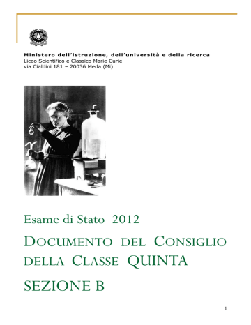 M i n i s t e r o d e l l ’ i s t r u z io n e , d e l l ’ u n i v e r s i t à e d el l a r i c e r c a Liceo Scientifico e Classico Marie Curie via Cialdini 181 – 20036 Meda (Mi) Esame di Stato 2012 DOCUMENTO DEL CONSIGLIO DELLA CLASSE QUINTA SEZIONE B 1 Liceo Meda Scientifico e Classico Statale “M. Curie” ESAME DI STATO Documento del Consiglio della classe Quinta sezione B, sperimentazione scienze Anno Scolastico 2011/12 STORIA DELLA CLASSE NEL TRIENNIO All’inizio del triennio (a.s. 2009/2010) la classe era costituita da 25 studenti: 1 alunno ha cessato di frequentare prima del 15 marzo 2010, 23 sono stati promossi alla classe successiva e 1 studente è risultato non promosso a settembre, a seguito del mancato recupero del debito formativo. Alla fine del quarto anno, gli alunni sono rimasti 22, a motivo del trasferimento presso altro Istituto di uno studente e di una non promozione. All’inizio del corrente anno scolastico, è stata inserita l’alunna Confalonieri Clarissa, proveniente da altro Liceo Scientifico. Pertanto, l’attuale 5 B risulta composta da 22 alunni (17 maschi e 5 femmine). CONTINUITA’ E COMPOSIZIONE DEL CONSIGLIO DI CLASSE La continuità didattica è stata assicurata per gli insegnamenti di: Latino, Storia e Filosofia, Disegno e Storia dell’Arte, Scienze e Fisica. Dall’a.s. 2010/2011, sono stati unificati gli insegnamenti di Italiano e Latino e di Matematica e Fisica. All’inizio dell’anno scolastico in corso è stata sostituta l’insegnante di Inglese. Si segnala un avvicendamento dei docenti di Educazione Fisica e Religione cattolica. PROFILO SINTETICO DELLA CLASSE Sin dall’inizio del triennio, la classe ha instaurato con i docenti un rapporto caratterizzato da correttezza ed educazione e, pur conservando un profilo di riservatezza -che ha, talvolta, contenuto nei limiti di un attento ascolto più che di una attiva propositività la partecipazione al dialogo educativo- si è mostrata motivata al lavoro scolastico, diligente nell’assolvimento del proprio compito e tesa a perfezionare il proprio metodo di studio, anche se non tutti gli studenti sono riusciti a correggere la tendenza ad uno studio ripetitivo, soprattutto nelle discipline che richiedono capacità di organizzazione e di rielaborazione delle informazioni. Pertanto, gli esiti scolastici raggiunti risultano eterogenei e diversificati, sia in ordine alla qualità e alla strutturazione della preparazione individuale, sia sotto il profilo della capacità di affrontare e governare in modo autonomo e criticamente avveduto contenuti complessi. Si registrano, infatti, casi di alunni che presentano un profitto positivo, dovuto ad un lavoro assiduo e sistematico, accanto ad altri che hanno conseguito risultati, in generale, ampiamente sufficienti; qualche studente, condizionato da una certa lentezza nel processo di apprendimento e da una modesta capacità espositiva, mostra, nonostante l’impegno profuso, una preparazione complessiva non priva di fragilità e lacune. ATTIVITA’ PLURIDISCIPLINARI I docenti hanno privilegiato il normale svolgimento del programma ministeriale previsto per ogni materia, ritenendo indispensabile fornire agli studenti una base di conoscenze la più ampia possibile, non mancando però di suggerire e far rilevare possibili raccordi e convergenze 2 pluridisciplinari. In particolare, per l’area letteraria, artistica e storico-filosofica, sono stati evidenziati alcuni momenti fondamentali per la storia della cultura otto-novecentesca, quali: il Romanticismo, il Realismo, il Decadentismo, le Avanguardie artistiche del ‘900 e la cultura della ’crisi’ tra i due secoli; per l’area scientifica, i raccordi proposti hanno fatto riferimento ai seguenti argomenti: campo magnetico della terra, paleomagnetismo e magnetismo della materia, teoria del Big Bang, teoria delle particelle atomiche. ATTIVITA’ DI RECUPERO Durante il terzo e quarto anno di corso, sono stati attivati corsi di recupero pomeridiani per Latino, Matematica e Inglese e, durante la sospensione dell’attività didattica deliberata dal Collegio dei Docenti, vari insegnanti hanno dedicato ore al ripasso e consolidamento delle conoscenze, nonché alle opportune esercitazioni, fermo restando che l’attività di recupero è stata sempre intesa come parte integrante della didattica quotidiana. CRITERI, PARAMETRI E STRUMENTI DI VALUTAZIONE Il profitto è stato valutato secondo i parametri decisi dal Collegio dei Docenti (di cui si allega la delibera) -eventualmente integrati all’interno delle relazioni delle singole discipline- e ha tenuto conto dei progressi raggiunti rispetto ai livelli di partenza e dell’assiduità e dell’interesse dimostrati nello studio. Sono stati utilizzati i seguenti strumenti di valutazione: • Verifiche scritte o scritto-grafiche • Verifiche orali • Verifiche a risposta aperta (tipologia B) Per gli strumenti usati dai singoli Docenti, si rimanda alle relazioni di materia. PROVE DI PREPARAZIONE ALL’ESAME DI STATO Sono state effettuate le seguenti prove: • Una simulazione di prima prova,(comune a tutto l’Istituto) in data 8 maggio2012 • Una simulazione di seconda prova, nel mese di maggio, specifica per l’indirizzo di studio • Due simulazioni di Terza Prova, della durata di tre ore, secondo la tipologia B (max 10 righe): la prima, somministrata il 30.1.2012, ha coinvolto le seguenti discipline: Inglese, Storia, Latino, Disegno e Storia dell’Arte, Scienze; la seconda, svolta il 13.4.2012: Fisica, Filosofia, Inglese, Educazione Fisica, Disegno e Storia dell’Arte La valutazione degli elaborati è stata effettuata in decimi e il voto riportato a registro per ogni singola disciplina; i voti sono stati quindi convertiti in un unico voto in quindicesimi. Le suddette simulazioni vengono allegate al presente Documento. CRITERI DI ASSEGNAZIONE DEL CREDITO SCOLASTICO E DEL CREDITO FORMATIVO I criteri di assegnazione del credito scolastico e del credito format