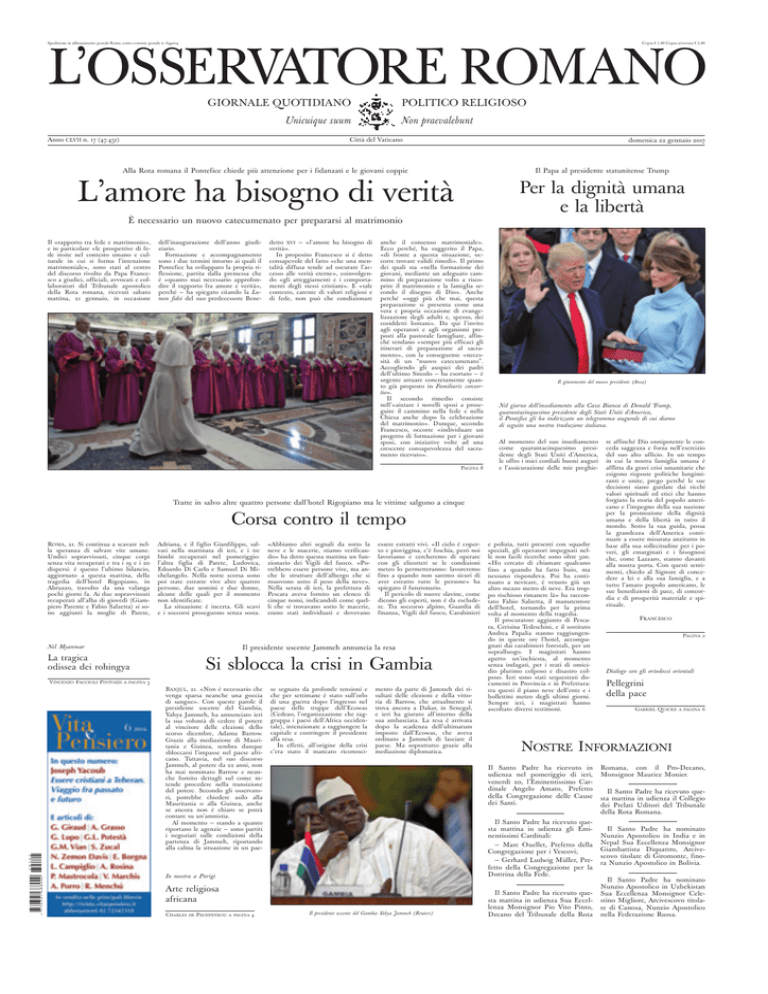 Spedizione in abbonamento postale Roma, conto corrente postale n. 649004 Copia € 1,00 Copia arretrata € 2,00 L’OSSERVATORE ROMANO POLITICO RELIGIOSO GIORNALE QUOTIDIANO Non praevalebunt Unicuique suum Anno CLVII n. 17 (47.451) Città del Vaticano domenica 22 gennaio 2017 . Alla Rota romana il Pontefice chiede più attenzione per i fidanzati e le giovani coppie Il Papa al presidente statunitense Trump L’amore ha bisogno di verità Per la dignità umana e la libertà È necessario un nuovo catecumenato per prepararsi al matrimonio Il «rapporto tra fede e matrimonio», e in particolare «le prospettive di fede insite nel contesto umano e culturale in cui si forma l’intenzione matrimoniale», sono stati al centro del discorso rivolto da Papa Francesco a giudici, officiali, avvocati e collaboratori del Tribunale apostolico della Rota romana, ricevuti sabato mattina, 21 gennaio, in occasione dell’inaugurazione dell’anno giudiziario. Formazione e accompagnamento sono i due termini intorno ai quali il Pontefice ha sviluppato la propria riflessione, partita dalla premessa che è «quanto mai necessario approfondire il rapporto fra amore e verità», perché — ha spiegato citando la Lumen fidei del suo predecessore Bene- detto XVI — «l’amore ha bisogno di verità». In proposito Francesco si è detto consapevole del fatto «che una mentalità diffusa tende ad oscurare l’accesso alle verità eterne», coinvolgendo «gli atteggiamenti e i comportamenti degli stessi cristiani». E «tale contesto, carente di valori religiosi e di fede, non può che condizionare anche il consenso matrimoniale». Ecco perché, ha suggerito il Papa, «di fronte a questa situazione, occorre trovare validi rimedi». Il primo dei quali sta «nella formazione dei giovani, mediante un adeguato cammino di preparazione volto a riscoprire il matrimonio e la famiglia secondo il disegno di Dio». Anche perché «oggi più che mai, questa preparazione si presenta come una vera e propria occasione di evangelizzazione degli adulti e, spesso, dei cosiddetti lontani». Da qui l’invito agli operatori e agli organismi preposti alla pastorale famigliare, affinché rendano «sempre più efficaci gli itinerari di preparazione al sacramento», con la conseguente «necessità di un “nuovo catecumenato”. Accogliendo gli auspici dei padri dell’ultimo Sinodo — ha esortato — è urgente attuare concretamente quanto già proposto in Familiaris consortio». Il secondo rimedio consiste nell’«aiutare i novelli sposi a proseguire il cammino nella fede e nella Chiesa anche dopo la celebrazione del matrimonio». Dunque, secondo Francesco, occorre «individuare un progetto di formazione per i giovani sposi, con iniziative volte ad una crescente consapevolezza del sacramento ricevuto». PAGINA 8 Il giuramento del nuovo presidente (Ansa) Nel giorno dell’insediamento alla Casa Bianca di Donald Trump, quarantacinquesimo presidente degli Stati Uniti d’America, il Pontefice gli ha indirizzato un telegramma augurale di cui diamo di seguito una nostra traduzione italiana. Al momento del suo insediamento come quarantacinquesimo presidente degli Stati Uniti d’America, le offro i miei cordiali buoni auguri e l’assicurazione delle mie preghie- Tratte in salvo altre quattro persone dall’hotel Rigopiano ma le vittime salgono a cinque Corsa contro il tempo ROMA, 21. Si continua a scavare nella speranza di salvare vite umane. Undici sopravvissuti, cinque corpi senza vita recuperati e tra i 19 e i 20 dispersi: è questo l’ultimo bilancio, aggiornato a questa mattina, della tragedia dell’hotel Rigopiano, in Abruzzo, travolto da una valanga pochi giorni fa. Ai due sopravvissuti recuperati all’alba di giovedì (Giampiero Parente e Fabio Salzetta) si sono aggiunti la moglie di Parete, Adriana, e il figlio Gianfilippo, salvati nella mattinata di ieri, e i tre bimbi recuperati nel pomeriggio: l’altra figlia di Parete, Ludovica, Edoardo Di Carlo e Samuel Di Michelangelo. Nella notte scorsa sono poi state estratte vive altre quattro persone, due uomini e due donne, alcune delle quali per il momento non identificate. La situazione è incerta. Gli scavi e i soccorsi proseguono senza sosta. Nel Myanmar A PAGINA Si sblocca la crisi in Gambia 3 BANJUL, 21. «Non è necessario che venga sparsa neanche una goccia di sangue». Con queste parole il presidente uscente del Gambia, Yahya Jammeh, ha annunciato ieri la sua volontà di cedere il potere al vincitore delle elezioni dello scorso dicembre, Adama Barrow. Grazie alla mediazione di Mauritania e Guinea, sembra dunque sbloccarsi l’impasse nel paese africano. Tuttavia, nel suo discorso Jammeh, al potere da 22 anni, non ha mai nominato Barrow e neanche fornito dettagli sul come intende procedere nella transizione del potere. Secondo gli osservatori, potrebbe chiedere asilo alla Mauritania o alla Guinea, anche se ancora non è chiaro se potrà contare su un’amnistia. Al momento — stando a quanto riportano le agenzie — sono partiti i negoziati sulle condizioni della partenza di Jammeh, riportando alla calma la situazione in un paey(7HA3J1*QSSKKM( +/!z!#!$!?! essere estratti vivi. «Il cielo è coperto e pioviggina, c’è foschia, però noi lavoriamo e cercheremo di operare con gli elicotteri se le condizioni meteo lo permetteranno: lavoreremo fino a quando non saremo sicuri di aver estratto tutte le persone» ha spiegato il funzionario. Il pericolo di nuove slavine, come dicono gli esperti, non è da escludere. Tra soccorso alpino, Guardia di finanza, Vigili del fuoco, Carabinieri Il presidente uscente Jammeh annuncia la resa La tragica odissea dei rohingya VINCENZO FACCIOLI PINTOZZI «Abbiamo altri segnali da sotto la neve e le macerie, stiamo verificando» ha detto questa mattina un funzionario dei Vigili del fuoco. «Potrebbero essere persone vive, ma anche le strutture dell’albergo che si muovono sotto il peso della neve». Nella serata di ieri, la prefettura di Pescar