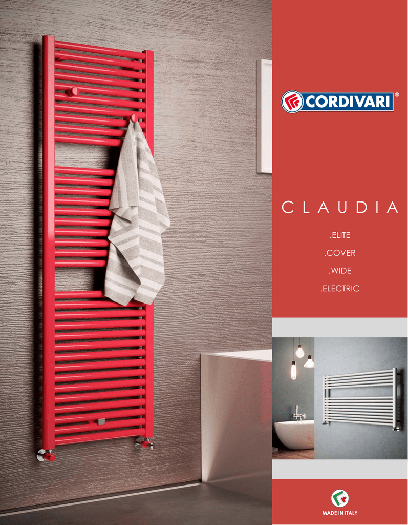 C L A U D I A .ELITE .COVER .WIDE .ELECTRIC Claudia ELITE ® Material: • Vertical collectors in painted mild steel semi oval 30x40 mm •Horizontal heating elements in painted mild steel ø 25 mm Technical data: Max pressure : 8 bar - Max temperature: 110 °C Fixing kit: The fixing kit is in compliance with norm VDI 6036 Class 1-2-3-4 that guarantees maximum resistance, security and stability of the towel rail. Each kit includes brackets, Airvent, hexagonal tool, plugs and screws suitable for use on either compact or hollow brick walls. For a correct assembly always refer to the user manual supplied. Packing: The radiator is protected by carton box. User notice included. Painting process: Painted with ecological epoxy powders. (Certificate DIN 55900-1,-2) Colour: Claudia® Elite radiator is available on request in all the colours from the chart Accessories: Claudia® Elite radiator includes a pair of hooks in the same colour of the radiator and coloured Kristal valves kit, complete with fittings for copper and multilayer. 70 - 82 Materiali: • Collettori verticali in acciaio al carbonio verniciato semiovali 30x40 mm •Corpi radianti orizzontali in acciaio al carbonio verniciato ø 25 mm Dati tecnici: Pressione di esercizio: 8 bar - Temperatura massima :110 °C Kit di fissaggio: Kit di fissaggio conformi VDI 6036 Classe 1-2-3-4, a garanzia di massima tenuta, sicurezza e stabilità del termoarredo. I kit sono comprensivi di supporti, valvolina di sfiato, chiave esagonale, tasselli e viti per fissaggio, idonei per impiego su pareti compatte o in laterizio forato. Per una corretta installazione riferisi sempre alle istruzioni di montaggio a corredo. Imballo: Il radiatore viene imballato in scatola di cartone riciclabile. Istruzioni uso e manutenzione a corredo. Verniciatura: A polveri epossipoliestere ecologiche con processo certificato DIN 55900-1,-2. Colore: l radiatore Claudia® Elite viene fornito con colore a richiesta scelto dalla tabella colori Accessori: Il radiatore Claudia® Elite, viene fornito comprensivo di coppia di appendiabiti in tinta con il radiatore e kit valvole kristal colorate, complete di raccorderia e rosette per rame e multistrato. NEW 55-77 1/2" Altezza Height H [mm] 1195 1411 1807 Kit misto Dual energy kit Largh. Width L [mm] Interasse Pipe Centres I [mm] Δt=50°C [Watt] [Watt] 450 500 600 450 500 600 450 500 600 400 450 550 400 450 550 400 450 550 534 595 716 648 719 862 821 907 1077 600 700 900 700 900 900 900 900 1200 H CLAUDIA® ELITE 45 ≥110 I codici in tabella si riferiscono ai modelli di colore BIANCO R01 Code nr. are referred to colour PURE WHITE R01 1/2" I 1/2" Quotes for Cordivari Kristal valves L L’unico scaldasalviette FULL OPTIONAL Basta indicare dimensioni e colore desiderati Un UNICO PREZZO per tutti i colori...accessori inclusi. The only FULL OPTIONAL towel rail Just need to choose size and colour. A SINGLE PRICE for all colours...accessories included. + + Misure valide per valvole Kristal Cordivari + KIT VALVOLA COMPLETO e COLORATO KIT 2 APPENDINI COLORATI KIT FISSAGGIO COLORATO COMPLETE COLOURED VALVE KIT INCLUDED COLOURED 2 HOOKS KIT INCLUDED COLOURED FIXING KIT INCLUDED Claudia ELITE ® I 60 1-2-3- 4 c las s 36 VD NEW 5 YEARS WARRANTY RADIATORS, CONVECTORS AND CEILING-MOUNTED RADIANT PANELS, HOT WATER HEATING, FAN ASSISTED AND MIXED Claudia I 60 1-2-3- 4 c las s 36 VD ® 5 YEARS WARRANTY RADIATORS, CONVECTORS AND CEILING-MOUNTED RADIANT PANELS, HOT WATER HEATING, FAN ASSISTED AND MIXED Claudia ® Altezza Height H [mm] 763 1195 1411 1807 Largh. Width L [mm] Interasse Pipe Centres I [mm] Codice Code nr. Codice Code nr. 400 450 500 550 600 750 1000 400 450 500 550 600 750 1000 400 450 500 550 600 750 1000 400 450 500 550 600 750 1000 350 400 450 500 550 700 950 350 400 450 500 550 700 950 350 400 450 500 550 700 950 350 400 450 500 550 700 950 3551356100025 3551356100001 3551356100004 3551356100008 3551356100011 3551356100015 3551356100019 3551356100026 3551356100002 3551356100005 3551356100009 3551356100012 3551356100016 3551356100020 3551356100027 3551356100023 3551356100006 3551356100024 3551356100013 3551356100017 3551356100021 3551356100028 3551356100003 3551356100007 3551356100010 3551356100014 3551356100018 3551356100022 3551356101025 3551356101001 3551356101004 3551356101008 3551356101011 3551356101015 3551356101019 3551356101026 3551356101002 3551356101005 3551356101009 3551356101012 3551356101016 3551356101020 3551356101027 3551356101023 3551356101006 3551356101024 3551356101013 3551356101017 3551356101021 3551356101028 3551356101003 3551356101007 3551356101010 3551356101014 3551356101018 3551356101022 Particolare della versione Interasse 50 mm. Kit misto Dual energy kit Δt=50°C 1/2" [Watt] [Watt] 316 349 389 430 470 591 792 478 534 595 656 716 899 1202 583 648 719 791 862 1077 1434 753 821 907 992 1077 1333 1760 400 400 400 500 500 700 900 600 600 700 700 900 900 1200 700 700 900 900 900 1200 1200 900 900 900 1200 1200 1200 1200 1/2" 50 Detail of the pipe centres 50 mm version 55-77 1/2" 45 ≥110 CLAUDIA INTERASSE 50 mm 50 mm PIPE CENTRES 70 - 82 INTERASSE STANDARD STANDARD PIPE CENTRES ® Material: • Vertical collectors in painted mild steel semi oval 30x40 mm •H orizontal heating elements in painted mild steel ø 25 mm Technical data: Max pressure : 8 bar - Max temperature: 110 °C Fixing kit: The fixing kit is in compliance with norm VDI 6036 Class 1-2-3-4 that guarantees maximum resistance, security and stability of the towel rail. Each kit includes brackets, Airvent, hexagonal tool, plugs and screws suitable for use on either compact or hollow brick walls. For a correct assembly always refer to the user manual supplied. Packing: The radiator is protected by carton box. User notice included. Painting process: Painted with ecological epoxy powders. (Certificate DIN 55900-1,-2) Colour: Standard Pure white RAL 9010. Other colours see colour chart. H Materiali: • Collettori verticali in acciaio al carbonio verniciato se