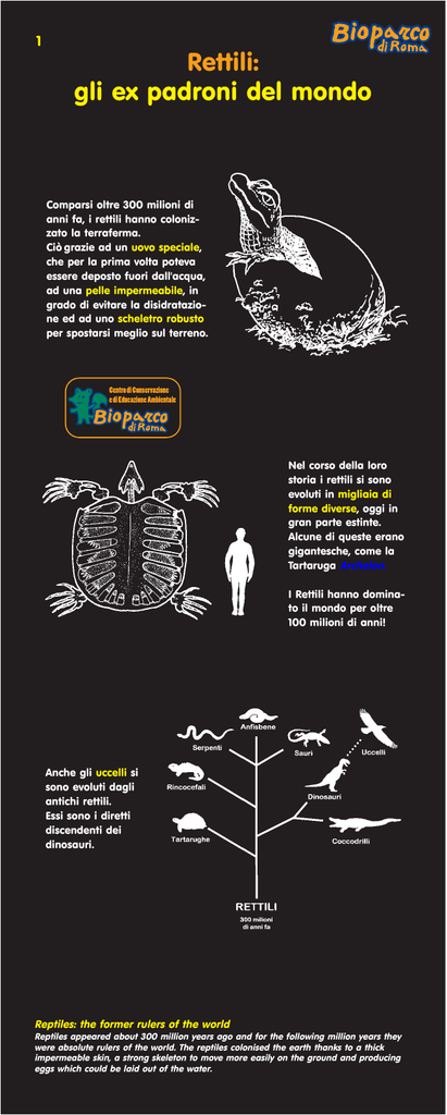 1 Rettili: gli ex padroni del mondo Comparsi oltre 300 milioni di anni fa, i rettili hanno colonizzato la terraferma. Ciò grazie ad un uovo speciale, che per la prima volta poteva essere deposto fuori dall'acqua, ad una pelle impermeabile, in grado di evitare la disidratazione ed ad uno scheletro robusto per spostarsi meglio sul terreno. Centro di Conservazione e di Educazione Ambientale Nel corso della loro storia i rettili si sono evoluti in migliaia di forme diverse, oggi in gran parte estinte. Alcune di queste erano gigantesche, come la Tartaruga Archelon. I Rettili hanno dominato il mondo per oltre 100 milioni di anni! Anche gli uccelli si sono evoluti dagli antichi rettili. Essi sono i diretti discendenti dei dinosauri. Reptiles: the former rulers of the world Reptiles appeared about 300 million years ago and for the following million years they were absolute rulers of the world. The reptiles colonised the earth thanks to a thick impermeable skin, a strong skeleton to move more easily on the ground and producing eggs which could be laid out of the water. 2 Rettili: Presenti ovunque, o quasi I rettili abitano la quasi totalità delle terre emerse e dei mari del Pianeta. Essi si sono adattati a vivere negli ambienti più diversi: dai deserti più caldi, alle acque del mare, alle fitte foreste presenti nelle regioni tropicali e sub-tropicali, dove si concentra la maggior parte delle specie. Centro di Conservazione e di Educazione Ambientale Soltanto nelle regioni polari, in Groenlandia e in Islanda non sono presenti rettili, a causa del freddo eccessivo. Almost everywhere I rettili sono infatti eterotermi, ovvero incapaci di mantenere una temperatura corporea costante come fanno i mammiferi e gli uccelli. Reptiles are adapted to live in a wide variety of environments and live almost everywhere on the earth and in the water. However, reptiles are not able to maintain a constant body temperature and for this reason they have not colonised areas such as the north and the south Poles, Greenland and Iceland. 3 Rettili: Una varietà straordinaria Sauri 4479 Attualmente si conoscono ben 7.883 specie diverse di rettili! Sauri, serpenti e anfisbene fanno parte dell'ordine degli Squamati, mentre Tartarughe e Coccodrilli sono ordini a parte così come i Rincocefali, antichissime lucertole rimaste immutate da 200 milioni di anni! Le anfisbene sono tra i rettili meno noti: simili a grossi vermi vivono prevalentemente sottoterra e si nutrono di invertebrati. Serpenti 2926 Centro di Conservazione e di Educazione Ambientale Tartarughe 296 Anfisbene 157 Coccodrilli An extraordinary variety 23 Rincocefali There are 7883 known species of reptiles consisting of lizards, snakes, worm lizards, tortoises and turtles, crocodiles and tuataras. The latter are very ancient lizards, which have remained unchanged for 200 million years. 2 4 Rettili: Tanti modi per spostarsi I serpenti e gli altri rettili apodi, ovvero senza zampe, riescono ad arrampicarsi e a muoversi velocemente facendo leva sulle squame ventrali mosse dai potenti muscoli intercostali. Le tartarughe marine hanno invece modificato le zampe in pinne, per nuotare meglio. In caso di pericolo il Basilisco è addirittura in grado di correre sull'acqua con le zampe posteriori, raggiungendo i 10 Km orari. Centro di Conservazione e di Educazione Ambientale Grazie ad una piega cutanea, sorretta dal prolungamento delle costole, il Drago volante può persino planare nell'aria lanciandosi dagli alberi. Lots of ways to move Snakes and other reptiles without legs move very quickly by raising their rough ventral scales. Turtles have modified their legs into flippers in order to swim well. Basilisk is able to run on water with its back legs and the Flying Dragon moves amongst the trees using the membrane between its limbs and body which acts like wings. 5 Rettili: Diete differenziate Molti rettili sono quasi esclusivamente vegetariani, come le testuggini terrestri, le iguane ed altri sauri. Altri sono insettivori, e a volte utilizzano la lingua vischiosa ed estroflettibile per catturare le prede, come fanno i camaleonti. Le tartarughe acquatiche, i serpenti e i coccodrilli sono invece generalmente carnivori, in grado di catturare animali anche molto grandi. Per uccidere rapidamente la preda la maggior parte dei serpenti la avvolge tra le spire e la soffoca, comprimendone la cassa toracica ed impedendole di respirare. Centro di Conservazione e di Educazione Ambientale Tutti i serpenti, come il Mangiatore di uova, hanno inoltre la possibilità di dilatare enormemente la bocca e l'esofago, riuscendo ad ingoiare prede molto più grandi di loro anche grazie alle ossa disarticolabili della mandibola. What do they eat? Reptiles have a very varied diet. There are those which are vegetarians, for example iguanas and tortoises, those which are predators like crocodiles and turtles and also those which are insect eaters like chameleons. Snakes have the possibility to swallow prey much bigger than themselves thanks the ability to dislocate their jaw and the possibility to expand their oesophagus. 6 Rettili: Veleno! Circa il 15% dei serpenti del mondo è velenoso. Il veleno serve per immobilizzare le prede, per facilitarne la digestione e, secondariamente, come arma di difesa. Il veleno, prodotto in apposite ghiandole della bocca, viene inoculato con il morso attraverso denti scanalati o cavi come gli aghi delle siringhe. Il veleno è composto da proteine particolari che agiscono generalmente sul sistema nervoso o circolatorio. Centro di Conservazione e di Educazione Ambientale In Italia gli unici serpenti velenosi pericolosi per l'uomo sono le vipere, tuttavia il loro morso ha raramente esiti letali. Paradossalmente sono molto più pericolose le punture di vespe e calabroni. In America esistono anche le uniche due lucertole velenose: gli Eloderma. Poisonous!? Only 15% of snakes are venomous. The venom serves to immobilise prey and facilitates digestion. It has a secondary u