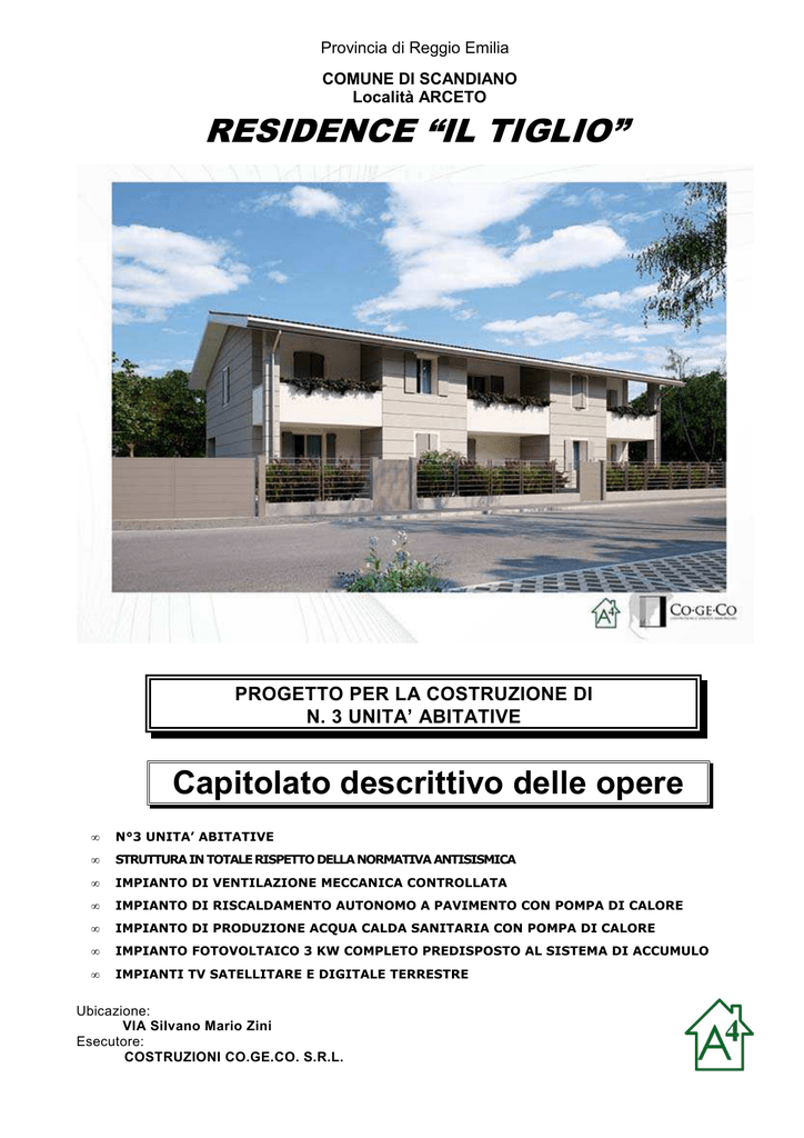 Provincia di Reggio Emilia COMUNE DI SCANDIANO Località ARCETO RESIDENCE “IL TIGLIO” PROGETTO PER LA COSTRUZIONE DI N. 3 UNITA’ ABITATIVE Capitolato descrittivo delle opere • N°3 UNITA’ ABITATIVE • STRUTTURA IN TOTALE RISPETTO DELLA NORMATIVA ANTISISMICA • IMPIANTO DI VENTILAZIONE MECCANICA CONTROLLATA • IMPIANTO DI RISCALDAMENTO AUTONOMO A PAVIMENTO CON POMPA DI CALORE • IMPIANTO DI PRODUZIONE ACQUA CALDA SANITARIA CON POMPA DI CALORE • IMPIANTO FOTOVOLTAICO 3 KW COMPLETO PREDISPOSTO AL SISTEMA DI ACCUMULO • IMPIANTI TV SATELLITARE E DIGITALE TERRESTRE Ubicazione: VIA Silvano Mario Zini Esecutore: COSTRUZIONI CO.GE.CO. S.R.L. Ottobre 2016 INTRODUZIONE L’iniziativa in oggetto verrà realizzata in località Arceto di Scandiano (RE), Via Silvano Mario Zini. Il complesso è stato progettato secondo le tecnologie e le tecniche più recenti con l’obiettivo di raggiungere il massimo della funzionalità e della razionalità delle varie unità in immobiliari, così da rendere inesistenti le spese comuni. L’intervento prevede la costruzione di una palazzina composta da sole 3 unità abitative, due villette indipendenti di testa e un appartamento centrale sempre indipendente. La costruzione si articola in 2 piani fuori terra. Caratteristica peculiare dell’intervento è l’adozione di avanzate tecnologie impiantistiche d’avanguardia volte al massimo contenimento del consumo energetico nel pieno rispetto dell’ambiente, predisposte al sistema di accumulo, infatti i tre alloggi saranno edificati in classe “A4”; in particolare si adotteranno le seguenti soluzioni progettuali: Il sistema di riscaldamento e di produzione dell’acqua calda ad uso sanitario sarà affidato ad una pompa di calore ad elevate prestazioni integrata da impianto solare fotovoltaico. La pompa di calore cattura l’energia termica dell’aria e la trasferisce all’ambiente, assorbendo energia elettrica. La macchina garantisce il funzionamento anche a bassissima temperatura, mentre appositi accumuli inerziali di acqua tecnica ed acqua calda ad usi sanitari offrono alla stessa il corretto volano termico al fine di assicurarle le migliori condizioni di funzionamento possibili. La macchina è inoltre in grado di provvedere alla produzione di energia frigorifera per la climatizzazione estiva, che nell’intervento in oggetto viene solamente predisposta vista l’attenta opera di coibentazione della struttura che offre le migliori prestazioni anche nella stagione calda. L’integrazione del suddetto sistema con pannelli solari fotovoltaici assicura la copertura parziale del carico elettrico dello stabile garantendo il più elevato autoconsumo e, di pari passo, il maggior risparmio tecnicamente perseguibile. Verrà inoltre predisposta la connessione di un eventuale accumulo per l’impianto fotovoltaico per poter rendere l’impianto autonomo ed autosufficiente creando un sistema ad ISOLA che dovrà attingere dal fornitore di energia elettrica solamente nei periodi più sfavorevoli dal punto di vista climatico nella produzione di energia. Il sistema così predisposto viene affiancato a terminali di emissione a bassa temperatura costituiti da pannelli radianti a pavimento. Questi ultimi garantiscono le più diffuse condizioni di benessere termoigrometrico, minimizzando il movimento, all’interno degli ambienti, di aria e polvere. Si prevede poi l’installazione di un sistema di ventilazione decentralizzato meccanico con recupero termico e filtro al fine di garantire le migliori condizioni dell’aria all’interno dei locali. Tutta la struttura sarà realizzata nel pieno rispetto delle ultime normative in tema di antisismica Il complesso in oggetto sarà costruito secondo i dettami del progetto esecutivo e con la descrizione delle opere di seguito specificate. Ottobre 2016 CAPITOLATO DESCRITTIVO DELLE OPERE Art. 1 - FONDAZIONI Le fondazioni dei muri perimetrali e portanti saranno in cemento armato di tipo continuo, della sezione e profondità che deriveranno dai calcoli statici e dalla natura del terreno. Gli eventuali pilastri poggeranno su plinti o travi pure in cemento armato di adeguata sezione e profondità. Art. 2 - SOLAI Tutti i solai saranno a struttura latero-cementizia tipo travetti e pignatte e saranno dimensionati e calcolati, in base alle vigenti Leggi, per un sovraccarico accidentale di 250 Kg/mq oltre ai pesi permanenti; H cm 20+4 o quanto deriverà dai calcoli. I solai poggeranno su travi in c.a. in spessore o in altezza. Il solaio della copertura sarà realizzato in latero cemento. Art. 3 - MURI Le murature saranno eseguite come di seguito specificato: • murature esterne di tamponamento ai piani terra e primo: saranno realizzate in laterizio alveolato Poroton o in Perlater dello spessore di cm 30 con all’esterno un “cappotto” con funzione di isolante termico dello spessore di massimo cm 16 e minimo 6 cm, rivestito con adeguati materiali resinosi; • murature divisorie interne all’alloggio: verranno realizzate in laterizio forato dello spessore di cm 8 intonacate su entrambi i lati; • parapetti balconi: saranno in muratura intonacata e tinteggiata, sulla base superiore verrà posizionata una copertina ; · dove previsto: strato isolante in pannelli a tutta altezza (100x285 cm) costituito da uno strato di fibra in tessile tecnico ad elevato potere fonoisolante ed ottima resistenza termica. Spessore 50 mm . Resistenza termica del pannello pari a 1,40 mq K/W. Art. 4 - OPERE IN CEMENTO ARMATO Oltre a tutte le fondazioni saranno in cemento armato tutte le strutture portanti in elevazione quali travi e pilastri. Tutte le suddette strutture saranno calcolate e dimensionate con i metodi della Scienza delle Costruzioni nel pieno rispetto delle vigenti Leggi e saranno realizzate con calcestruzzi e acciai di adeguata resistenza caratteristica e della migliore qualità. Le strutture saranno calcolate e dimensionate con criteri “antisismici”, in grado cioè di resistere ad ev