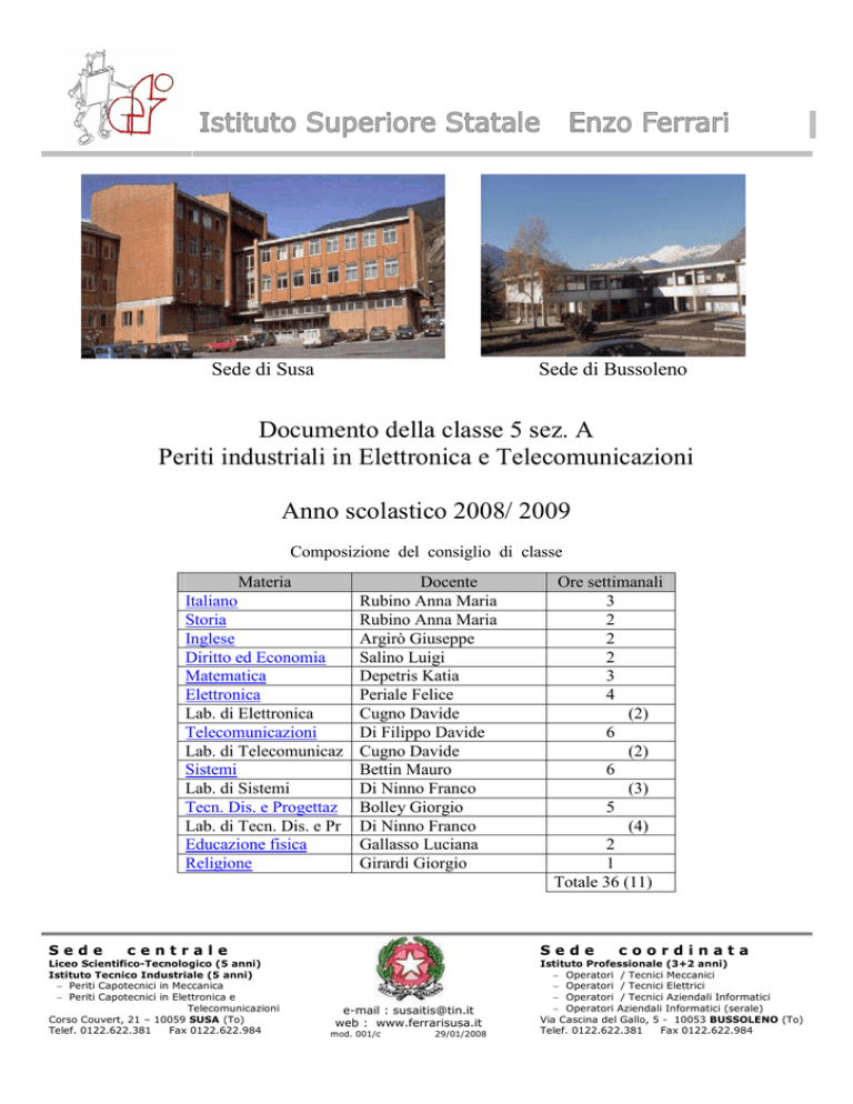 Sede di Susa Sede di Bussoleno Documento della classe 5 sez. A Periti industriali in Elettronica e Telecomunicazioni Anno scolastico 2008/ 2009 Composizione del consiglio di classe Materia Italiano Storia Inglese Diritto ed Economia Matematica Elettronica Lab. di Elettronica Telecomunicazioni Lab. di Telecomunicaz Sistemi Lab. di Sistemi Tecn. Dis. e Progettaz Lab. di Tecn. Dis. e Pr Educazione fisica Religione Sede Docente Rubino Anna Maria Rubino Anna Maria Argirò Giuseppe Salino Luigi Depetris Katia Periale Felice Cugno Davide Di Filippo Davide Cugno Davide Bettin Mauro Di Ninno Franco Bolley Giorgio Di Ninno Franco Gallasso Luciana Girardi Giorgio centrale Liceo Scientifico-Tecnologico (5 anni) Istituto Tecnico Industriale (5 anni) − Periti Capotecnici in Meccanica − Periti Capotecnici in Elettronica e Telecomunicazioni Corso Couvert, 21 – 10059 SUSA (To) Telef. 0122.622.381 Fax 0122.622.984 Ore settimanali 3 2 2 2 3 4 . (2) 6 . (2) 6 . (3) 5 . (4) 2 1 Totale 36 (11) Sede e-mail : [email protected] web : www.ferrarisusa.it mod. 001/c 29/01/2008 coordinata Istituto Professionale (3+2 anni) − Operatori / Tecnici Meccanici − Operatori / Tecnici Elettrici − Operatori / Tecnici Aziendali Informatici − Operatori Aziendali Informatici (serale) Via Cascina del Gallo, 5 - 10053 BUSSOLENO (To) Telef. 0122.622.381 Fax 0122.622.984 PARTE GENERALE Obiettivi generali dell'indirizzo di studi (figura del diplomato) Al termine del quinquennio il profilo del diplomato elettronico sarà caratterizzato dalle seguenti competenze: - analizzare e dimensionare reti elettriche lineari e non lineari; - analizzare le caratteristiche funzionali dei sistemi, anche complessi, di generazione, elaborazione e trasmissione di suoni, immagini e dati; - partecipare al collaudo e alla gestione di sistemi di vario tipo (di controllo, di comunicazione, di elaborazione delle informazioni) anche complessi, sovrintendendo alla manutenzione degli stessi; - progettare, realizzare e collaudare sistemi semplici, ma completi, di automazione e di telecomunicazioni, valutando, anche sotto il profilo economico, la componentistica presente sul mercato; - descrivere il lavoro svolto, redigere documenti per la produzione dei sistemi progettati e scriverne il manuale d'uso; - comprendere manuali d'uso, documenti tecnici vari e redigere brevi relazioni in lingua straniera. Obiettivi specifici della classe (conoscenze, competenze, capacità da acquisire alla fine dell’anno scolastico) Si possono sintetizzare nei seguenti punti: - raggiungimento di un bagaglio culturale che presenti un livello sufficiente nei vari saperi e non sia inficiato da gravi lacune su specifiche aree tematiche - capacità di esprimere correttamente i contenuti acquisiti relativamente alle singole discipline - sufficiente capacità nell’individuazione delle connessioni logiche fra i contenuti delle varie discipline - acquisizione di un metodo di studio efficace tale da permettere una programmazione autonoma e una autovalutazione delle abilità raggiunte - capacità di affrontare con esiti sufficienti tipologie di prove diversificate Obiettivi trasversali della classe Sono stati suddivisi secondo due seguenti aree di indirizzo: Area linguistico-storico-letteraria comprendente: Area scientifico-tecnologica comprendente: Lingua e lettere italiane Storia Lingua straniera Economia industriale ed elementi di diritto Matematica Elettronica Sistemi automatici Telecomunicazioni Tecnologia disegno e progettazione - - Saper analizzare un tema tecnico individuando le principali parti funzionali ed il loro funzionamento di principio allo scopo di collocarli ciascuno nel proprio ambito disciplinare Saper analizzare quantitativamente semplici realizzazioni pratiche avvalendosi delle tecniche di calcolo acquisite nel corso degli studi utilizzando le conoscenze pluridisciplinari Conoscenza degli aspetti interdisciplinari relativi alle materie tecniche riconoscendo le aree tematiche comuni Essere partecipi nelle varie fasi di sviluppo dei vari progetti e corsi, dimostrandosi in grado di valutare le implicazioni tra i costi e le prestazioni nella realizzazione pratica. Quest’obiettivo potrà essere raggiunto se l’allievo dimostrerà adeguata conoscenza delle soluzioni tecnologiche vigenti relative alle diverse discipline caratterizzanti e conoscerà le caratteristiche dei componenti elettronici commerciali di uso corrente. Esser consapevoli dell’importanza e delle conseguenze relative agli aspetti normativi inerenti sia le realizzazioni tecniche che gli aspetti legati alla conoscenza del diritto. In particolare per quanto riguarda gli aspetti legati alle specifiche normative vigenti il perito dovrà fare riferimento alla normativa ed agli standard nazionali ed internazionali. 2 Metodologie didattiche (lezioni frontali, esercitazioni, ecc…) Le metodologie didattiche dovranno fornire agli allievi gli strumenti che consentano un loro più facile e non sprovveduto inserimento nel mondo del lavoro e metterli in grado di poter completare autonomamente quella preparazione specifica che sarà loro richiesta sul posto di lavoro. Questo avverrà attraverso: - lezioni frontali - esercitazioni in classe e a casa - sviluppo di progetti specifici sulla base di proposte avanzate dai docenti e dagli studenti - verifiche pratiche in laboratorio sulla funzionalità di componenti e sistemi analizzati in teoria - proiezioni di videocassette su argomenti specifici - ricerche bibliografiche avvalendosi anche di tecniche multimediali (CD-ROM, INTERNET, etc) - visite guidate ad aziende con lo scopo di mettere a contatto con la realtà del mondo del lavoro Tali tecniche si articoleranno in modo che la conoscenza dei diversi argomenti sia propedeutica a quelli più complessi. Strumenti di valutazione (numero e tipologia delle verifiche; compiti scritti, prove strutturate, ecc…) Il consiglio di Classe ha individuato collegialmente una comune tipologia di strumenti di valutazione: - 