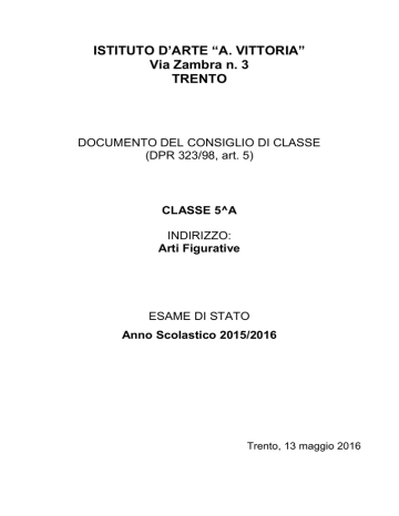 ISTITUTO D’ARTE “A. VITTORIA” Via Zambra n. 3 TRENTO DOCUMENTO DEL CONSIGLIO DI CLASSE (DPR 323/98, art. 5) CLASSE 5^A INDIRIZZO: Arti Figurative ESAME DI STATO Anno Scolastico 2015/2016 Trento, 13 maggio 2016 QUADRO SINTETICO DEL LICEO ARTISTICO “A. VITTORIA” Indirizzi (sezioni) n. classi n. alunni LICEO ARTISTICO (primo biennio) 11 215 LICEO ARTISTICO (secondo biennio) 11 251 Arti Figurative 7* 105 Multimedia 5* 65 Design 6* 57 Architettura e ambiente 2* 24 LICEO ARTISTICO (quinto anno) 4 79 Arti Figurative 1 23 Multimedia 2* 24 Design 3* 21 Architettura e ambiente 1* 11 Totali 26 * classi con la presenza di due indirizzi distinti Laboratori:16 1 Smalti e Microfusioni 1 Tiratura e Forgiatura 7 Arti Figurative 1 Design del Legno con sala macchine 2 Design industriale/Architettura con sala macchine 2 Discipline Plastiche con sala forni 2 Multimedia 1 Chimica 545 Aule speciali: 22 2 Discipline Grafiche e Pittoriche 2 Disegno Geometrico 5 Progettazione Arti Figurative 1 Progettazione Design del Gioiello 2 Progettazione Architettura e Design 3 Progettazione Multimediale 1 Chimica 1 Palestra 1 Biblioteca 1 Aula Magna 3 Sostegno Aule normali: 13 La situazione dei laboratori ed aule speciali è soddisfacente. E’ invece carente la dotazione di aule normali, che costringe docenti e studenti ad utilizzare, in parte, laboratori o aule speciale per effettuare lezioni di materie dell'area comune. La scuola presenta una percentuale di pendolari media del 60% circa, avendo utenti da quasi tutto il territorio provinciale e dall’Alto Adige, specialmente da Bolzano e paesi attestati lungo la Valle dell’Adige. Molti sono i rapporti di collaborazione tra scuola ed istituzioni o associazioni presenti sul territorio come di seguito evidenziato. BREVE PROFILO STORICO L’istituto nacque come sezione staccata dell’Istituto d’Arte di Venezia nel settembre 1953, sotto la direzione del prof. Bruno Colorio, proveniente dalla direzione della Scuola d’Arte di Pozza di Fassa. Dopo un inizio difficile con due sole classi, l’Istituto andò via via rafforzando la propria presenza sul territorio, ottenendo anche il riconoscimento dell’autonomia. Agli inizi si trattava di una scuola di tipo professionale. Chi usciva al termine del triennio superiore col titolo di Maestro d’Arte, poteva proseguire e completare gli studi all’Accademia o, superando un biennio di Magistero a Firenze, Venezia o Trieste, all’Università di Architettura. Con la riforma scolastica del 1970 veniva istituito il biennio unico sperimentale, che prevedeva, al termine del ciclo quinquennale di studi, l’esame di maturità d’Arte applicata che dava libero accesso ai corsi universitari. L’Istituto, dopo il pensionamento del Preside Colorio avvenuto nel 1970, ha visto in pochi anni avvicendarsi alla presidenza i proff. Pacher, Novello, Angelini e Cattani. Dal 1986 al 2010 è stato preside il prof. Sergio Filosi. All’epoca la scuola presentava tre indirizzi formativi: Arte del Legno, Arte del Metallo e Decorazione Pittorica. Dal 1989 l’Istituto ha visto il progressivo dispiegarsi di un’azione di rinnovamento ed adeguamento degli insegnamenti alle mutate esigenze educative in rapporto all’utenza del territorio. E’ stata allora istituita la nuova sezione di Architettura e Arredamento con la successiva soppressione della sezione Arte del Legno; sono state poi attivate le minisperimentazioni della Lingua Inglese e della Matematica con Informatica, pur nella forma dell’opzionalità. Nel settembre 1993 è stato attivato un progetto sperimentale con gli indirizzi di Design e Pittura & Visual Art e nel 2005 è stata avviata la maxisperimentazione con l’indirizzo di Virtual Design. I tre corsi adottavano una struttura di tipo liceale che si concludeva con l’esame di maturità d’Arte applicata ad indirizzo sperimentale che dava accesso all’università. Infine il corso di Arte del Metallo ha assunto la nuova denominazione di Arte dell’oreficeria. A partire dall’anno scolastico 2010/2011 è stata definitivamente attuata la delibera della Giunta Provinciale del 2005 e l’Istituto ha formato, assieme al Liceo Musicale Coreutico “Bonporti” di Trento e all’Istituto d’Arte “Depero” di Rovereto il nuovo “Istituto delle Arti di Trento e Rovereto” dando quindi avvio, sotto la dirigenza del Prof. Cattani, alla riforma dell’istruzione artistica con l’istituzione del nuovo Liceo Artistico con gli indirizzi di Design (del gioello, industriale, del legno), Arti Figurative, Audiovisivo e Multimedia ed Architettura ed Ambiente. Nell'anno scolastico 2012/2013 in seguito al pensionamento del prof. Cattani è stata nominata Dirigente la prof.ssa Elina Massimo e nell'anno 2014/2015 il Prof. Paolo Rasera. Tra le varie attività che hanno visto l’Istituto operare sul territorio va ricordato per il passato la partecipazione pluriennale con lavori degli studenti alla Fiera Internazionale di Monaco di Baviera, a quella nazionale dell’Artigianato di Firenze, a concorsi per il design del mobile alla Triennale Internazionale di Milano; la sezione Metalli ha realizzato l’urna bronzea destinata alla custodia in Duomo delle reliquie dei Martiri Anauniensi (medaglia d’oro di San Vigilio). In anni più recenti, considerando centrale il rapporto scuola – territorio, è stata presentata crescente attenzione alle richieste esterne di collaborazione, che sono utilizzate come utile tirocinio formativo in preparazione al mondo del lavoro. Tra le più importanti vale la pena di ricordare: varie elaborazioni di materiale grafico, quali manifesti, pieghevoli ed altro per la promozione di attività di rilevanza sociale per vari enti pubblici e privati; interventi decorativi presso scuole, asili ed anche presso l’ospedale di Trento; costruzioni di oggetti tridimensionali per il Carnevale Tridentino e le Feste Vigiliane; costumi ed allestimenti scenografici per rappresentazioni teatrali; oggetti di arredo per diverse s