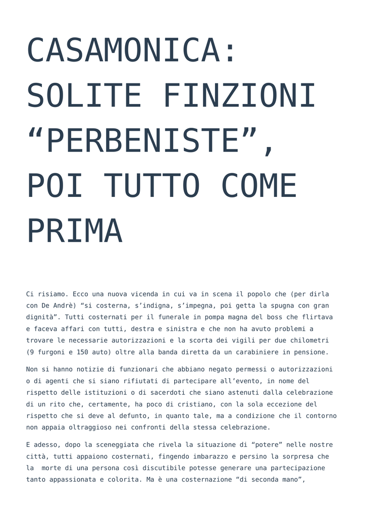 CASAMONICA: SOLITE FINZIONI “PERBENISTE”, POI TUTTO COME PRIMA Ci risiamo. Ecco una nuova vicenda in cui va in scena il popolo che (per dirla con De Andrè) “si costerna, s’indigna, s’impegna, poi getta la spugna con gran dignità”. Tutti costernati per il funerale in pompa magna del boss che flirtava e faceva affari con tutti, destra e sinistra e che non ha avuto problemi a trovare le necessarie autorizzazioni e la scorta dei vigili per due chilometri (9 furgoni e 150 auto) oltre alla banda diretta da un carabiniere in pensione. Non si hanno notizie di funzionari che abbiano negato permessi o autorizzazioni o di agenti che si siano rifiutati di partecipare all’evento, in nome del rispetto delle istituzioni o di sacerdoti che siano astenuti dalla celebrazione di un rito che, certamente, ha poco di cristiano, con la sola eccezione del rispetto che si deve al defunto, in quanto tale, ma a condizione che il contorno non appaia oltraggioso nei confronti della stessa celebrazione. E adesso, dopo la sceneggiata che rivela la situazione di “potere” nelle nostre città, tutti appaiono costernati, fingendo imbarazzo e persino la sorpresa che la morte di una persona così discutibile potesse generare una partecipazione tanto appassionata e colorita. Ma è una costernazione “di seconda mano”, finzione autentica. Che va in scena tutte le volte che l’apparenza lo richieda. E’ provato e noto a tutti che il potere romano, senza distinzione di colore o appartenenza, per ragioni di “potere” (di fronte a cui non si conoscono limiti etici o morali) si intratteneva in costanti frequentazioni con la famiglia del defunto e che, la numerosa partecipazione di “popolo”, che adesso sembra scandalizzare, era proprio la condizione che consentiva lo “spostamento” si voti e assicurava il successo alle urne, in sostituzione dei cittadini demotivati che alla politica chiederebbero altri ideali e altri risultati. Casamonica ha assicurato e assicura orde di elettori, capacità di presenza nel territorio, collusione con gli apparati amministrativi, vasta partecipazione di popolo. Sono tutte “cose” che richiederebbero impegno se si dovessero conquistare nei modi corretti, con la partecipazione della gente, con l’utilizzo degli strumenti della democrazia, con il rispetto delle regole. Ma che si possono comprare a “buon mercato” e in modo semplice, stringendo accordi con la “famiglia”, assicurando ciò che chiede. Tutto ciò finché non accadrà il contrario: la “famiglia”, piuttosto che farsi sfruttare da politici senza midollo né ideali, penserà di fare da sé, grazie allo sdoganamento di metodi e politiche senza scrupoli. E lo farà allo stesso modo, magari manifestando di essere democratica, antifascista e contro ogni forma di corruzione, proprio come vogliono apparire i nostri politici attuali. E’ tutta una finzione che dura da diverso tempo. E non è affatto colpa dei Casamonica. E’ solo l’esito inevitabile della “furbizia idiota” di chi per avere un successo o un profitto immediato sacrifica i valori della convivenza civile e non ha scrupoli di usare la menzogna, il raggiro, la propaganda e persino gli accordi truffaldini. E la democrazia è bella che svenduta, in nome della stessa democrazia. Da troppo tempo questa “stupida furbizia” va in scena. Abbiamo visto, infatti, appassionati democratici sfilare contro la mafia e lasciare il comizio a politici collusi e indagati per fatti di corruzione; pomposi e tronfi amministratori intestare edifici comunali a Peppino Impastato in una città dove il vertice politico è coinvolto in affari di prostituzione minorile, affidamenti illegittimi, violazione di vincoli urbanistici a favore di privati; accordi elettorali farlocchi sostenuti da chi vorrebbe ergersi a paladino della legalità, ecc. E adesso va in scena l’indignazione. E’ facile indignarsi per fatti lontani, come se si trattasse di un romanzo lontano. Casamonica (che così lontano non è, anzi aspettiamo di apprendere quanto sia vicino), in fondo, non faceva niente di diverso da alcuni nostri politici locali. Interveniva negli affidamenti, condizionava gli appalti, decideva le assunzioni, speculava sull’utilizzo del territorio a favore di interessi privati, faceva accordi illeciti in cambio di voti, e così via dicendo. E se le cose stanno così, perché stanno così, ho il sospetto che, alla fine dei conti, ci abbia impensierito la pioggia di petali di rose lanciata dall’elicottero o la carrozza nera trainata da cavalli di razza. Tutto qui. Non mi sembra di avere assistito alla manifestazione di buoni propositi o alla consapevolezza di una responsabilità diffusa che richiede l’intervento di ciascuno di noi, prima che il fenomeno si impossessi in modo definitivo del sistema in cui viviamo. Non è sbagliato indignarsi, altrochè! Dovremmo farlo più spesso e con maggiore convinzione, ma non soltanto quando il fenomeno assume queste proporzioni nella tv di Stato. Ma già quando si manifesta nella nostra vita quotidiana. E non penseremo certo che i mafiosi “de noantri” si presentino in piazza con elicotteri e cavalli o con la banda! Quelli più vicini a noi non sono Rom, non hanno necessariamente cognomi “famosi” e non avvertono la necessità di ostentare (anche per ragioni di tirchieria) e portare in piazza la loro prepotenza. Sono meno capaci e preferiscono nascondersi, magari ostentano auto di lusso, ma non vogliono essere chiamati “soliti noti” oppure (i più patetici) per nascondersi viaggiano con una macchina vecchia, così da non destare sospetti, in modo da potere apparire “proletari, autorizzati, fuori dall’ottica del sistema”. E sono i peggiori perché svendono ogni cosa pubblica al primo offerente. Chi si è indignato, ma davvero, per il grave oltraggio alle istituzioni messo in atto con il funerale del boss, dovrebbe indignarsi allo stesso modo tutte le volte che abbia notizie, nella propria città, di appalti 