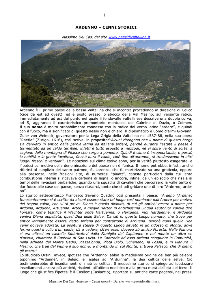 1 ARDENNO – CENNI STORICI Massimo Dei Cas, dal sito www.paesidivaltellina.it Ardenno è il primo paese della bassa Valtellina che si incontra procedendo in direzione di Colico (cioè da est ad ovest), ed è posto presso lo sbocco della Val Masino, sul versante retico, immediatamente ad est del punto nel quale il fondovalle valtellinese descrive una doppia curva, ad S, aggirando il caratteristico promontorio montuoso del Culmine di Dazio, o Colmen. Il suo nome è molto probabilmente connesso con la radice del verbo latino “ardere”, e quindi con il fuoco, ma il significato di questo nesso non è chiaro. Il diplomatico e uomo d'armi Giovanni Guler von Weineck, governatore per la Lega Grigia della Valtellina nel 1587-88, nella sua opera “Raetia” (Zurigo, 1616), così scrive, in proposito:“Alcuni ritengono che il nome di questo borgo sia derivato in antico dalla parola latina ed italiana ardere, perché durante l’estate il paese è tormentato da un caldo terribile; infatti è tutto esposto a mezzodì, né vi spira vento di sorte, a cagione della montagna di Pilasco che sorge a ponente. Quindi il clima è insopportabile, e perciò la nobiltà e la gente facoltosa, finché dura il caldo, cioè fino all’autunno, si trasferiscono in altri luoghi freschi e ventilati”. Le notazioni sul clima estivo sono, per la verità piuttosto esagerate, e l’ipotesi sul motivo della denominazione del paese non è l’unica. Il nome potrebbe, infatti, anche riferirsi al supplizio del santo patrono, S. Lorenzo, che fu martirizzato su una graticola, oppure alla presenza, nelle frazioni alte, di numerosi “piuàtt”, cataste particolari dalla cui lenta combustione interna si ricavava carbone di legna, o ancora, infine, da un episodio che risale ai tempi delle invasioni barbariche, quando una squadra di cavalieri che percorsero la valle tentò di dar fuoco alle case del paese, senza riuscirci, tanto che si udì gridare uno di loro “Arde-no, ardeno”. Lo storico settecentesco Francesco Saverio Quadrio così presenta il paese: “Ardeno (Ardena) Innocentemente si è scritto da alcuni essere stato tal luogo così nominato dall'Ardere per motivo del troppo caldo, che vi si prova. Diana è quella divinità, di cui gli Antichi resero il nome per Ardoina, Arduena, Artuenna. Arten, o meglio Harten in antichissima Lingua Teutonica voleva dire Foresta, come testifica il Wachter onde Hartuenna, o Hartuena, indi Harduenna, e Arduena veniva Diana appellata, quasi Dea delle Selve. Da ciò fu questo Luogo nomato, che trovo per antico latinamente essersi detto Ardena per contrazione di Arduena: perchè quivi quella Dea venir doveva adorata. La positura stessa di questo Luogo situato in un ridosso di Monte, dove forma quasi il collo d'un piede, dà a vedere, ch'ivi esser doveva ab antico Foresta. Nella Pianura ci era altresì un castello fabbricatovi dalla Famiglia de' Capitanei: e nel monte un altro ve n'aveva, chiamato il Castello di San Lucio. Le Contrade ad esso Ardeno congiunte in Comunità, nella schiena del Monte Gadio, Piazzalonga, Plota Biolo, Scheneno, la Fossa, e in Pianura il Masino, che trae dal Fiume il suo nome; e montando in sul Monte, si trova Pelasco, che di dietro gli resta.” Lo studioso Orsini, invece, ipotizza che "Ardenno" abbia la medesima origine del ben più celebre toponimo "Ardenne", in Belgio, e risalga ad "Arduinna", la dea celtica delle selve. Ciò testimonierebbe di insediamenti di matrice celtica. Il medesimo storico si spinge ad ipotizzare insediamenti ancora più antichi, risalenti all'ultimo neolitico o alla prima metà dell'età del ferro. Il luogo che giustifica l'ipotesi è il Caslàsc (Caslaccio), riportato su antiche carte pagensi, nei pressi Massimo Dei Cas Ardenno – Cenni storici – Dal sito www.paesidivaltellina.it 2 dell'attuale Scheneno, quindi ad una quota approssimativa di 520 metri, sullo sperone posto proprio all'imbocco della Val Masino. Il toponimo, secondo lui, come quello di Caslido (località sul versante meridionale della Colma di Dazio), rimanda al concetto di "castelliere", ben distinto da "castello" (che si riflette, invece, nelle voci dialettali "castèel" e "catég"). Un castelliere è, in un certo senso, l'antenato del castello: si tratta di un piccolo villaggio fortificato, costituito da una torre centrale e da una cerchia di mura, di cui sono rimaste tracce, che rimandano ad epoche preistoriche, nell'Istria e nella Venezia Giulia. In epoca romana queste strutture furono utilizzate come fortilizi, spesso trasformati, infine, in epoca medievale, nei più conosciuti castelli. Se l'Orsini ha ragione, dunque, la zona di Scheneno era abitata già sin dalla fine dell'età della pietra. Ma si tratta solo di un'ipotesi toponomastica. La chiesa parrocchiale di San Lorenzo Ardenno Se rimangono incerti l'etimo e la storia remota di Ardenno, certo, invece, è il suo illustre passato storico. Sempre il von Weineck scrive: “ …Segue il borgo di Ardenno, dove sorge la chiesa prepositurale di S. Lorenzo, che un giorno estendeva la sua giurisdizione a quasi tutte le chiese sulla destra dell’Adda, dal torrente che bagna Pedemonte sino al torrente Acquàa presso Civo, e sulla sinistra dell’Adda dal comune di Forcola alla valle del Bitto…In Ardenno tengono la loro ordinaria residenza i Paravicini…” Assai antica ed importante fu la pieve di Ardenno. A metà del secolo XIII, infatti, l'intero territorio della media e bassa Valtellina e della Valchiavenna era suddiviso nelle pievi di Sondrio, Berbenno, Ardenno, Olonio, Samolaco e Chiavenna. La pieve di Ardenno, in particolare, comprendeva, almeno fino al 1363, oltre ad Ardenno, anche Buglio, Forcola, Talamona, Morbegno, Albaredo, Bema, Campovico, Civo e Dazio: in sostanza l'intero Terziere inferiore della Valtellina (l'attuale bassa Valtellina) era suddivise fra le pievi di Ardenno ed Olonio. Ancora a metà del Quattrocento, dopo la defezione di Talamona e Morbegno, rimanevano legate alla pieve di Ardenn