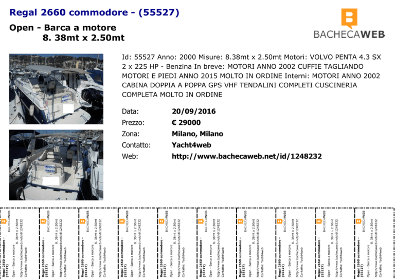 8. 38mt x 2.50mt 8. 38mt x 2.50mt 8. 38mt x 2.50mt 8. 38mt x 2.50mt 8. 38mt x 2.50mt 8. 38mt x 2.50mt 8. 38mt x 2.50mt 8. 38mt x 2.50mt Web: http://www.bachecaweb.net/id/1248232 Contatto: Yacht4web Yacht4web 8. 38mt x 2.50mt Contatto: http://www.bachecaweb.net/id/1248232 Milano, Milano Open - Barca a motore Zona: Regal 2660 commodore (55527) € 29000 Contatto: Yacht4web Prezzo: 8. 38mt x 2.50mt 20/09/2016 http://www.bachecaweb.net/id/1248232 Data: Open - Barca a motore Regal 2660 commodore (55527) Contatto: Yacht4web http://www.bachecaweb.net/id/1248232 Open - Barca a motore Regal 2660 commodore (55527) Contatto: Yacht4web http://www.bachecaweb.net/id/1248232 Open - Barca a motore Regal 2660 commodore (55527) Contatto: Yacht4web http://www.bachecaweb.net/id/1248232 Open - Barca a motore Regal 2660 commodore (55527) Contatto: Yacht4web http://www.bachecaweb.net/id/1248232 Open - Barca a motore Regal 2660 commodore (55527) Contatto: Yacht4web http://www.bachecaweb.net/id/1248232 Open - Barca a motore Regal 2660 commodore (55527) Contatto: Yacht4web http://www.bachecaweb.net/id/1248232 Open - Barca a motore Regal 2660 commodore (55527) Contatto: Yacht4web http://www.bachecaweb.net/id/1248232 Open - Barca a motore Regal 2660 commodore (55527) Contatto: Yacht4web http://www.bachecaweb.net/id/1248232 Open - Barca a motore Regal 2660 commodore (55527) Regal 2660 commodore - (55527) Open - Barca a motore 8. 38mt x 2.50mt Id: 55527 Anno: 2000 Misure: 8.38mt x 2.50mt Motori: VOLVO PENTA 4.3 SX 2 x 225 HP - Benzina In breve: MOTORI ANNO 2002 CUFFIE TAGLIANDO MOTORI E PIEDI ANNO 2015 MOLTO IN ORDINE Interni: MOTORI ANNO 2002 CABINA DOPPIA A POPPA GPS VHF TENDALINI COMPLETI CUSCINERIA COMPLETA MOLTO IN ORDINE