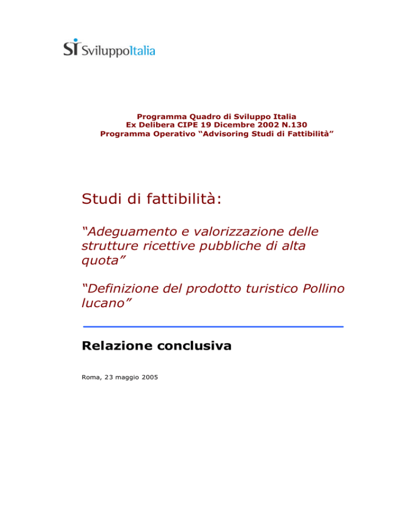 Programma Quadro di Sviluppo Italia Ex Delibera CIPE 19 Dicembre 2002 N.130 Programma Operativo “Advisoring Studi di Fattibilità” Studi di fattibilità: “Adeguamento e valorizzazione delle strutture ricettive pubbliche di alta quota” “Definizione del prodotto turistico Pollino lucano” Relazione conclusiva Roma, 23 maggio 2005 SdF Pollino Lucano INDICE CAPITOLO 1. ANALISI DELL’OFFERTA TURISTICA .................................................................................10 PARTE I - ANALISI DEGLI ATTRATTORI E DELL ’ACCESSIBILITÀ DELL’AREA...................................................... 10 1.1 IL SISTEMA DEGLI ATTRATTORI DI VALLE ......................................................................................................... 14 1.2 IL SISTEMA DEGLI ATTRATTORI DI A LTA QUOTA............................................................................................. 59 1.3 IL SISTEMA DI ACCOGLIENZA .............................................................................................................................. 90 1.4 L’ACCESSIBILITÀ AL TERRITORIO....................................................................................................................... 96 1.5UNA VISIONE COMPLESSIVA DELLA STRUTTURA DEL TERRITORIO ..............................................................127 1.6 INDIVIDUAZIONE DEI PRINCIPALI AMBITI TURI STICI DEL POLLINO LUCANO..............................................135 PARTE II - ANALISI DEL MERCATO TURISTICO......................................................................................................146 1.7 IL SISTEMA DI OSPITAL ITÀ.................................................................................................................................146 1.8 IL SISTEMA DELL’INCOMING ............................................................................................................................. 173 1.9 I PRODOTTI OFFERTI SUL MERCATO..................................................................................................................184 1.10 LA FILIERA TURISTICA DEL POLLINO............................................................................................................. 203 1.11 ANALISI SWOT DELLE COMPONENTI DELLA FILIERA TURISTICA DEL POLLINO LUCANO..................... 211 Allegato I – Interviste con gli operatori dell’incoming ........................... 217 Allegato II – Elenco degli esercizi alberghieri ed extralberghieri nell’area del Pollino Lucano .............................................................................. 217 PARTE III - ANALISI DEL SISTEMA DEI RIFUGI DI ALTA QUOTA..........................................................................218 1.12 L’OFFERTA DEI RIFUGI NELL ’AREA DEL PARCO DEL POLLINO LUCANO..................................................218 1.13 L’OFFERTA DEI RIFUGI NELL ’AMBITO D “ALTA QUOTA DEL POLLINO LUCANO” ..................................228 1.14 LE SCHEDE DEI RIFUGI ..................................................................................................................................... 244 Allegato I – Sopralluogo del 29 - 30 giugno 2004 ................................ 250 Allegato II – Schede Rifugi – Gestione e attività.................................. 250 Allegato III – Schede Rifugi – Strutture e planimetrie........................... 250 CAPITOLO 2. ANALISI DELLA DOMANDA TURISTICA ......................................................................... 251 2.1 PREMESSA METODOLOGICA ..............................................................................................................................251 2.2 A NALISI DEI MERCATI DI RIFERIMENTO........................................................................................................... 252 2.2.1 Il Turismo naturalistico o Eco-turismo ....................................... 254 2.2.2 Il turismo montano ................................................................ 260 2.2.3 Turismo Sportivo ................................................................... 262 2.2.4 Cicloturismo ......................................................................... 265 2.2.5 Il turismo scolastico ............................................................... 267 2.2.6 Turismo della salute (Turismo termale e benessere) .................... 268 2.2.7 Turismo culturale (Urbsturismo) ............................................... 271 2.2.8 Il turismo eno-gastronomico.................................................... 274 2.2.9 Il turismo sociale (Turismo accessibile) ...................................... 275 2.2.10 Il turismo religioso ............................................................... 277 2.2.11 Quadro sinottico delle caratteristiche principali delle tipologie di domanda turistica prese in esame.................................................... 278 2 SdF Pollino Lucano 2.2.12 La coerenza segmenti turistici/sistema locale di offerta nel Pollino Lucano........................................................................................ 288 2.3 CARATTERISTICHE ED EVOLUZIONI DEL TURISMO NATURALISTICO............................................................293 2.3.1 Caratteristiche del segmento turistico “Natura” ........................... 294 2.4 A NALISI DELLA DOMANDA ALBERGHIERA ED EXTRALBERGHIERA RIFERITA AL POLLINO LUCANO ......307 2.4.1 La dimensione....................................................................... 307 2.4.2 La provenienza ...................................................................... 322 2.4.3 La stagionalità....................................................................... 327 2.5 A NALISI DEI FLUSSI DI DOMANDA E SEGMENTAZIONE COMPLESSIVA DEL MERCATO DEL POLLINO LUCANO..............................................................................................................................................................