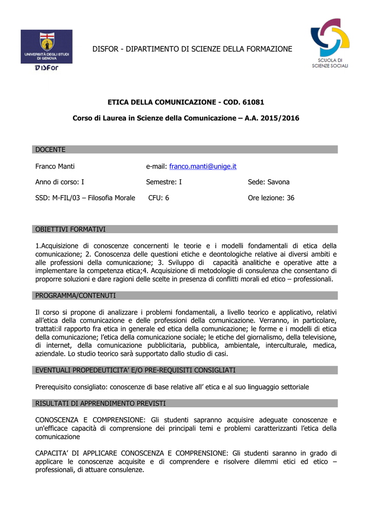 DISFOR - DIPARTIMENTO DI SCIENZE DELLA FORMAZIONE ETICA DELLA COMUNICAZIONE - COD. 61081 Corso di Laurea in Scienze della Comunicazione – A.A. 2015/2016 DOCENTE Franco Manti e-mail: [email protected] Anno di corso: I Semestre: I SSD: M-FIL/03 – Filosofia Morale CFU: 6 Sede: Savona Ore lezione: 36 OBIETTIVI FORMATIVI 1.Acquisizione di conoscenze concernenti le teorie e i modelli fondamentali di etica della comunicazione; 2. Conoscenza delle questioni etiche e deontologiche relative ai diversi ambiti e alle professioni della comunicazione; 3. Sviluppo di capacità analitiche e operative atte a implementare la competenza etica;4. Acquisizione di metodologie di consulenza che consentano di proporre soluzioni e dare ragioni delle scelte in presenza di conflitti morali ed etico – professionali. PROGRAMMA/CONTENUTI Il corso si propone di analizzare i problemi fondamentali, a livello teorico e applicativo, relativi all’etica della comunicazione e delle professioni della comunicazione. Verranno, in particolare, trattati:il rapporto fra etica in generale ed etica della comunicazione; le forme e i modelli di etica della comunicazione; l’etica della comunicazione sociale; le etiche del giornalismo, della televisione, di internet, della comunicazione pubblicitaria, pubblica, ambientale, interculturale, medica, aziendale. Lo studio teorico sarà supportato dallo studio di casi. EVENTUALI PROPEDEUTICITA’ E/O PRE-REQUISITI CONSIGLIATI Prerequisito consigliato: conoscenze di base relative all’ etica e al suo linguaggio settoriale RISULTATI DI APPRENDIMENTO PREVISTI CONOSCENZA E COMPRENSIONE: Gli studenti sapranno acquisire adeguate conoscenze e un'efficace capacità di comprensione dei principali temi e problemi caratterizzanti l’etica della comunicazione CAPACITA’ DI APPLICARE CONOSCENZA E COMPRENSIONE: Gli studenti saranno in grado di applicare le conoscenze acquisite e di comprendere e risolvere dilemmi etici ed etico – professionali, di attuare consulenze. AUTONOMIA DI GIUDIZIO: Gli studenti sapranno utilizzare le conoscenze per dare ragioni ed elaborare giustificazioni contestuali di metodologie di analisi e proposte di soluzione di dilemmi etici nell’ambito delle professioni della comunicazione ABILITA’ COMUNICATIVE: Gli studenti sapranno acquisire il linguaggio tecnico tipico della disciplina per comunicare in modo chiaro e senza ambiguità con interlocutori specialisti e non specialisti. CAPACITA’ DI APPRENDIMENTO: Gli studenti sapranno sviluppare adeguate capacità di apprendimento che consentano loro di continuare ad approfondire in modo autonomo le principali tematiche della disciplina soprattutto nei contesti lavorativi in cui si troveranno ad operare. MODALITA’ DIDATTICHE, OBBLIGHI, TESTI E MODALITA’ DI ACCERTAMENTO MODALITA’ DIDATTICHE: Sono articolate in tre fasi: 1. Introduzione agli argomenti oggetti del corso attraverso lezioni frontali; 2. Analisi e discussione dei testi adottati; 3. Studio di casi Si prevede un corso di didattica integrativa concernente l’ etica della comunicazione sociale PRESENTE SU AULAWEB: Sì OBBLIGHI: frequenza di almeno il 65% delle ore di lezione TESTI DI STUDIO: • A FABRIS, Etica della comunicazione, Carocci editore, Roma 2014 • A. FABRIS (a cura di), Guida alle etiche della comunicazione, Edizioni ETS, Pisa 2011 MODALITA’ DI ACCERTAMENTO:orale RIPETIZIONE DELL’ESAME: appello successivo INFORMAZIONI AGGIUNTIVE PER GLI STUDENTI NON FREQUENTANTI MODALITA’ DIDATTICHE: utilizzo AulaWeb OBBLIGHI: Studio di un testo aggiuntivo TESTI DI STUDIO: • A FABRIS, Etica della comunicazione, Carocci editore, Roma 2014 • A. FABRIS (a cura di), Guida alle etiche della comunicazione, Edizioni ETS, Pisa 2011 Un testo a scelta fra: • F. R. PUGGELLI, R. SOBRERO, La comunicazione sociale, Carocci editore, Roma 2014 • A.A.V.V. Free Speech. Meriti, limiti, dilemmi, Biblioteca della libertà, Anno XLIX, n. 211, settembre-dicembre 2014 MODALITA’ DI ACCERTAMENTO: orale RIPETIZIONE DELL’ESAME: appello successivo NOTE Si invitano tutti gli studenti a consultare periodicamente la pagina di questo insegnamento sul portale dell’e-learning AulaWeb (raggiungibile dal sito di Ateneo o all’indirizzo: www.aulaweb.unige.it). Tutte le informazioni e i materiali relativi a questo insegnamento sono pubblicate esclusivamente in tale sito.
