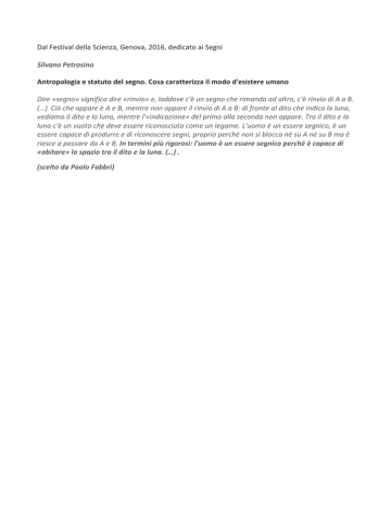 Dal Festival della Scienza, Genova, 2016, dedicato ai Segni Silvano Petrosino Antropologia e statuto del segno. Cosa caratterizza il modo d'esistere umano Dire «segno» significa dire «rinvio» e, laddove c'è un segno che rimanda ad altro, c'è rinvio di A a B. (…) Ciò che appare è A e B, mentre non appare il rinvio di A a B: di fronte al dito che indica la luna, vediamo il dito e la luna, mentre l'«indicazione» del primo alla seconda non appare. Tra il dito e la luna c'è un vuoto che deve essere riconosciuto come un legame. L'uomo è un essere segnico, è un essere capace di produrre e di riconoscere segni, proprio perché non si blocca né su A né su B ma è riesce a passare da A e B. In termini più rigorosi: l'uomo è un essere segnico perché è capace di «abitare» lo spazio tra il dito e la luna. (…) . (scelto da Paolo Fabbri)