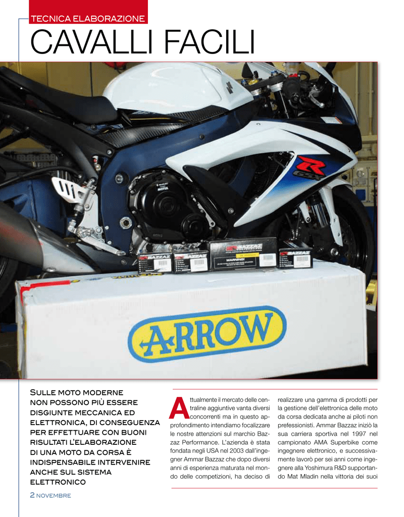 TECNICA Elaborazione Cavalli facili Sulle moto moderne non possono più essere disgiunte meccanica ed elettronica, di conseguenza per effettuare con buoni risultati l’elaborazione di una moto da corsa è indispensabile intervenire anche sul sistema elettronico 2 NOVEMBRE A ttualmente il mercato delle centraline aggiuntive vanta diversi concorrenti ma in questo approfondimento intendiamo focalizzare le nostre attenzioni sul marchio Bazzaz Performance. L’azienda è stata fondata negli USA nel 2003 dall’ingegner Ammar Bazzaz che dopo diversi anni di esperienza maturata nel mondo delle competizioni, ha deciso di realizzare una gamma di prodotti per la gestione dell’elettronica delle moto da corsa dedicata anche ai piloti non prefessionisti. Ammar Bazzaz iniziò la sua carriera sportiva nel 1997 nel campionato AMA Superbike come ingegnere elettronico, e successivamente lavorò per sei anni come ingegnere alla Yoshimura R&D supportando Mat Mladin nella vittoria dei suoi xxxxxxxxxxxxxx disposizione dalla Omnia Racing è il più completo in gamma e concentra in un unico modulo aggiuntivo (Z-Fi TC) la gestione del sistema d’iniezione, il cambio elettronico, il controllo di trazione e, con l’aggiunta del kit opzionale Z-AFM, anche l’automappatura. La centralina Z-Fi di base è un modulo aggiuntivo plug-and-play in grado di gestire gli otto iniettori, quindi i quattro principali e i quattro secondari, variando i tempi d’iniezione su tutto l’arco di funzionamento del motore. La centralina viene venduta con già caricate in memoria le mappe modificate per il sistema di scarico originale o per lo scarico libero (le mappe possono essere scaricate dal sito www.bazzaz.it). Le mappe sono sviluppate su un valore medio fissato sulle capacità della stragrande maggioranza dei piloti e ovviamente possono essere ritoccate in funzione delle specifiche necessità. Il kit opzionale Z-AFM permette di effettuare l’automappatura sfruttando la sonda Lambda. Il pacchetto comprende anche un cablaggio con connettori OEM per rendere semplice, veloce ed affidabile l’installazione. La Z-Fi TC presenta le stesse caratteristiche di base ma è in grado, come già anticipato, di gestire anche il controllo di trazione e il cambio elettronico senza l’aggiunta di ulteriori sensori oltre quelli già presenti sulla moto, l’unica eccezione è il sensore del cambio. Per chi fosse interessato è disponibile anche la versione Z-FI QS che a differenza della TC non gestisce il controllo di trazione ma solo il cambio. Per intervenire senza stravolgere completamente il sistema elettrico ed elettronico della moto, è previsto un cablaggio aggiuntivo attraverso il quale la centralina Bazzaz si inserisce tra la centralina di serie e i vari sensori, gli iniettori e le bobine d’accensione. In questo modo la centralina Bazzaz potrà leggere i parametri istan- Invece attraverso lo Z-BOMB elimineremo il limitatore di velocità in sesta marcia. Foto e Testo – Rocco Inserrato TECNICA elaborazione primi tre campionati AMA Superbike. Il centro di ricerca e sviluppo insieme al reparto di produzione della Bazzaz Performance sono situati a Chino in California, ma i loro prodotti per le corse sono esportati in tutto il mondo e in Italia sono distribuiti dalla Omnia Racing Special Parts di Portici (Na). Il modulo aggiuntivo Z-Fi oggetto di questo articolo, fa parte di una linea progettata per la gestione semplificata del motore ad iniezione grazie a software sviluppati per essere il più intuitivi possibili. Per le nostre prove abbiamo deciso di montare l’elettronica Bazzaz su una Suzuki GSX-R 750 equipaggiata con uno scarico completo Arrow (collettori in titanio con silenziatore appartenente alla linea Thunder), in questo modo si è potuto constatare sia il reale aumento di prestazioni che la semplicità d’uso e di montaggio dell’intero sistema. Il kit messoci a Il selettore delle mappe e il manettino per il controllo di trazione hanno uno specifico cablaggio. 3 NOVEMBRE I ragazzi della Omnia Racing per le nostre prove ci hanno fornito la centralina aggiuntiva Z-Fi TC con cui è possibile gestire, oltre ai tempi di iniezione, anche il cambio elettronico e il controllo di trazione. Il tutto è stato montato su una GSX-R 750 fornitaci gentilmente da Suzuki Italia. TECNICA Elaborazione Dopo una carrellata di dispositivi elettronici non poteva mancare anche un importante componente meccanico, si tratta di uno scarico Arrow con collettori in titanio e terminale Thunder. tanei di funzionamento del motore e modificare in percentuale i tempi di iniezione imposti dalla centralina OEM, che nel frattempo continuerà ad elaborare le sue strategie come se non fosse stata apportata nessuna modifica. Per il montaggio di tutto il sistema ci siamo recati a Monza presso l’officina dell’ex pilota Bruno Cirafici (www.cirafici.it), rivenditore autorizzato segnalatoci diretta- mente dai ragazzi della Omnia Racing. Appena arrivati presso l’officina di Bruno abbiamo eseguito un lancio al banco prova per misurare le prestazioni di base della nostra GSX-R 750, il dato di potenza massima alla ruota è di 124,2 CV a circa 12.650 giri/min con un picco di coppia pari a 7,44 kgm a 10.750 giri/ min. Dopodiché sono iniziate le operazioni di montaggio dell’intero kit Dopo aver eseguito la prova al banco in configurazione di serie, Bruno rimuove le carene e inizia lo smontaggio dello scarico originale. Fissati i leggeri collettori alla testa del motore, Bruno e Daniele procedono con il montaggio del resto dell’impianto di espulsione dei gas. Da notare che il tratto finale è predisposto per il montaggio delle sonda Lambda non originale. 4 NOVEMBRE CENTRALINA BAZZAZ nessione con le bobine. Nel cablaggio sono presenti anche i connettori per i sensori angolo di apertura valvola farfalla (TPS), numero di giri e marcia inserita. Le operazioni appena descritte consistono nello scollegare i connettori dai dispositivi di serie (iniettore, bobina o sen
