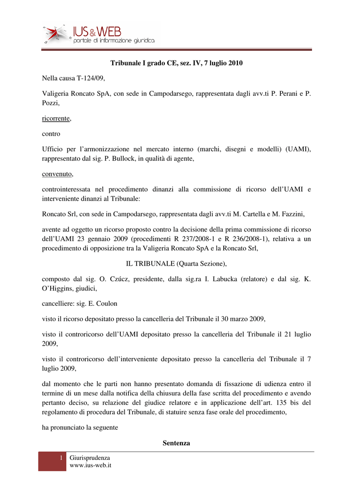 Tribunale I grado CE, sez. IV, 7 luglio 2010 Nella causa T-124/09, Valigeria Roncato SpA, con sede in Campodarsego, rappresentata dagli avv.ti P. Perani e P. Pozzi, ricorrente, contro Ufficio per l’armonizzazione nel mercato interno (marchi, disegni e modelli) (UAMI), rappresentato dal sig. P. Bullock, in qualità di agente, convenuto, controinteressata nel procedimento dinanzi alla commissione di ricorso dell’UAMI e interveniente dinanzi al Tribunale: Roncato Srl, con sede in Campodarsego, rappresentata dagli avv.ti M. Cartella e M. Fazzini, avente ad oggetto un ricorso proposto contro la decisione della prima commissione di ricorso dell’UAMI 23 gennaio 2009 (procedimenti R 237/2008-1 e R 236/2008-1), relativa a un procedimento di opposizione tra la Valigeria Roncato SpA e la Roncato Srl, IL TRIBUNALE (Quarta Sezione), composto dal sig. O. Czúcz, presidente, dalla sig.ra I. Labucka (relatore) e dal sig. K. O’Higgins, giudici, cancelliere: sig. E. Coulon visto il ricorso depositato presso la cancelleria del Tribunale il 30 marzo 2009, visto il controricorso dell’UAMI depositato presso la cancelleria del Tribunale il 21 luglio 2009, visto il controricorso dell’interveniente depositato presso la cancelleria del Tribunale il 7 luglio 2009, dal momento che le parti non hanno presentato domanda di fissazione di udienza entro il termine di un mese dalla notifica della chiusura della fase scritta del procedimento e avendo pertanto deciso, su relazione del giudice relatore e in applicazione dell’art. 135 bis del regolamento di procedura del Tribunale, di statuire senza fase orale del procedimento, ha pronunciato la seguente Sentenza 1 Giurisprudenza www.ius-web.it Tribunale I grado CE, sez. IV, 7 luglio 2010 Fatti 1 Il 4 ottobre 2005, l’interveniente, Roncato Srl, ha presentato una domanda di marchio comunitario all’Ufficio per l’armonizzazione nel mercato interno (marchi, disegni e modelli) (UAMI), ai sensi del regolamento (CE) del Consiglio 20 dicembre 1993, n. 40/94, sul marchio comunitario (GU 1994, L 11, pag. 1), come modificato [sostituito dal regolamento (CE) del Consiglio 26 febbraio 2009, n. 207, sul marchio comunitario (GU L 78, pag. 1)]. 2 Il marchio di cui è stata chiesta la registrazione è il segno denominativo CARLO RONCATO. 3 I prodotti per i quali è stata chiesta la registrazione sono compresi nelle classi 3, 9 e 14 dell’Accordo di Nizza 15 giugno 1957, relativo alla classificazione internazionale dei prodotti e dei servizi ai fini della registrazione dei marchi, come riveduto e modificato, e corrispondono, per ciascuna di tali classi, alla seguente descrizione: – classe 3: «Preparati per la sbianca e altre sostanze per il bucato; preparati per pulire, lucidare, sgrassare e abradere; saponi; profumeria, oli essenziali, cosmetici, lozioni per capelli; dentifrici»; – classe 9: «Apparecchi e strumenti scientifici, nautici, geodetici, fotografici, cinematografici, ottici, occhiali, apparecchi e strumenti di pesata, di misura, di segnalazione, di controllo (ispezione), di soccorso (salvataggio) e d’insegnamento; apparecchi e strumenti per la conduzione, commutazione, trasformazione, accumulazione, regolazione o controllo dell’elettricità; apparecchi per la registrazione, la trasmissione, la riproduzione del suono o delle immagini; supporti di registrazione magnetica, dischi acustici; distributori automatici e meccanismi per apparecchi di prepagamento; registratori di cassa, macchine calcolatrici, corredo per il trattamento dell’informazione e gli elaboratori elettronici; estintori»; – classe 14: «Metalli preziosi e loro leghe e prodotti in tali materie o placcati non compresi in altre classi; gioielleria, pietre preziose; orologeria e strumenti cronometrici». 4 La domanda è stata pubblicata nel Bollettino dei marchi comunitari n. 9/2006, del 27 febbraio 2006. 5 Il 26 maggio 2006, la ricorrente, Valigeria Roncato SpA, ha proposto opposizione ai sensi dell’art. 42 del regolamento n. 40/94 (divenuto art. 41 del regolamento n. 207/2009). 6 A sostegno della propria opposizione basata sull’art. 8, n. 5, del regolamento n. 40/94 (divenuto art. 8, n. 5, del regolamento n. 207/2009), la ricorrente faceva valere: – il marchio figurativo italiano, registrato il 14 novembre 1995 con il numero 662773 e rinnovato nel 2005, per «cuoio e sue imitazioni, articoli in queste materie non compresi in altre classi; bauli e valigie; valigie, valigette, borse; borsette; borsette da viaggio, bauli da viaggio, bauletti, valigie da aereo» compresi nella classe 18, rappresentato di seguito: 2 Giurisprudenza www.ius-web.it Tribunale I grado CE, sez. IV, 7 luglio 2010 – il marchio denominativo italiano RONCATO, registrato il 13 giugno 1989 e rinnovato nel 1997, per «valigie, bauli in qualsiasi materiale, forma e dimensioni, pelli, cuoio ed imitazioni del cuoio», compresi nella classe 18. 7 A sostegno della propria opposizione basata sull’art. 8, n. 4, del regolamento n. 40/94 (divenuto art. 8, n. 4, del regolamento n. 207/2009), la ricorrente invocava marchi non registrati che designano «orologi, portachiavi in metallo e in argento, portachiavi in metalli placcati, custodie portacomputer, adattatori, prese elettriche, mascherine antiluce per il viso, tappi per le orecchie» vale a dire: – il segno denominativo RONCATO; – il segno figurativo: – il segno figurativo: Image not found 8 Con decisione 29 novembre 2007, la divisione di opposizione ha accolto parzialmente l’opposizione e ha respinto la domanda di registrazione per «saponi; profumeria, oli essenziali, cosmetici, lozioni per capelli» compresi nella classe 3, nonché per tutti i prodotti della classe 14. Essa ha respinto l’opposizione per tutti gli altri prodotti. 9 La ricorrente e l’interveniente hanno proposto ricorso, rispettivamente il 25 gennaio ed il 28 gennaio 2008, contro la decisione della divisione di opposizione. 10 Con decisione 23 gennaio 2009 (in prosieguo: la «decision