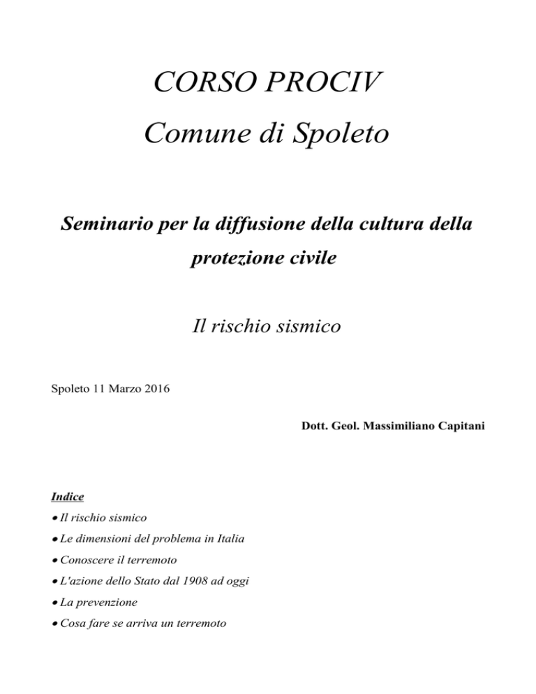 CORSO PROCIV Comune di Spoleto Seminario per la diffusione della cultura della protezione civile Il rischio sismico Spoleto 11 Marzo 2016 Dott. Geol. Massimiliano Capitani Indice Il rischio sismico Le dimensioni del problema in Italia Conoscere il terremoto L'azione dello Stato dal 1908 ad oggi La prevenzione Cosa fare se arriva un terremoto IL RISCHIO SISMICO A partire dalla definizione di aree prioritarie di intervento, oggi si stanno predisponendo nuovi studi per la riduzione del rischio sismico, al fine di sviluppare una più incisiva azione di prevenzione. Con il termine rischio sismico si indica una stima delle perdite complessive causate dai terremoti che potranno interessare in un determinato periodo una determinata area. Questa stima può essere espressa in diversi modi. Per esempio attraverso il costo dei danni subiti dagli edifici, il costo complessivo in termini economici e sociali subito dalla popolazione dell'intero paese, oppure attraverso il numero prevedibile di morti e feriti. Per sapere qual è il rischio STIMA DEI CROLLI IN 100 ANNI sismico in una certa zona è PERCENTUALE SUL TOTALE DELLE necessario conoscere: ABITAZIONI PER COMUNE La pericolosità sismica dell'area, ossia la probabilità che in un certo intervallo di tempo sia interessatala da forti terremoti che possono produrre danni; Quali opere costruite dall'uomo vi sono, qual è la loro importanza e vulnerabilità e quindi qual è la loro resistenza al terremoto; Quante persone vivono in quella zona e quindi qual è la sua esposizione al terremoto. Carta del rischio sismico. (Fonte: Dipartimento della Protezione Civile Gruppo di lavoro esperti sul rischio sismico, 1996) pericolosità x vulnerabilità x esposizione (terremoti) (edifici vulnerabili) (popolazione) rischio sismico Nelle aree con elevata pericolosità sismica ma disabilitate, il rischio sismico è nullo. Nelle aree densamente popolate e con molte costruzioni poco resistenti, vi può essere un rischio sismico elevato anche in presenza in bassa pericolosità. LE DIMENSIONI DEL PROBLEMA IN ITALIA Oltre 30.000 eventi sismici di media e forte intensità a partire dall'anno 1000 d.C. ad oggi, dei quali 2000 disastrosi . Oltre 120.000 vittime nell'ultimo secolo. Circa 100 miliardi di € di danni negli ultimi vent'anni. La sismicità è concentrata nella parte centro-meridionale della penisola ed in alcune aree settentrionali, proprio dove il patrimonio abitativo, per le sue caratteristiche costruttive e per lo stato di manutenzione, si presenta più fragile. Una parte consistente del patrimonio storico ed artistico del paese è fortemente esposta agli effetti del terremoto. L'azione di prevenzione condotta sino ad oggi ha dato buoni risultati, ma non è stata sufficiente a scongiurare un alto numero di morti e di danni anche nei più recenti terremoti. Belice 1968: 300 vittime Friuli 1976: 970 vittime Irpinia 1980: 2750 vittime In Italia il rapporto tra l'intensità dei terremoti ed il numero delle vittime è da considerare troppo elevato in confronto ad altri paesi e comunque non accettabile per una nazione industrializzata, scientificamente e tecnologicamente avanzata, culturalmente e socialmente evoluta. Oggi non si è ancora in grado di prevedere il tempo ed il luogo in cui avverrà un terremoto, pertanto tutto è affidato alla prevenzione degli effetti attraverso la conoscenza della sismicità che in passato ha interessato il nostro paese. CONOSCERE IL TERREMOTO Il terremoto è un fenomeno naturale non è prevedibile ha breve durata (meno di un minuto) si ripete di solito nelle stesse aree In Italia Nella carta a fianco sono rappresentati gli epicentri dei terremoti che negli ultimi mille anni hanno superato la soglia del danno grave (l'intensità uguale o maggiore all'VII grado della scala Mercalli ovvero circa 5,5 della scala Richter). I terremoti più forti nell'ultimo secolo hanno interessato soprattutto le regioni appenniniche, la Calabria, la Sicilia ed il Friuli. Come si misura intensità (scala Mercalli) - il terremoto viene misurato attraverso gli effetti sull'uomo, sulle costruzioni e sull'ambiente. Tali effetti sono suddivisi in livelli: I, II, III, … fino a XII, secondo i gradi della scala introdotta all'inizio del XX secolo dal sismologo Giuseppe Mercalli magnitudo (scala Richter) - si misura attraverso le registrazioni degli strumenti (sismogrammi) ed esprime l'energia sprigionata da un terremoto. La scala fu introdotta negli anni '30 dal sismologo americano Charles Richter. Le due scale utilizzano modalità diverse di misurazione e non sono direttamente confrontabili (sotto, un confronto approssimativo). L'AZIONE DELLO STATO DAL 1908 AD OGGI Dopo il disastroso evento sismico di Reggio Calabria e Messina del 1908, che causò oltre 80.000 morti, lo Stato italiano ha avviato iniziative per la riduzione dei danni del terremoto attraverso l'azione congiunta della classificazione del territorio e di speciali regole da rispettare per le costruzioni. Classificazione sismica del territorio Sulla base della frequenza ed intensità dei terremoti del passato, una parte del territorio nazionale è stata classificata in tre categorie sismiche, alle quali corrispondono livelli crescenti di protezione richiesti per le costruzioni (livello massimo per la 1^ categoria). La normativa sismica dell’Ordinanza P.C.M. n° 3274 del 20.03.2003 e s.i e m. aveva definito i criteri per la formazione e l’aggiornamento degli elenchi delle zone sismiche da parte delle Regioni, che la Giunta Regionale Umbra ha recepito emanando l’atto n° 852 del 18.06.2003 “Approvazione classificazione sismica del territorio regionale dell’Umbria” e la successiva D.G.R. n° 1111 del 18 Settembre 2012 “Aggiornamento della classificazione sismica del territorio regionale dell’Umbria”, inserendo il Comune di Spoleto nella zona sismica 1. Il D.M. 14 Gennaio 2008 “Nuove Norme Tecniche per le costruzioni”, definisce le nuove norme tecniche per il progetto, la valut