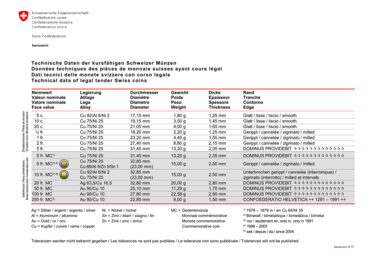 Technische Daten der kursfähigen Schw eizer Münzen Données techniques des pièces de monnaie suisses ayant cours légal Dati tecnici delle monete svizzere con corso legale Technical data of legal tender Sw iss coins Nennwert Valeur nominale Valore nominale Face value 5 c. 10 c. 20 c. ½ fr. 1 fr. 2 fr. 5 fr. 5 fr. MC1) 5 fr. MC2) 4) 10 fr. MC2) 5) 20 fr. MC 50 fr. MC 100 fr. MC 250 fr. MC3) Legierung Alliage Lega Alloy Durchmesser Diamètre Diametro Diameter Gewicht Poids Peso Weight Dicke Epaisseur Spessore Thickness Rand Tranche Contorno Edge Cu 92/Al 6/Ni 2 Cu 75/Ni 25 Cu 75/Ni 25 Cu 75/Ni 25 Cu 75/Ni 25 Cu 75/Ni 25 Cu 75/Ni 25 17,15 mm 19,15 mm 21,05 mm 18,20 mm 23,20 mm 27,40 mm 31,45 mm 1,80 g 3,00 g 4,00 g 2,20 g 4,40 g 8,80 g 13,20 g 1,25 mm 1,45 mm 1,65 mm 1,25 mm 1,55 mm 2,15 mm 2,35 mm Glatt / lisse / liscio / smooth Glatt / lisse / liscio / smooth Glatt / lisse / liscio / smooth Gerippt / cannelée / zigrinato / milled Gerippt / cannelée / zigrinato / milled Gerippt / cannelée / zigrinato / milled DOMINUS PROVIDEBIT Cu 75/Ni 25 Cu 75/Ni 25 Cu 89/Al 5/Zn 5/Sn 1 Cu 92/Al 6/Ni 2 Cu 75/Ni 25 Ag 83,5/Cu 16,5 Au 90/Cu 10 Au 90/Cu 10 Au 90/Cu 10 31,45 mm 32,85 mm (23,00 mm) 32,85 mm (23,00 mm) 32,80 mm 25,10 mm 27,80 mm 22,85 mm 13,20 g 2,35 mm DOMINUS PROVIDEBIT 15,00 g 2,50 mm Gerippt / cannelée / zigrinato / milled 15,00 g 2,50 mm 20,00 g 11,29 g 22,58 g 8,00 g 2,80 mm 1,70 mm 2,60 mm 1,50 mm Ag = Silber / argent / argento / silver Al = Aluminium / alluminio Au = Gold / or / oro Cu = Kupfer / cuivre / rame / copper Ni = Nickel / nichel Sn = Zinn / étain / stagno / tin Zn = Zink / zinc / zinco MC = Gedenkmünze Monnaie commémorative Moneta commemorativa Commemorative coin Unterbrochen gerippt / cannelée (interrompue) / zigrinato (interrotto) / milled at intervals DOMINUS PROVIDEBIT DOMINUS PROVIDEBIT DOMINUS PROVIDEBIT CONFOEDERATIO HELVETICA ++ 1291 – 1991 ++ – 1979 in / en Cu 65/Ni 35 / bimétallique / bimetallica / bimetal 3) nur / seulement en, solo in, only in 1991 4) 1999 – 2003 5) seit / depuis / da / since 2004 1) 1976 2) Bimetall Toleranzen werden nicht bekannt gegeben / Les tolérances ne sont pas publiées / Le tolleranze non sono pubblicate / Tolerances will not be published Swissmint 2/17