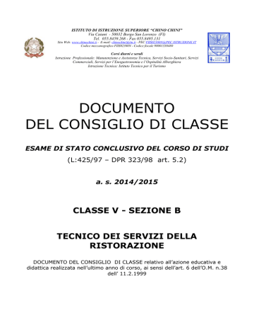 ISTITUTO DI ISTRUZIONE SUPERIORE “CHINO CHINI” Via Caiani - 50032 Borgo San Lorenzo (FI) Tel. 055.8459.268 - Fax 055.8495.131 Sito Web: www.chinochini.it - E-mail: [email protected] - PEC [email protected] Codice meccanografico FIIS02300N - Codice fiscale 90001330480 Corsi diurni e serali Istruzione Professionale: Manutenzione e Assistenza Tecnica, Servizi Socio-Sanitari, Servizi Commerciali, Servizi per l’Enogastronomia e l’Ospitalità Alberghiera Istruzione Tecnica: Istituto Tecnico per il Turismo DOCUMENTO DEL CONSIGLIO DI CLASSE ESAME DI STATO CONCLUSIVO DEL CORSO DI STUDI (L:425/97 – DPR 323/98 art. 5.2) a. s. 2014/2015 CLASSE V - SEZIONE B TECNICO DEI SERVIZI DELLA RISTORAZIONE DOCUMENTO DEL CONSIGLIO DI CLASSE relativo all’azione educativa e didattica realizzata nell’ultimo anno di corso, ai sensi dell’art. 6 dell’O.M. n.38 dell’ 11.2.1999 ISTITUTO DI ISTRUZIONE SUPERIORE “CHINO CHINI” Via Caiani,68 - 50032 Borgo San Lorenzo (FI) Tel. 055.8459.268 - Fax 055.8495.131 Sito Web: www.chinochini.it - E-mail: [email protected] - PEC [email protected] Codice meccanografico FIIS02300N - Codice fiscale 90001330480 Corsi diurni e serali Istruzione Professionale: Manutenzione e Assistenza Tecnica, Servizi Socio-Sanitari, Servizi Commerciali, Servizi per l’Enogastronomia e l’Ospitalità Alberghiera Istruzione Tecnica: Istituto Tecnico per il Turismo DOCUMENTO DEL CONSIGLIO DI CLASSE PER GLI ESAMI CONCLUSIVI DEL CORSO DI STUDI Anno scolastico 2014/2015 CLASSE 5BR – Tecnico dei servizi della Ristorazione Discipline Docenti Firma 1 Italiano Maria Pia Suma 2 Storia Maria Pia Suma 3 Matematica Daniela Morandi 4 1° Lingua Straniera (Inglese) Susanna Innocenti 5 2° Lingua Straniera (Francese) Roberta Ricci 6 Economia e gestione delle aziende ristorative Salvatore Iovene 7 Alimenti e alimentazione Lucia Biancalani 8 Lab. di org. e gestione dei servizi ristorativi Michele Occhibove 9 Lab. Sala e vendita Nicolas Cioni 10 Educazione fisica Paolo Baldini 11 Religione Federico Bernacchi 12 Sostegno Serenella Bartoli Borgo San Lorenzo, 15 Maggio 2015 Il Dirigente Scolastico Prof. Bernardo Draghi Documento del Consiglio di classe della 5 BR a. s. 2014/2015 Pagina 1 A. PARTE GENERALE 1. Descrizione dell’Istituto 2. Finalità generali e obiettivi strategici dell’opera educativa dell’Istituto 3. Profilo professionale del Tecnico dei Servizi di Ristorazione 4. Obiettivi Specifici del Tecnico dei Servizi di Ristorazione 5. Presentazione della classe 6. Percorso formativo 7. Attività didattiche inter e pluridisciplinari – Prove pluridisciplinari 8. Attività di orientamento 9. Attività di recupero, sostegno, potenziamento 10. Caratteristiche del progetto di Alternanza Scuola – lavoro (ex Terza Area) 11. Criteri generali per la valutazione 12. Indicatori per la valutazione delle prove orali e scritte, disciplinari e pluridisciplinari 13. Strumenti di valutazione adottati 14. Criteri per l’ammissione all’Esame di stato 15. Criteri per l’attribuzione credito scolastico 16. Criteri per l’attribuzione del punto della banda di oscillazione del credito scolastico, come da tabella A del Regolamento dell’Esame di Stato 17. Indicatori per l’attribuzione del credito scolastico 18. Criteri per il riconoscimento dei crediti formativi B. PARTE SPECIFICA DISCIPLINARE 1. Italiano 2. Storia 3. Matematica 4. Inglese 5. Francese 6. Economia e gestione delle aziende ristorative 7. Alimenti e Alimentazione 8. Lab. Sala e vendita 9. Lab. di org. e gestione dei servizi ristorativi 10. Educazione fisica 11. Religione pag.3 pag.4 pag.6 pag.6 pag.7 pag.10 pag.12 pag.12 pag.13 pag.13 pag.13 pag.14 pag.15 pag.16 pag.17 pag.17 pag.17 pag.19 pag.18 pag.22 pag.24 pag.28 pag.32 pag.35 pag.38 pag.42 pag.45 pag.48 pag.50 C. ATTI ALLEGATI Simulazioni effettuate, griglie di valutazione, breve relazione progetto di alternanza scuola lavoro (ex terza area). Documento del Consiglio di classe della 5 BR a. s. 2014/2015 Pagina 2 PARTE GENERALE 1. DESCRIZIONE DELL’ISTITUTO L’istituto di Istruzione Superiore “Chino Chini” di Borgo San Lorenzo è nato nel 1984 con il distacco dall’IPSIA “Cellini” di Firenze della sede coordinata di Borgo San Lorenzo e Pontassieve. Ha conservato la denominazione di IPSIA fino all’anno scolastico 2010/2011, dopodiché si è trasformato in un Istituto di Istruzione Superiore per la nascita dell’Istituto Tecnico per il Turismo. Il “Chino Chini” ha assunto nel corso degli anni la caratteristica di Istituto polivalente che affianca ai tradizionali corsi diurni ad indirizzo Manutenzione ed Assistenza Tecnica per Operatore Elettrico e Meccanico anche corsi diurni dei Servizi Commerciali e Aziendali e dei percorsi professionali e tecnici del Turismo, dei Servizi per l’Enogastronomia e l’Ospitalità alberghiera e dei Servizi Sociali e Socio – sanitari e corsi serali per adulti dell’indirizzo dei Servizi Sociali, offrendo quindi agli studenti e alla popolazione dell’area mugellana un ampio ventaglio di possibilità. La dirigenza e gli uffici amministrativi sono ubicati presso la nuova sede di via Caiani, 68 di Borgo San Lorenzo, dove si trovano le aule del Tecnico per il Turismo, dei Servizi Socio – sanitari e sociali, dei Servizi Commerciali ed Aziendali e del professionale Turistico e del biennio post – qualifica della Ristorazione. Nella sede di via Caiani, oltre al plesso principale, sono dislocati vari plessi: un plesso che accoglie le aule del triennio dell’indirizzo Servizi per l’Enogastronomia e l’Ospitalità alberghiera; un altro plesso è occupato dalle cucine e dalle sale per la ristorazione; un ulteriore plesso è rappresentato dai prefabbricati che accolgono le aule dell’indirizzo Manutenzione ed Assistenza Tecnica per Operatore Elettrico e Meccanico e dei corsi serali per adulti dell’indirizzo Servizi Sociali; l’ultimo plesso è rappresentato dalle officine per le opzioni Meccanico ed Elettrico. L’indirizzo per Oper